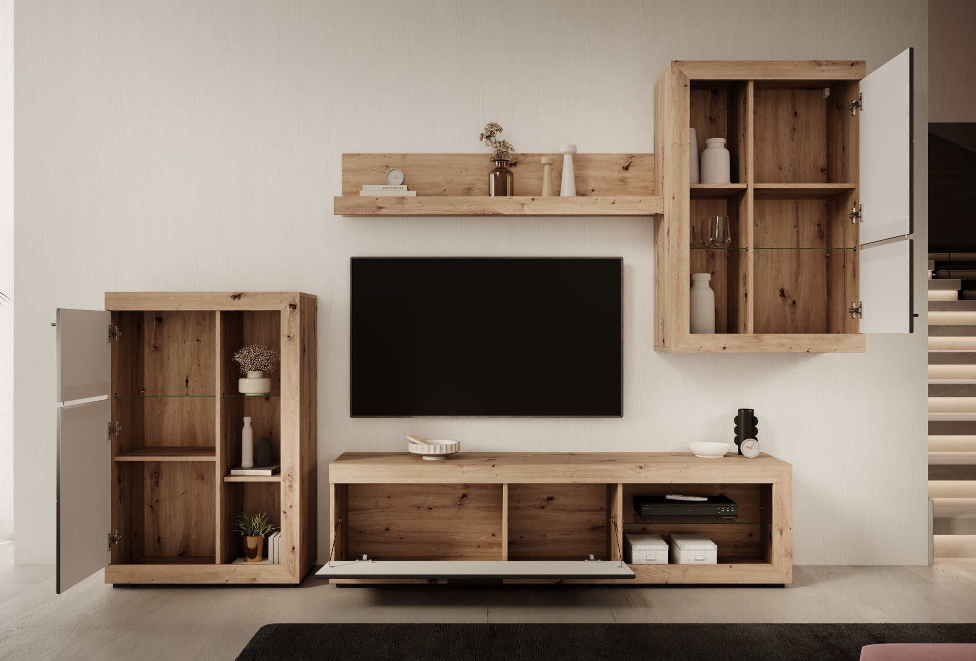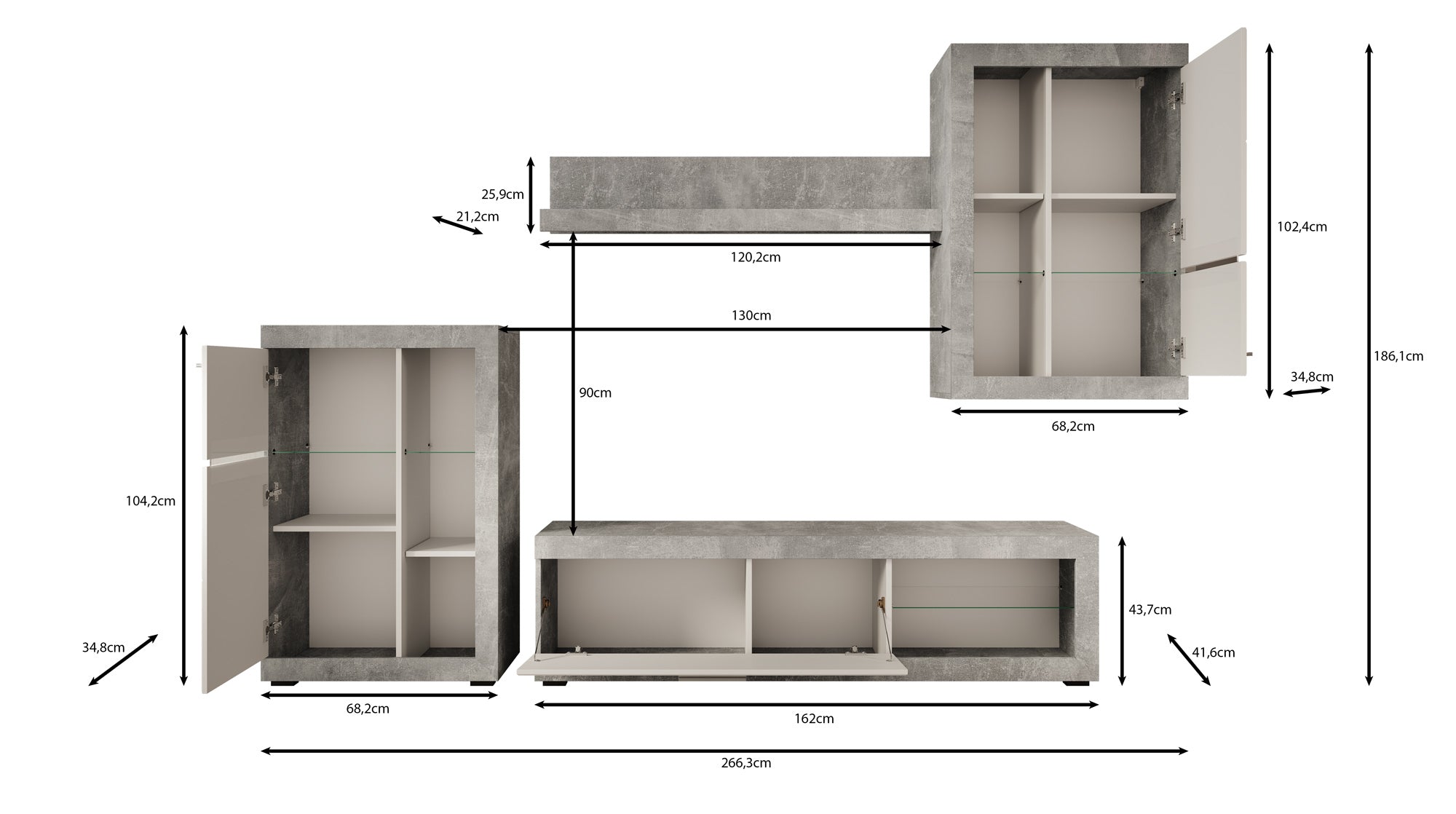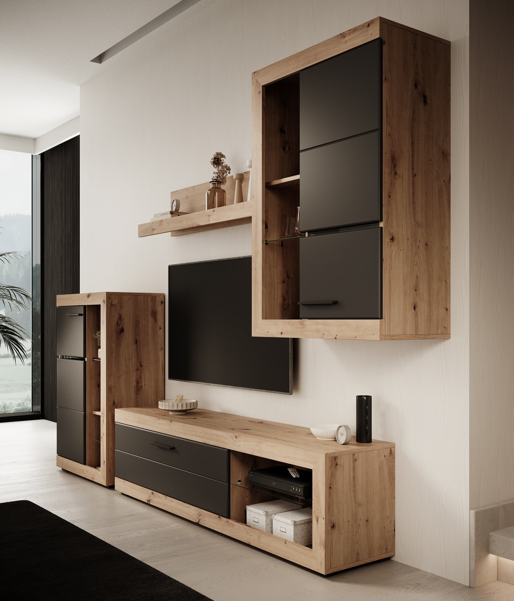 - TV-meubel, 2 opbergkasten en 1 wandplank