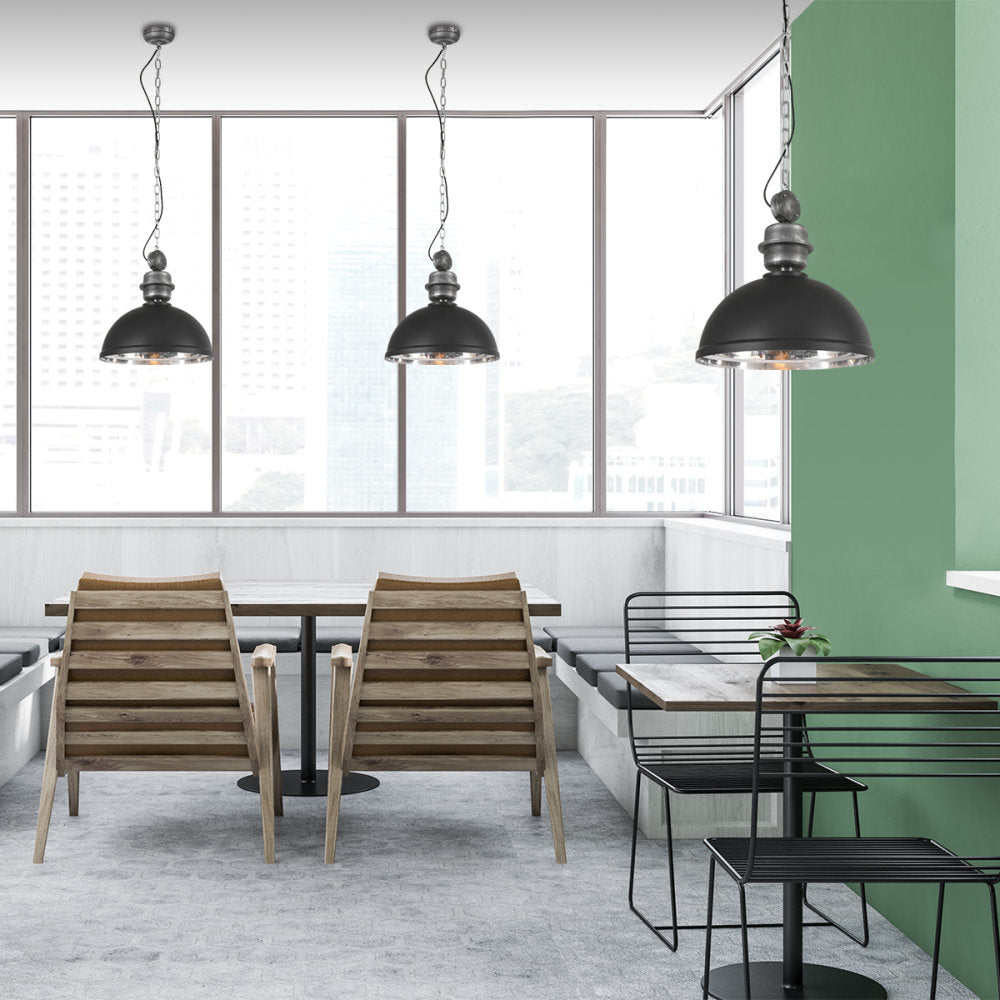 Stoere hanglamp voorzien van een ketting en een robuuste kap. De kap heeft een doorsnede van 40 cm en de kleur is zwart. De totale hoogte is maximaal 150 cm.