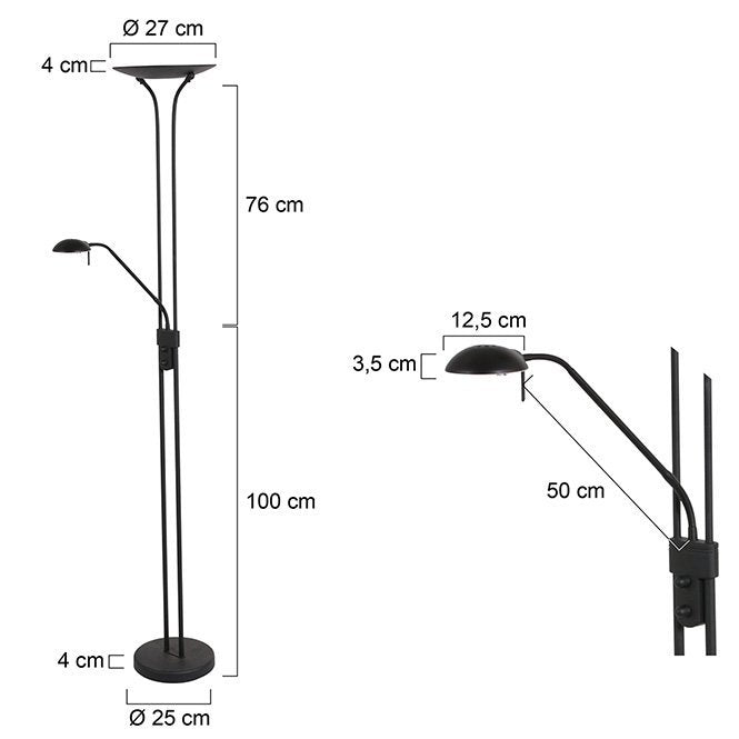 Deze Biron vloerlamp heeft een dubbele draaidimmer. De uplight heeft een vaste LED module 23 watt met kleurtemperatuur van 2700 Kelvin en een licht opbrengst van 2000 Lumen. De leesarm heeft ook een vaste LED module, deze is 8 watt en heeft een kleurtemperatuur van 2700 Kelvin en een lichtopbrengst van 650 Lumen. De hoogte van deze lamp is maar liefst 180 centimeter en wordt geleverd met snoer van 200 centimeter.