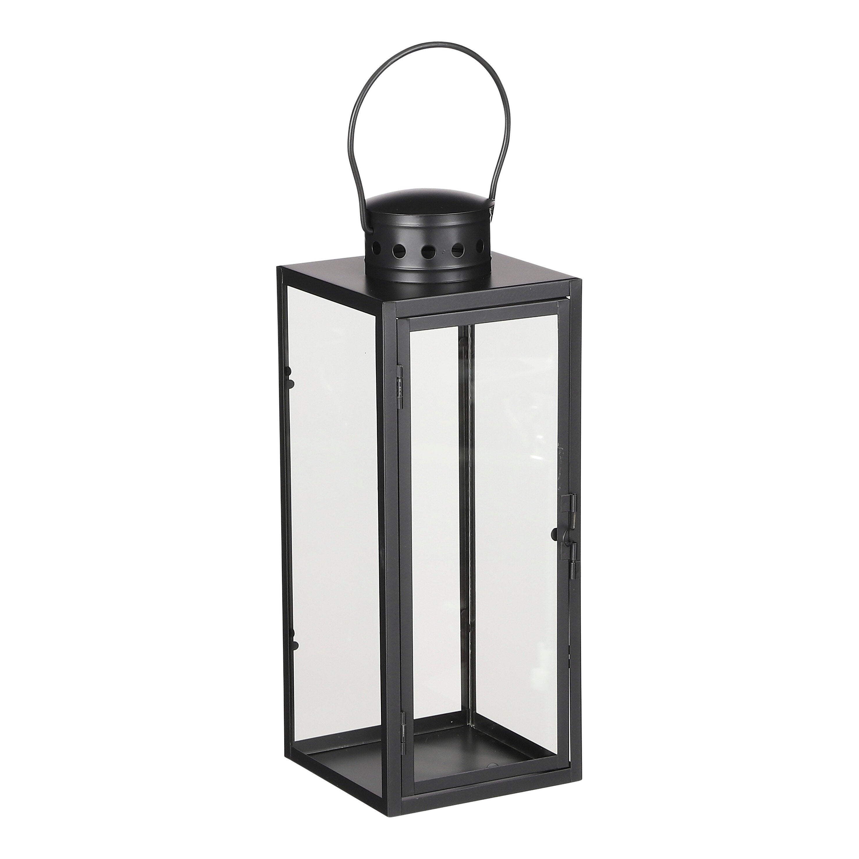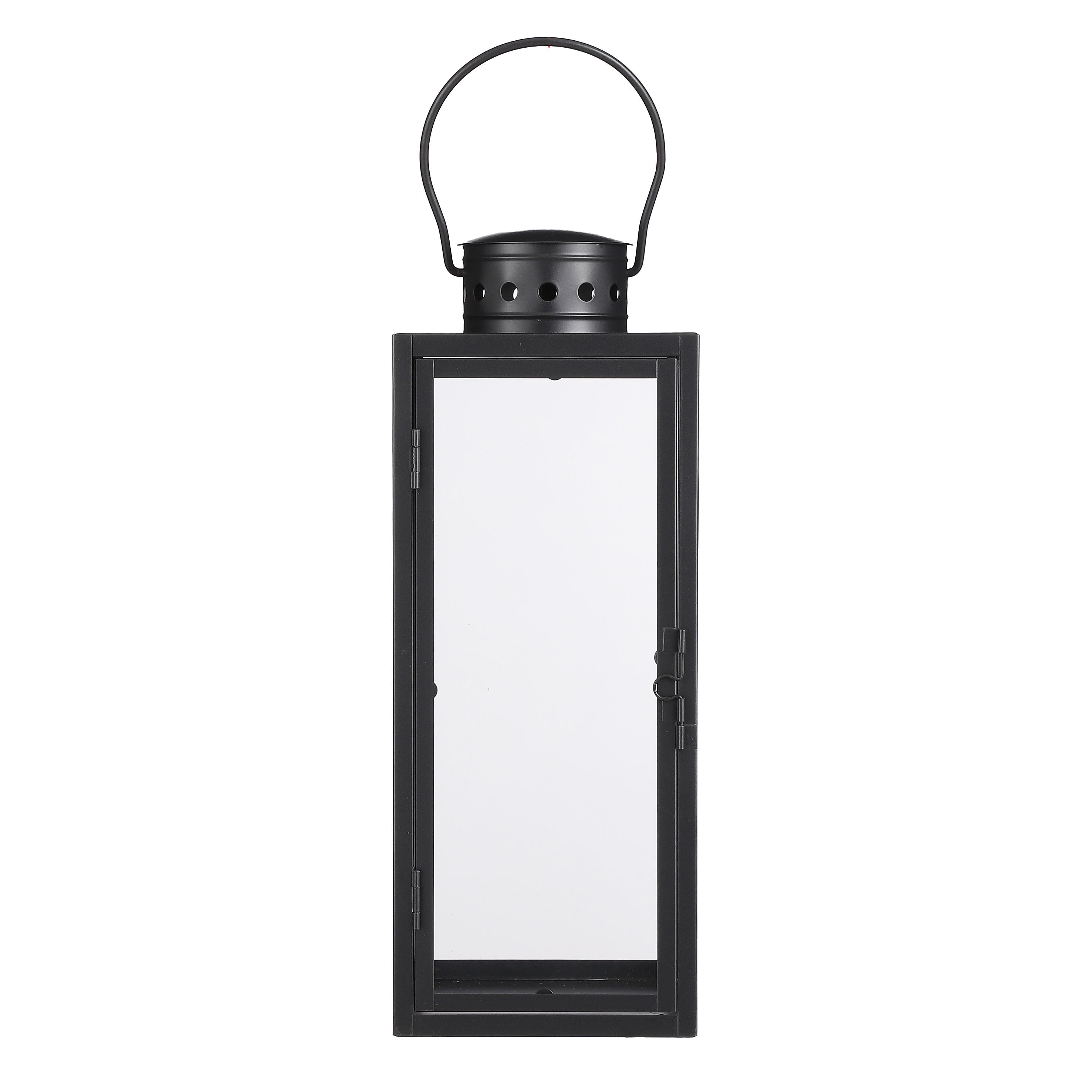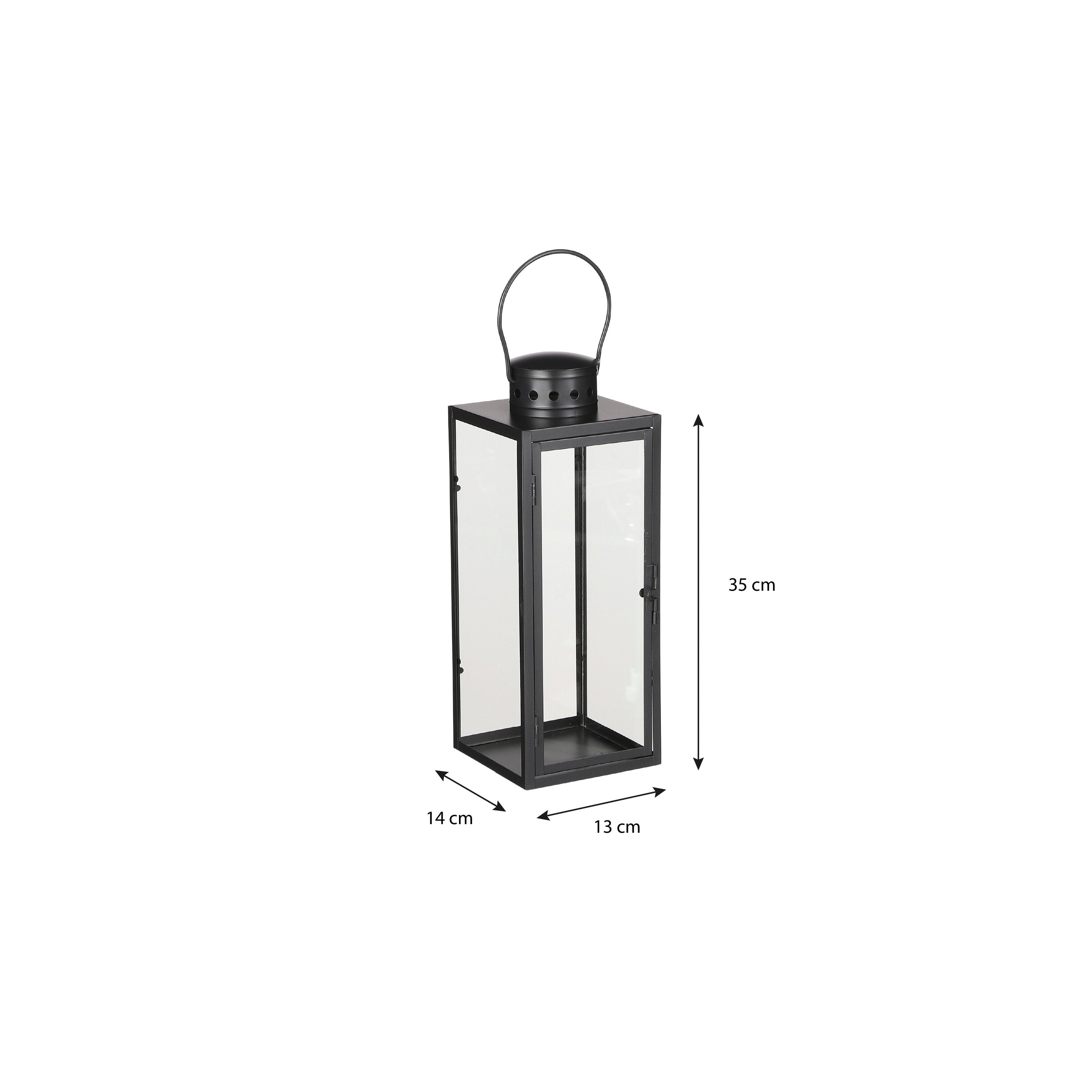 Moderne lantaarn van zwart metaal met veel glas. Het windlicht heeft een afmeting van L13,5 x B13 x H34,5 cm.