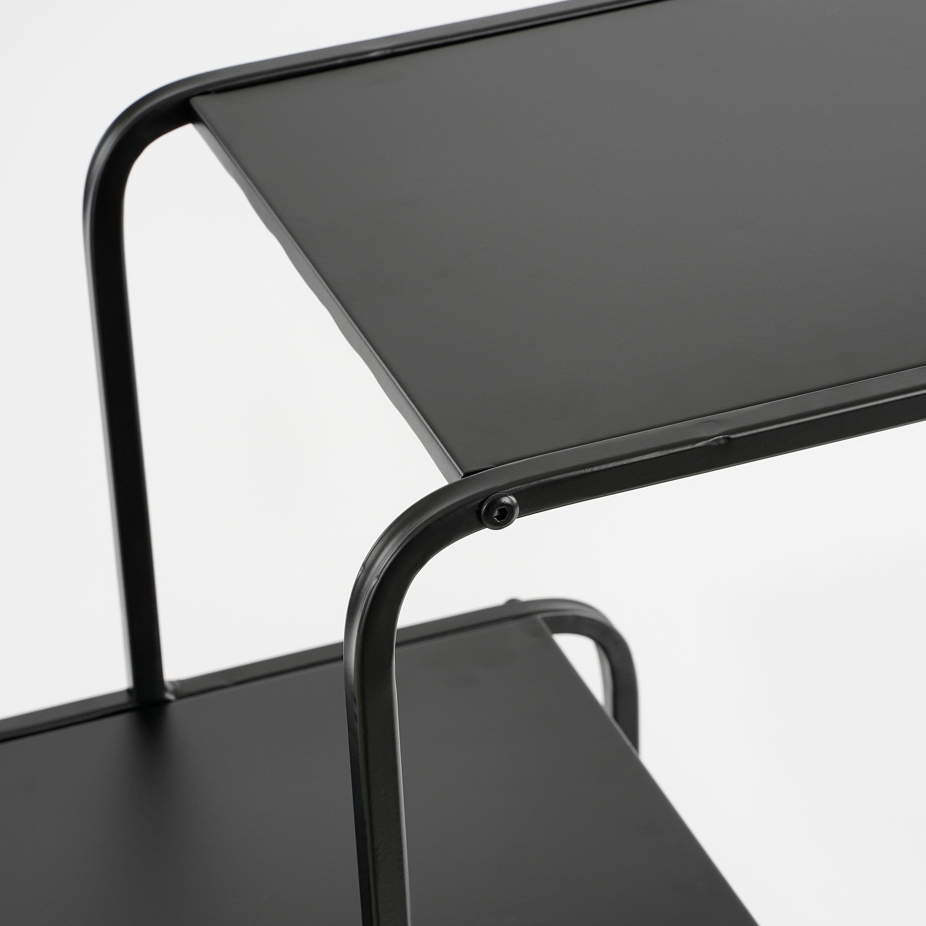Wandkast van metaal in een zwarte kleur. De moderne kast heeft drie tafelbladen en is 70 cm lang, 30 cm breed en 76 cm hoog.