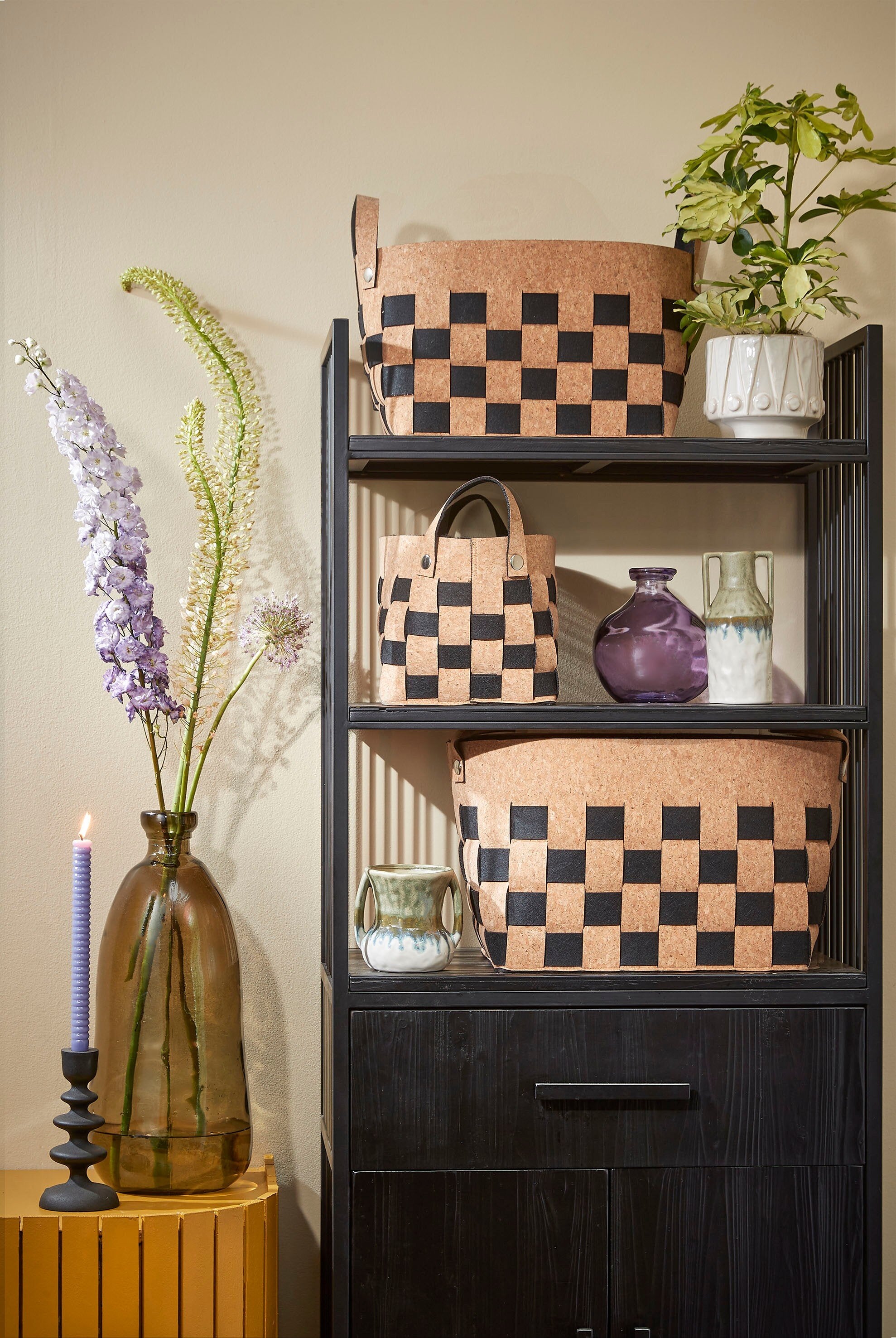 Set van 3 opbergmanden in een natuurlijke, bruine kleur met zwart motief. De manden set is gemaakt van kurk en hebben een afmeting van L32 x B22 x H22 cm, L36 x B26 x H26 cm en L40 x B30 x H30 cm.