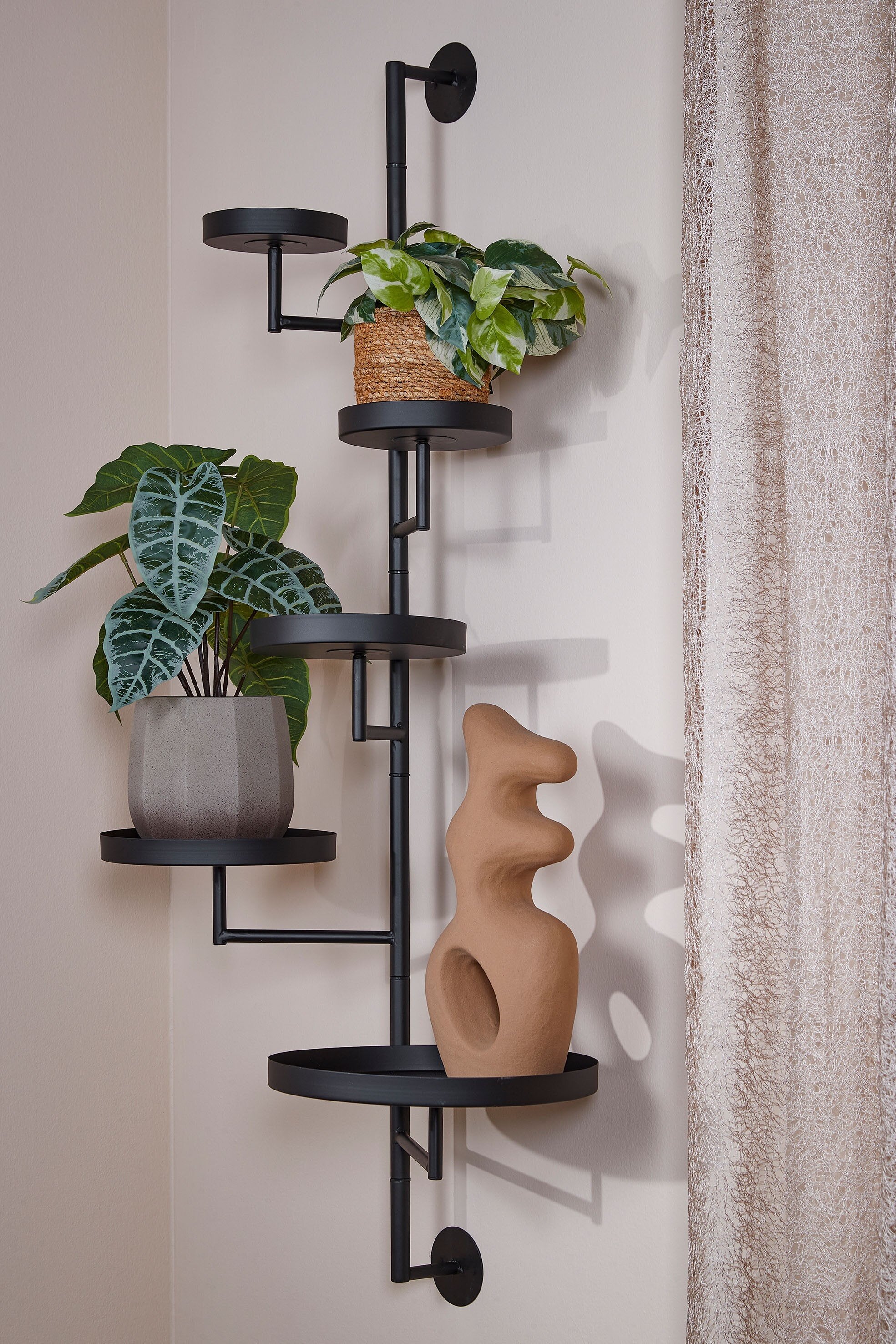 Met dit Perry wandrek van Mica Decorations presenteer je jouw favoriete decoraties op een unieke manier. Geen rechte planken, maar ronde plateaus die direct de aandacht trekken. Leuk voor wat planten, hang hem in de keuken met wat servies erop, of maak er een sfeervol hoekje van met verschillende theelichthouders. Door het zwarte metaal krijgt het rek een stoere touch dat past in elk interieur. Wat zet jij erop? De afmetingen zijn L36 x B30 x H120 cm.