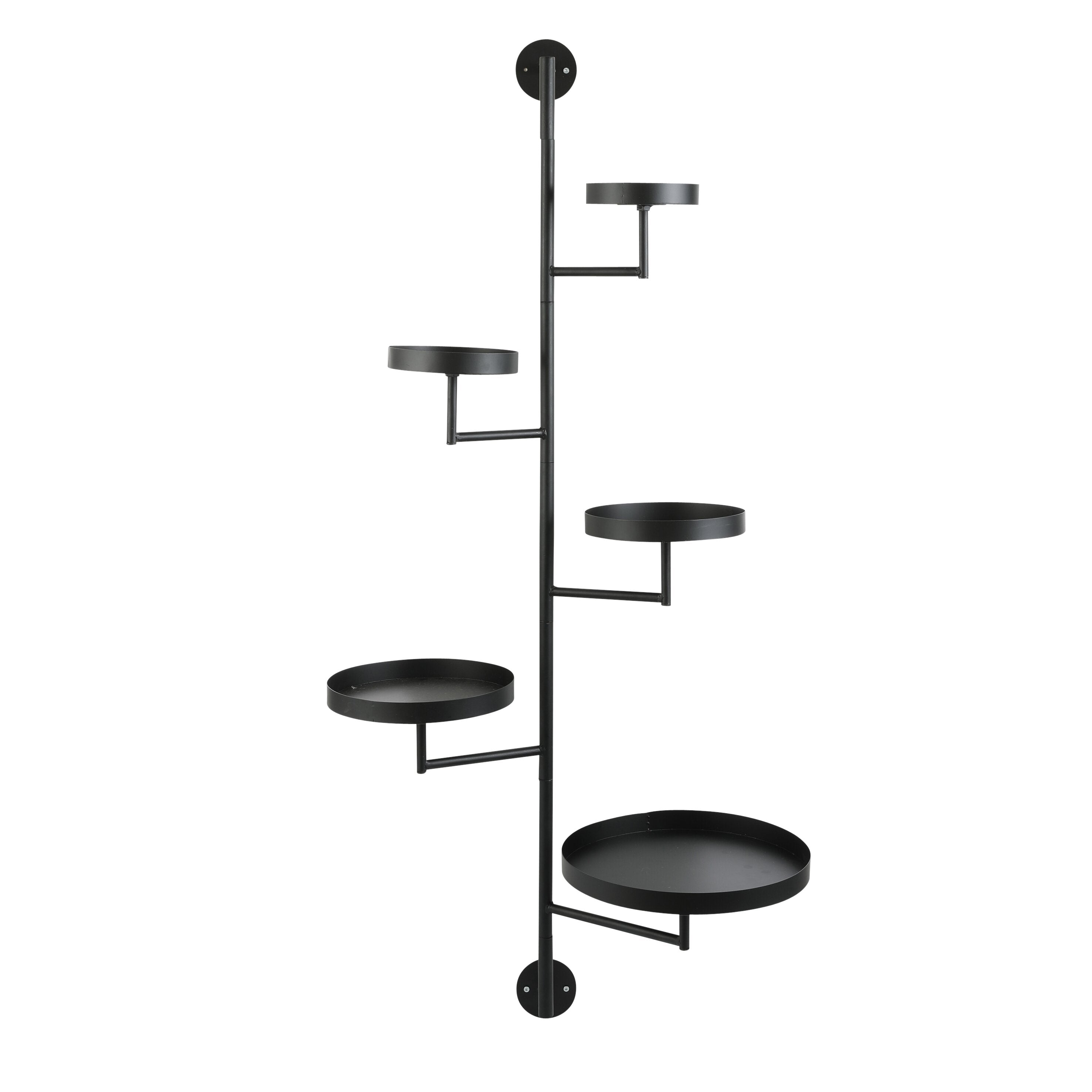 Wandrek met vijf ronde plateaus. Het rek is gemaakt van zwart metaal en heeft een afmeting van L36 x B30 x H120 cm.