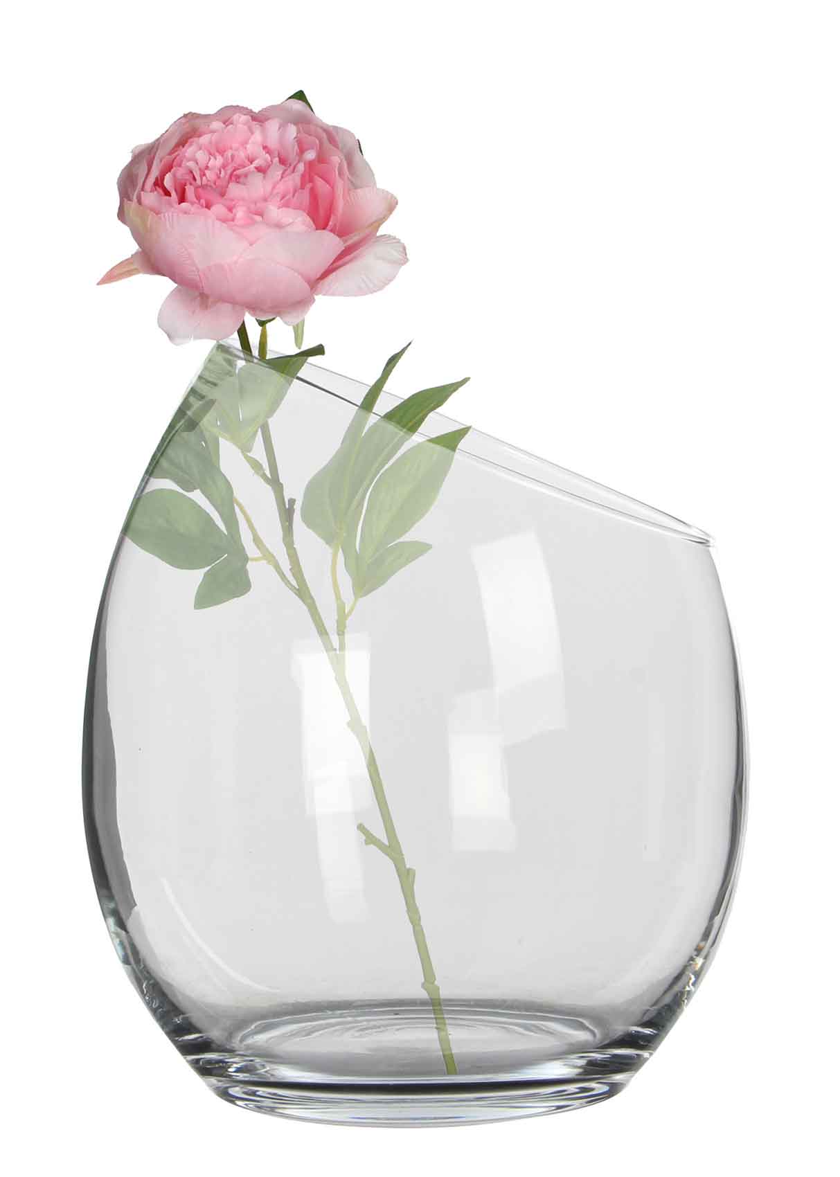 Vaas met schuine opening van kristalhelder transparant glas, handgemaakt. Met de bloemen/siervaas uit de serie Kathi, haal je een prachtige toevoeging voor uw interieur in huis waar je je eigen draai aan kan geven. Decoreer de schaal bijvoorbeeld met steentjes, zand, bloemblaadjes of drijfkaarsen. Tevens te gebruiken als terrarium, plantenbak of fruitschaal. Afmetingen: Diameter 28 cm x Hoogte 32 cm.