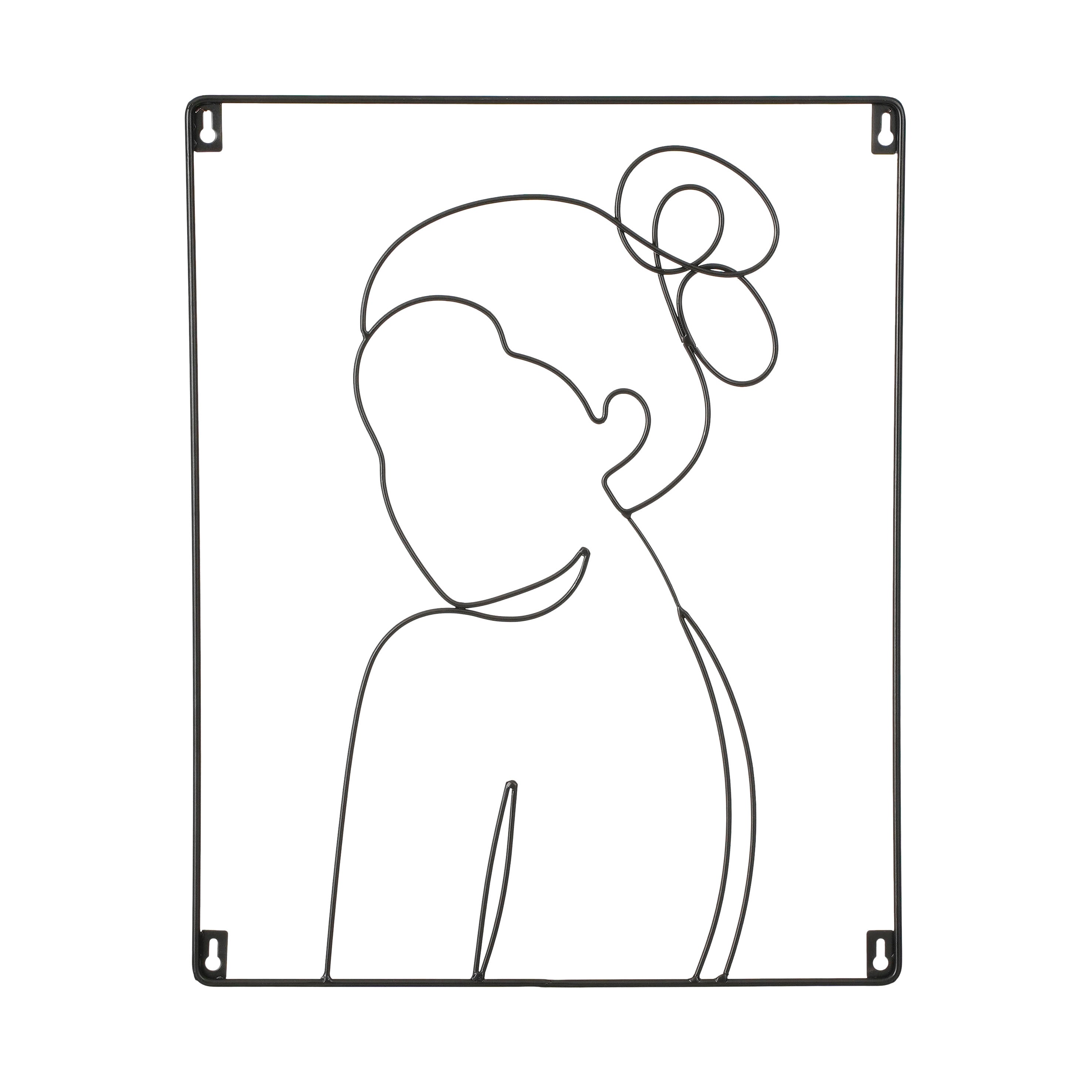 Muurdecoratie in de vorm van een vrouw. De abstracte muurdecoratie is gemaakt van zwart metaal en is 40 cm lang en 50 cm hoog.