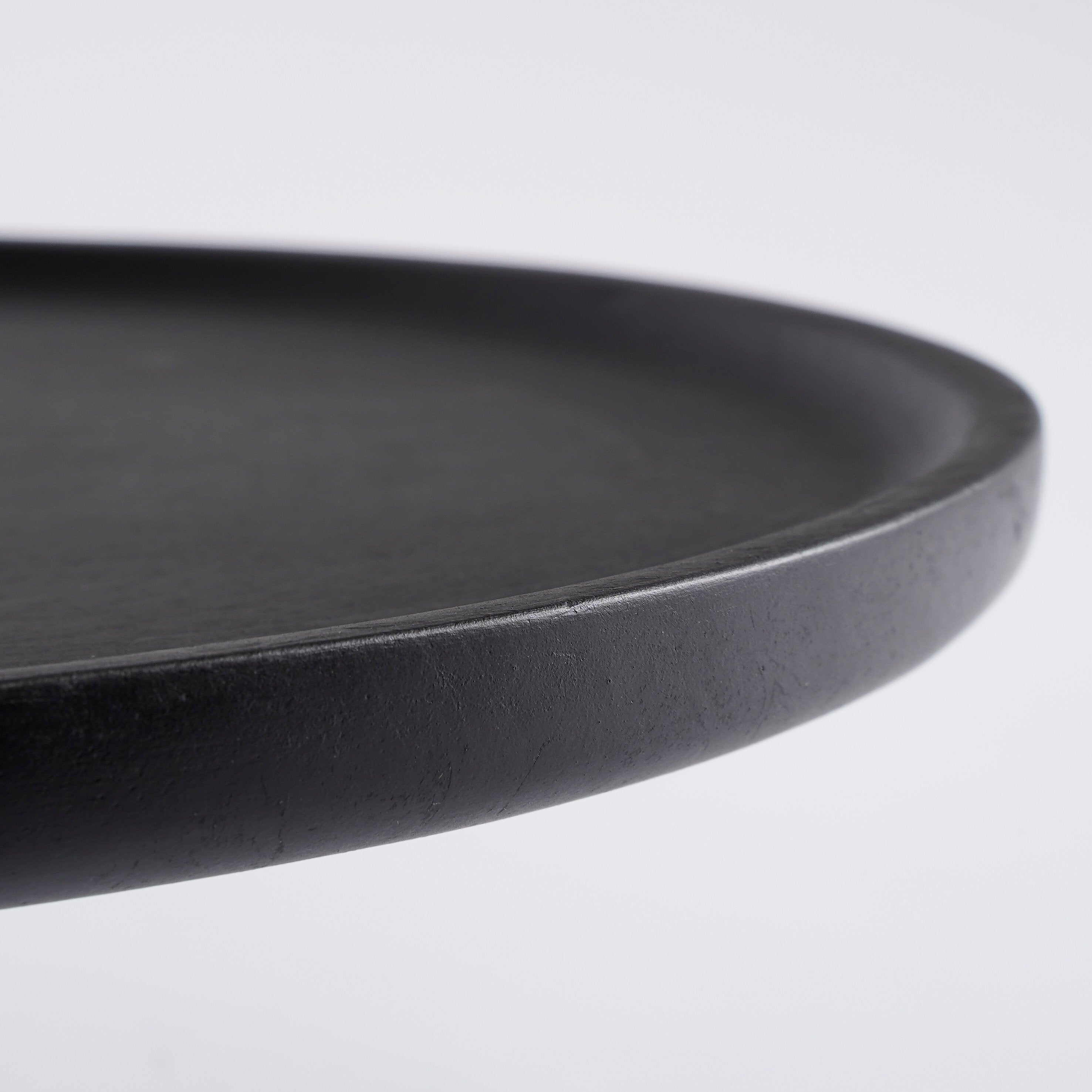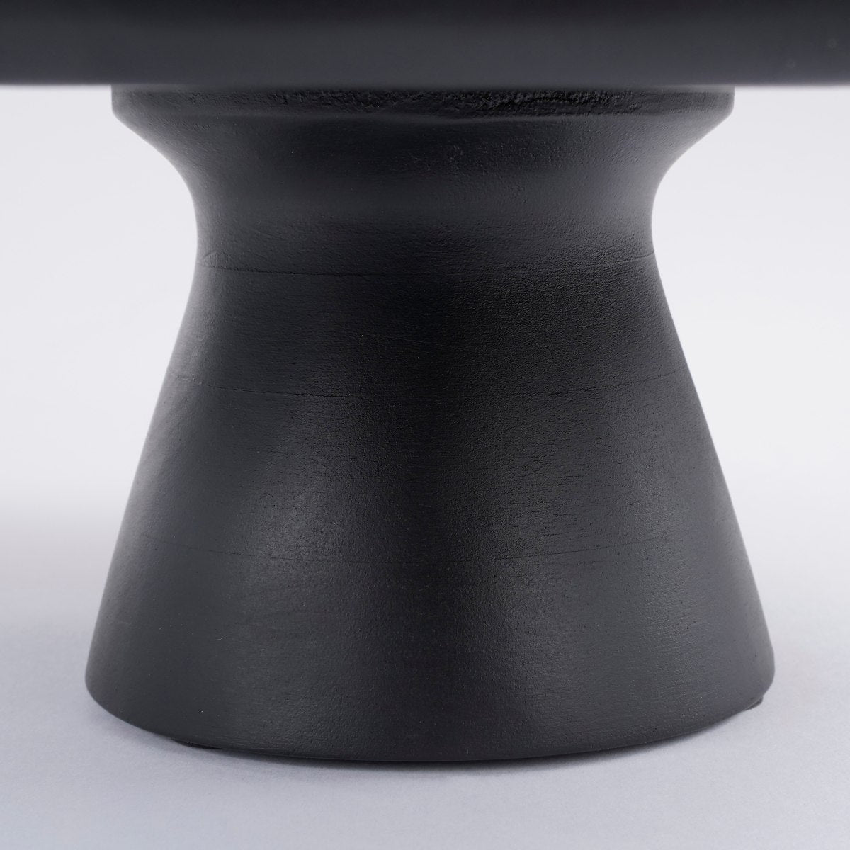 Taartplateau van mangohout in een zwarte kleur. De houten taartplateau heeft een afmeting van H10 x Ø30 cm.