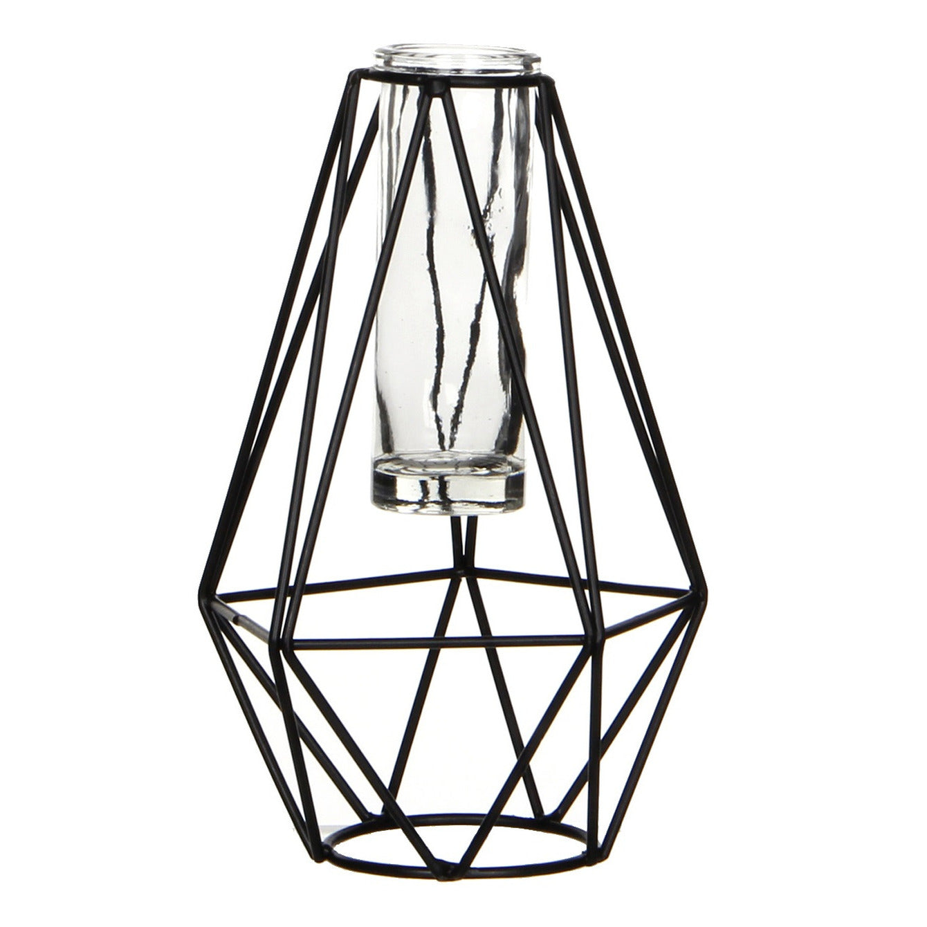 Zwart metalen diamant draad vaasje met glas 11 x 10 x 17 cm. Draadstaal vaasje, geschikt om een een enkele bloem/kunstbloem/steelbloem in te plaatsen. Materiaal: metaal met transparant decoratief glas.