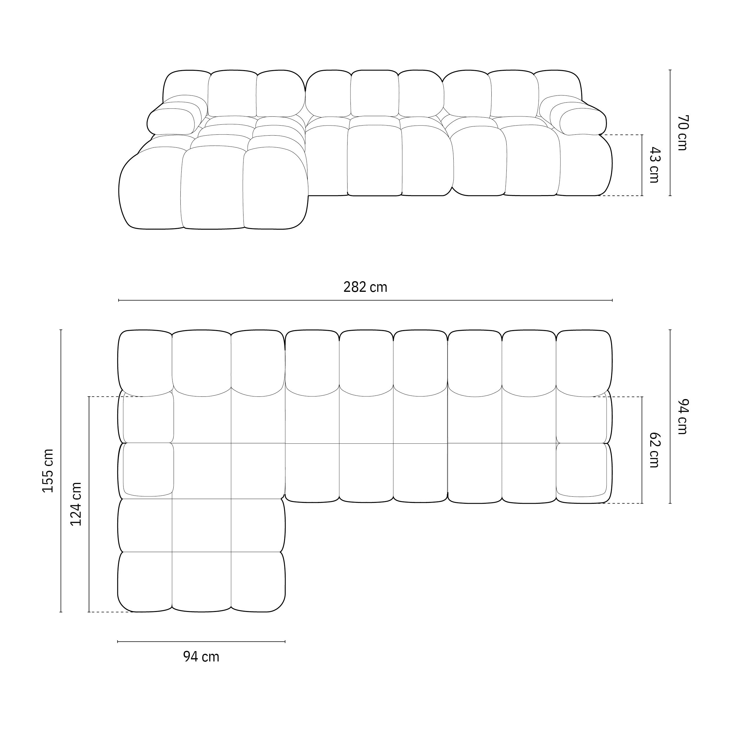 - Modulaire hoekbank met de afmetingen H 70 x B 282 x D 188/94 cm