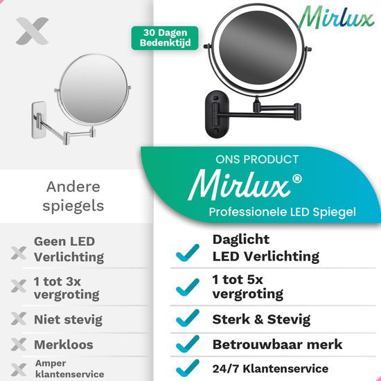 ✓ Dubbelzijdige spiegel 1-5x vergroting ✓ Oplaadbaar - Inclusief oplaadkabel ✓ Ideaal in donkere en slecht belichte ruimtes ✓ Bespaar veel tijd tijdens het opmaken ✓ Heldere LED verlichting - Dimbaar ✓ Verschillende lichtstanden - Warme of koude verlichting ✓ Perfect voor opmaken, epileren, scheren, lenzen aanbrengen, enz ✓ Fexibele arm - uitschuifbaar tot 29 cm ✓ Aan/uit verlichting met aanraaksensor schakelaar ✓ Sterk en stevig ✓ Makkelijk aan de muur hangen ✓ Roestvrij &duurzaam ✓ Energiezuinig ✓ 1 jaar garantie Altijd klaar wanneer je het nodig hebt