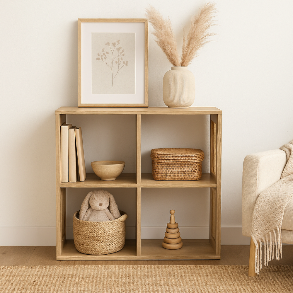 De vier open vakken bieden volop ruimte voor boeken, mandjes, accessoires of handdoeken. Dankzij het compacte ontwerp is deze kast ideaal voor kleinere ruimtes, en kun je hem zowel staand als liggend gebruiken.