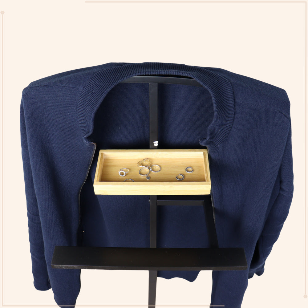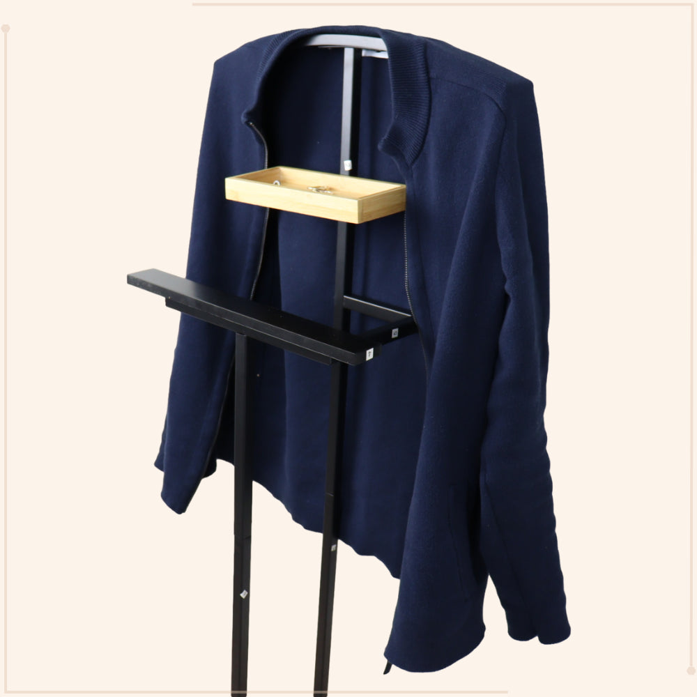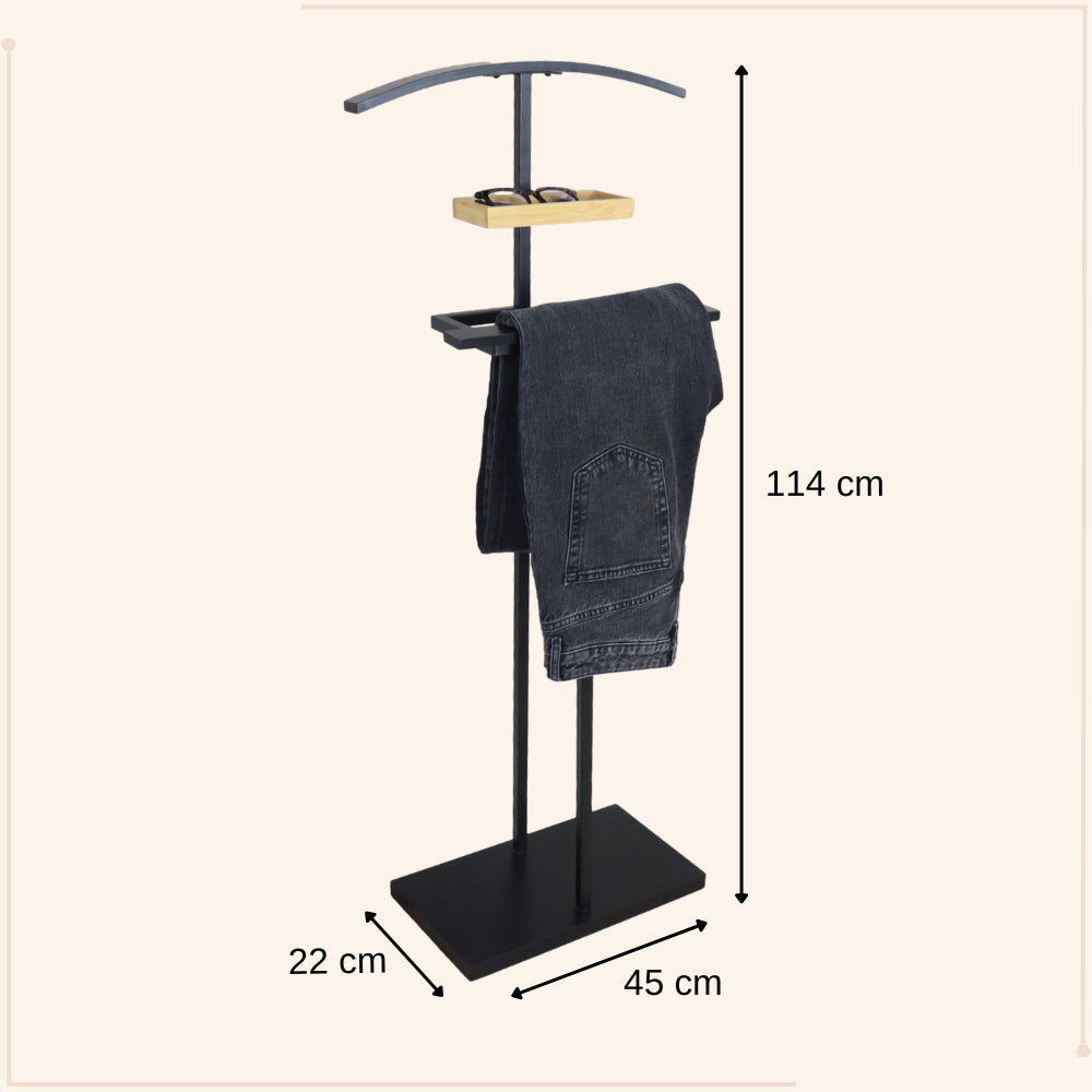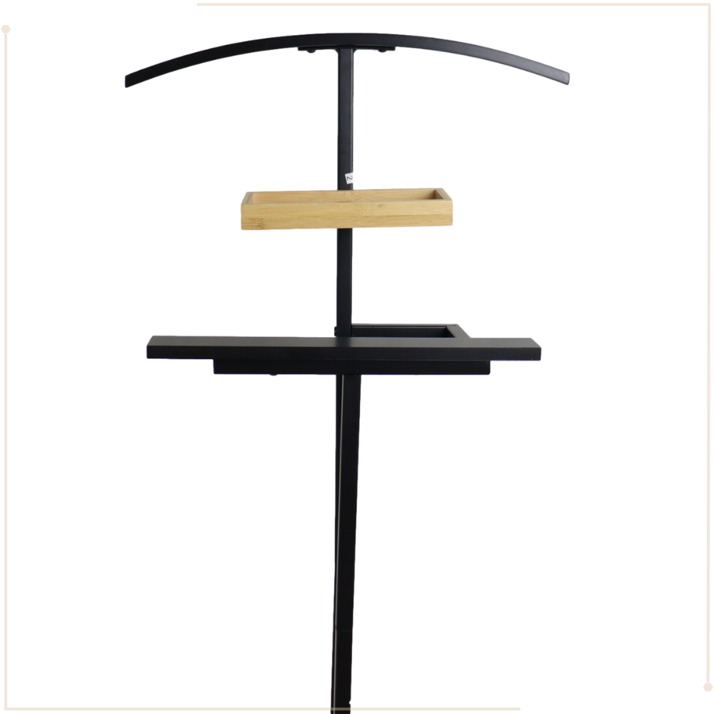 Organiseer je kleding met de MISOU Dressboy Kledingstandaard BRUNNO. Deze standaard van 114 cm, gemaakt van bamboe en metaal, biedt een stijlvolle en functionele oplossing voor het ophangen van kleding.