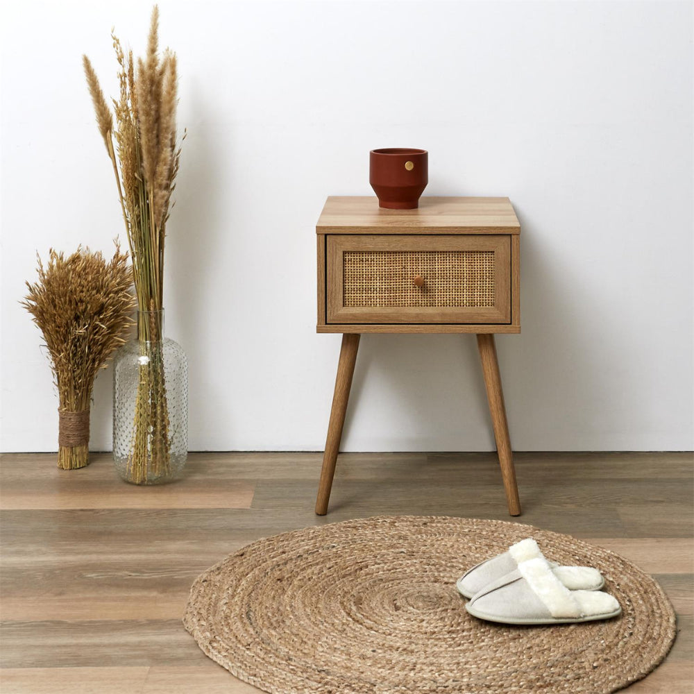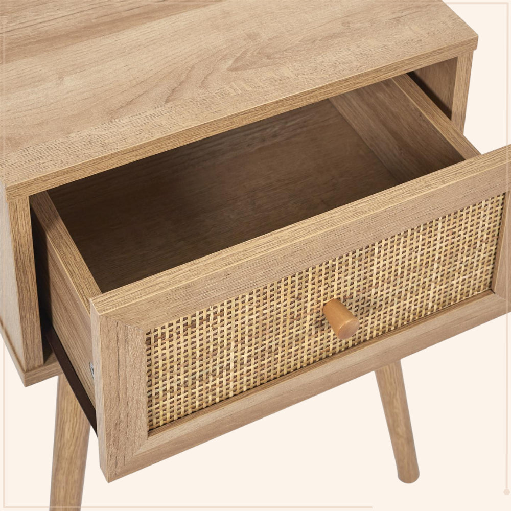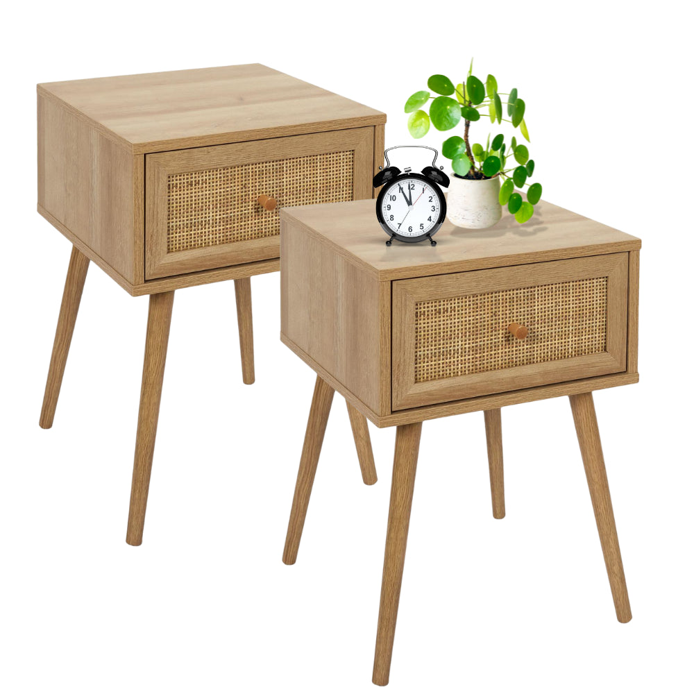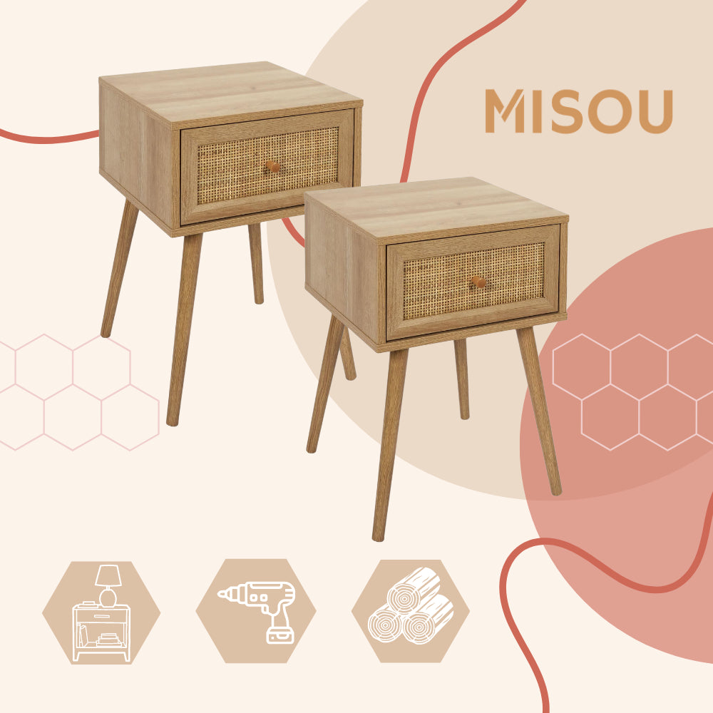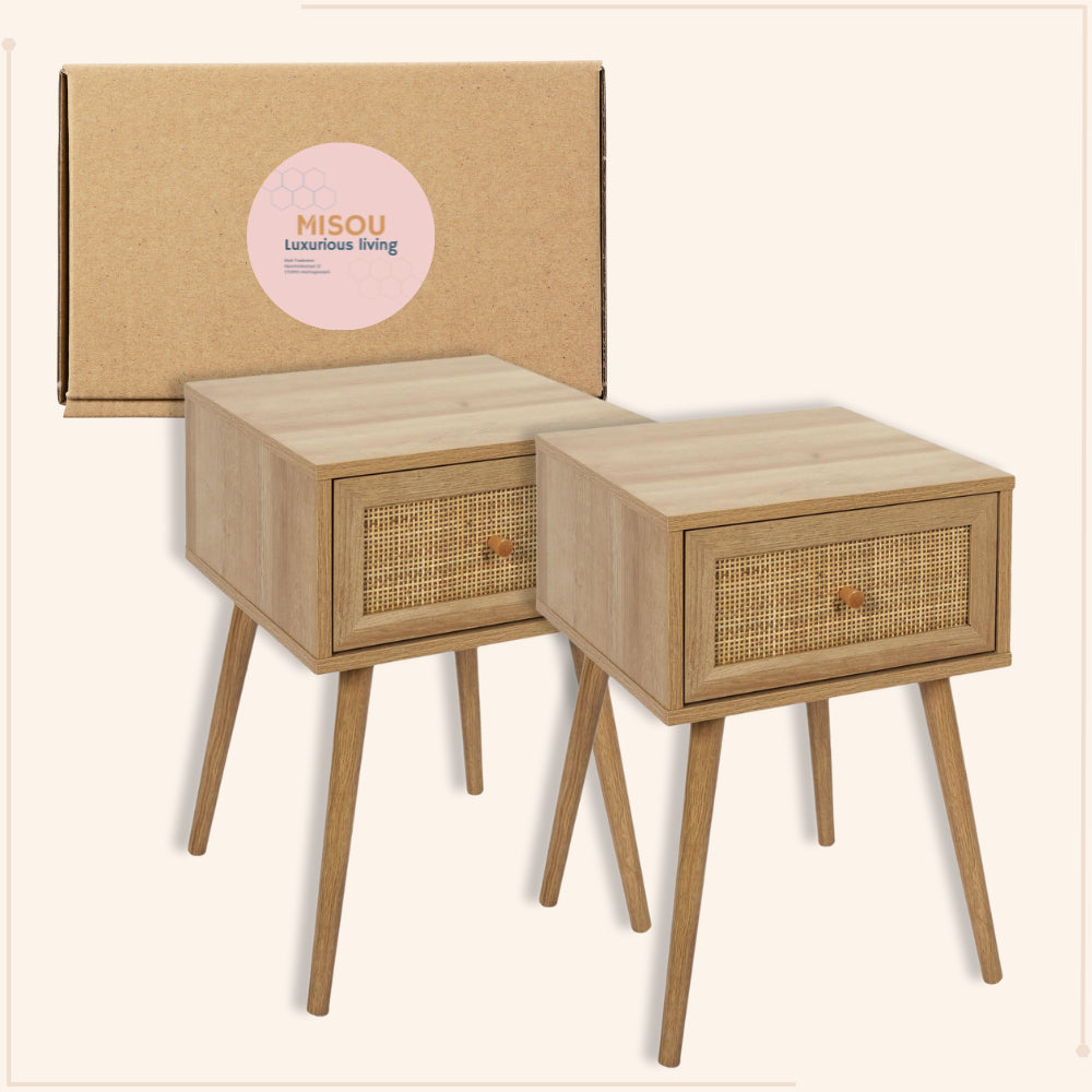 Voeg een vleugje natuurlijke elegantie toe aan je slaapkamer met de MISOU Nachtkastjes met Lade, een set van 2 stuks, vervaardigd van rotan webbing en hout. Deze nachtkastjes combineren functionaliteit met een eigentijds design, waardoor ze perfect zijn voor het opbergen van je essentials naast je bed.