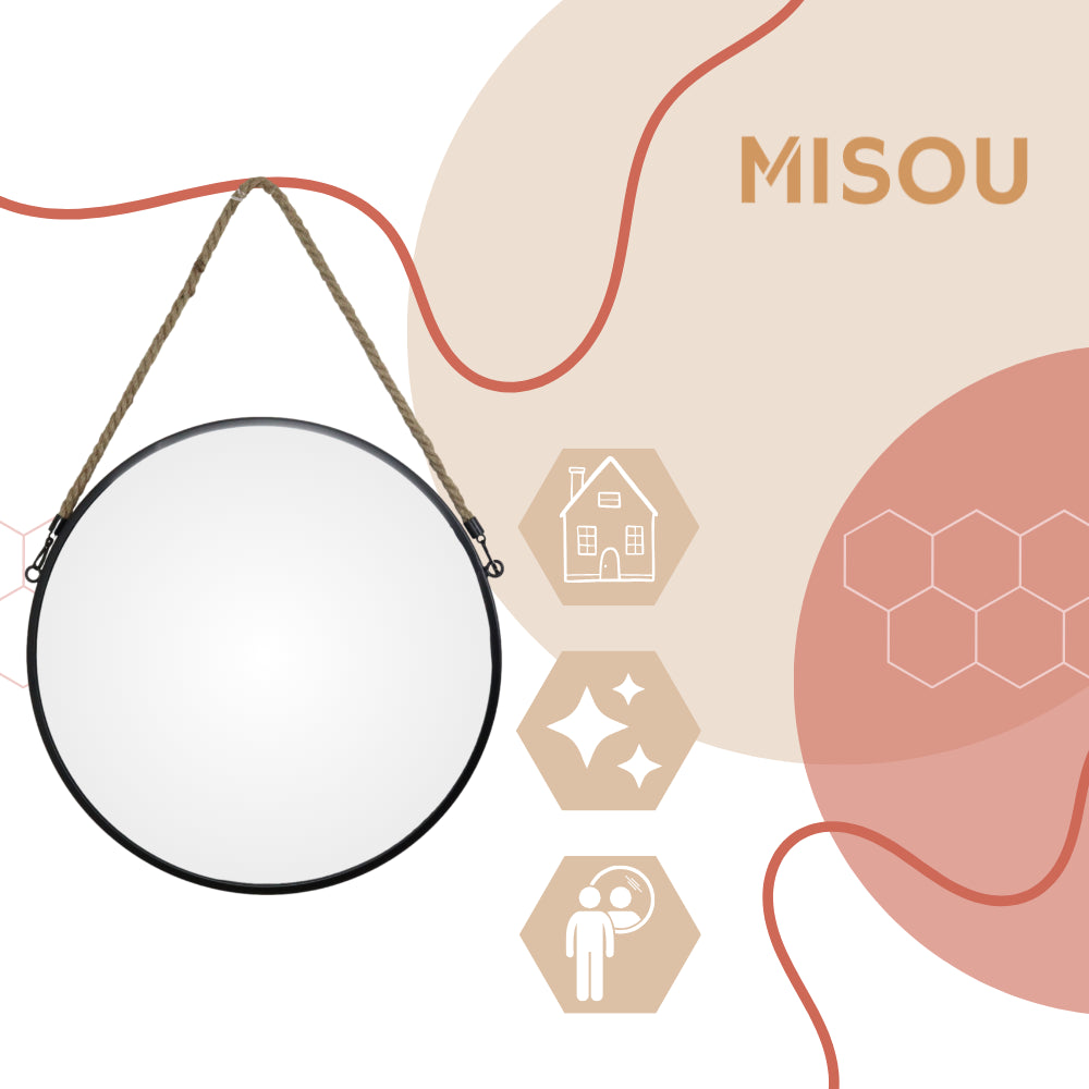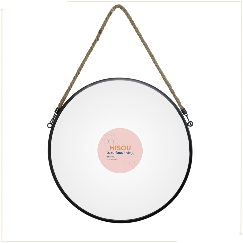 Door de MISOU ronde spiegel kan opgehangen worden met het touw dat aan de bovenkant gevestigd is. De spiegel heeft een diameter van 38cm en een dikte van 1,5cm. De rand om de spiegel heeft een zwarte kleur.