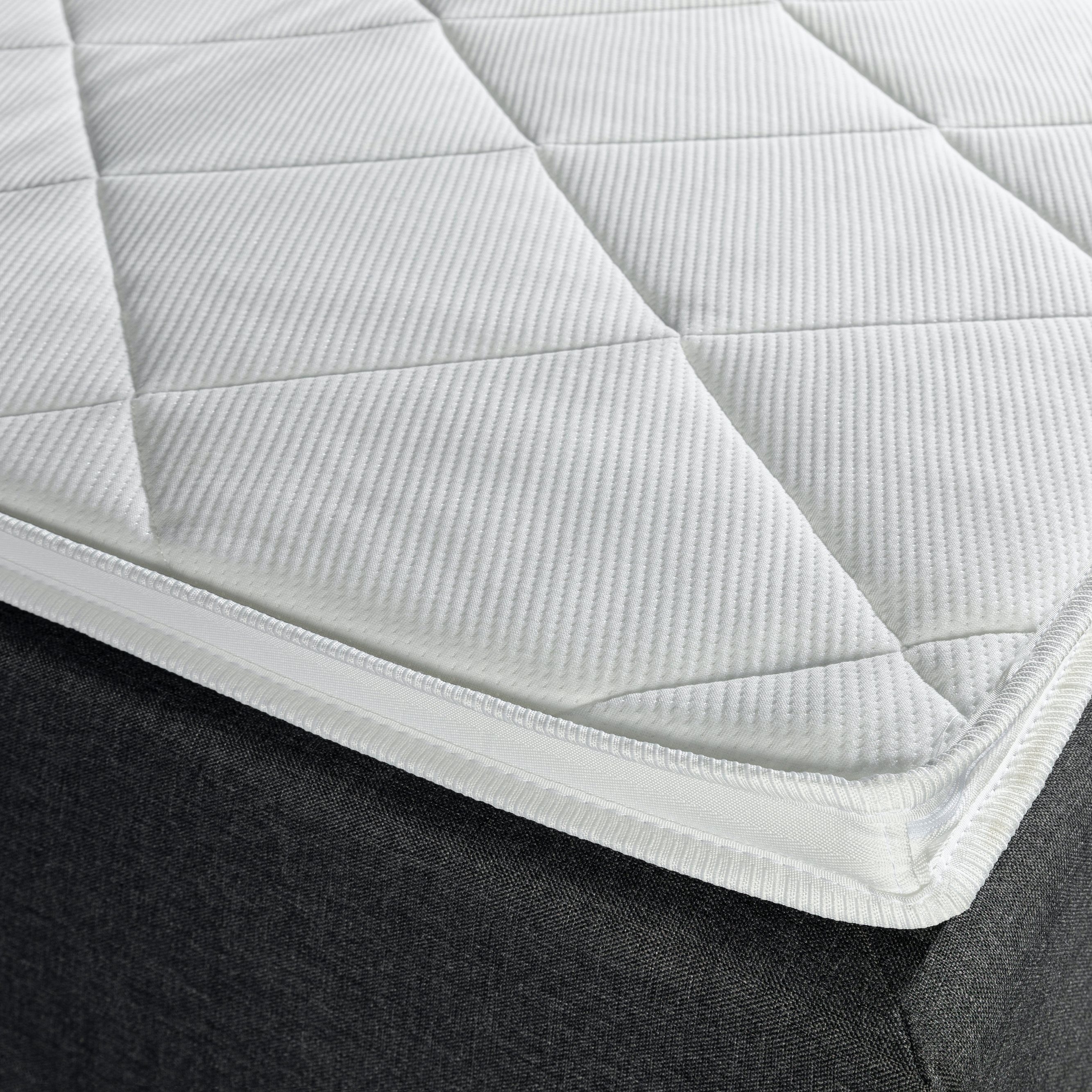 Topper De topper bij deze boxpspring met opbergruimte is gemaakt van HR45 koudschuim. Hij bestaat uit 4 cm stevig koudschuim en heeft een totale hoogte van 6 cm. De matrastopper bedekt de gehele boxspring. De topper zorgt voor een fantastisch ligcomfort! Door de open cel structuur ademt deze geweldig en is hij uiterst warmte- en vochtregulerend.