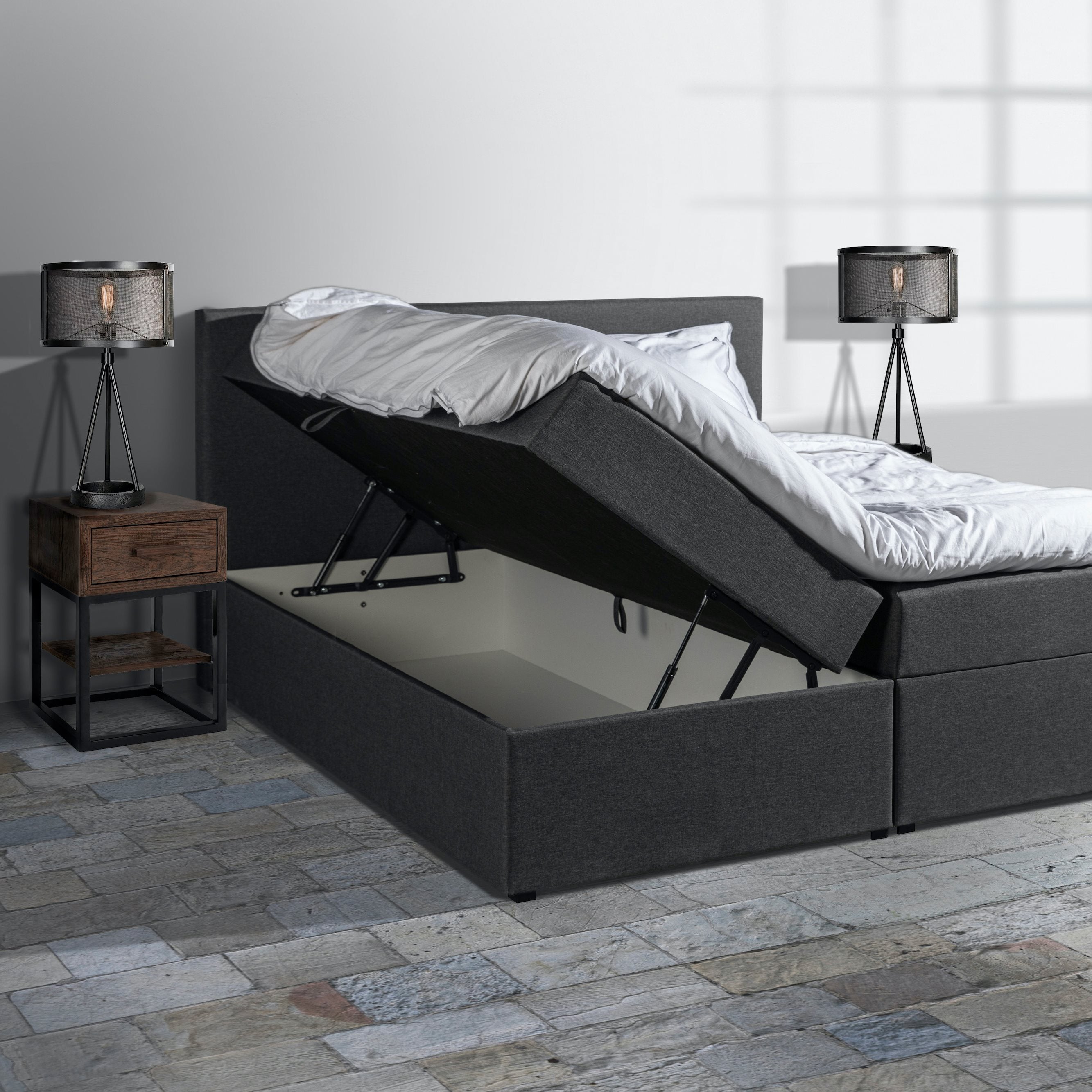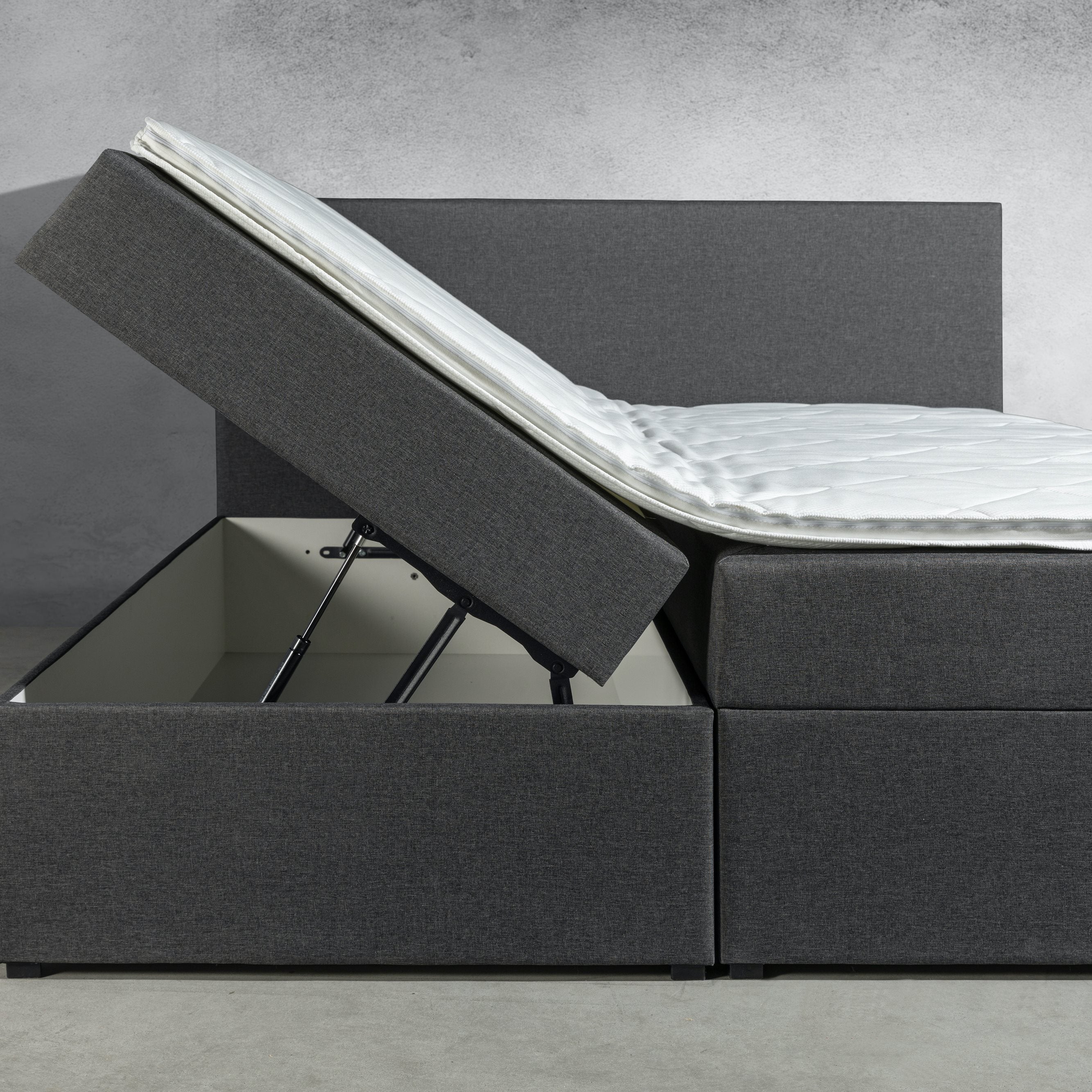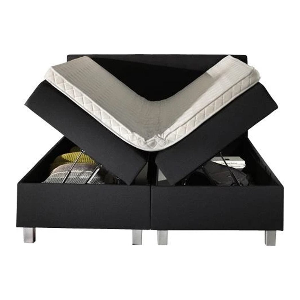 Unieke veertechniek De losse boxen en de opbergruimte deze boxspring wordt geleverd met 2 vlakke comfort boxen van ca. 30 cm hoog. En wat deze boxen zo bijzonder maakt, is de royale opbergruimte onder de matrassen. Normaal is dit een loze ruimte, maar deze boxspring is multifunctioneel! Het openen van de opbergruimte gaat erg makkelijk; door aan de stevige lus te trekken gaan de pocketveer matrassen zijwaarts omhoog, alsof hij zijn vleugels uitslaat. Door een unieke veertechniek blijft de boxspring goed openstaan. Het mechanisme is goed bestendig tegen intensief gebruik en zo heb jij letterlijk in een handomdraai een royale opbergruimte waar je van alles in kwijt kunt. Denk bijvoorbeeld aan je beddengoed, kleding en schoenen.