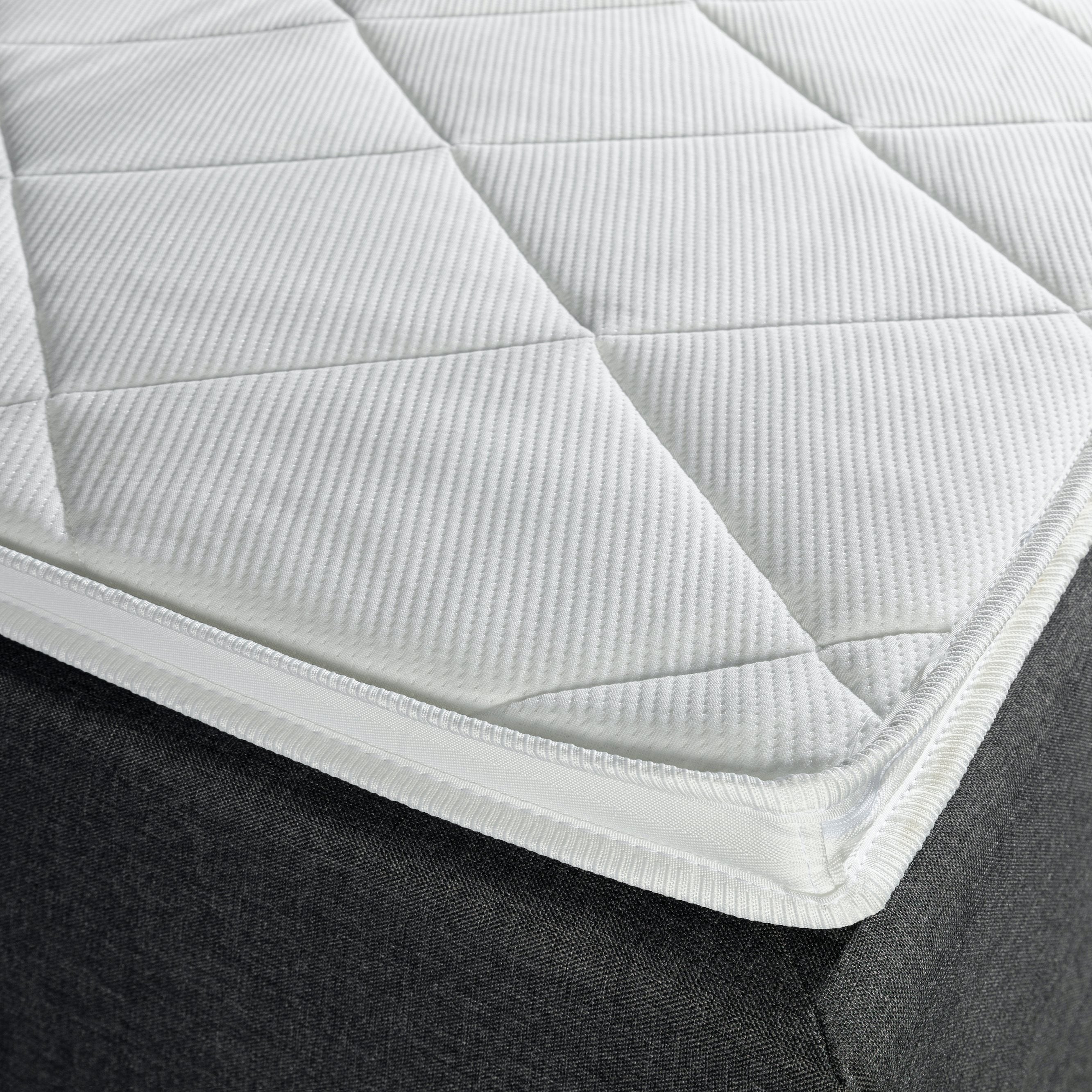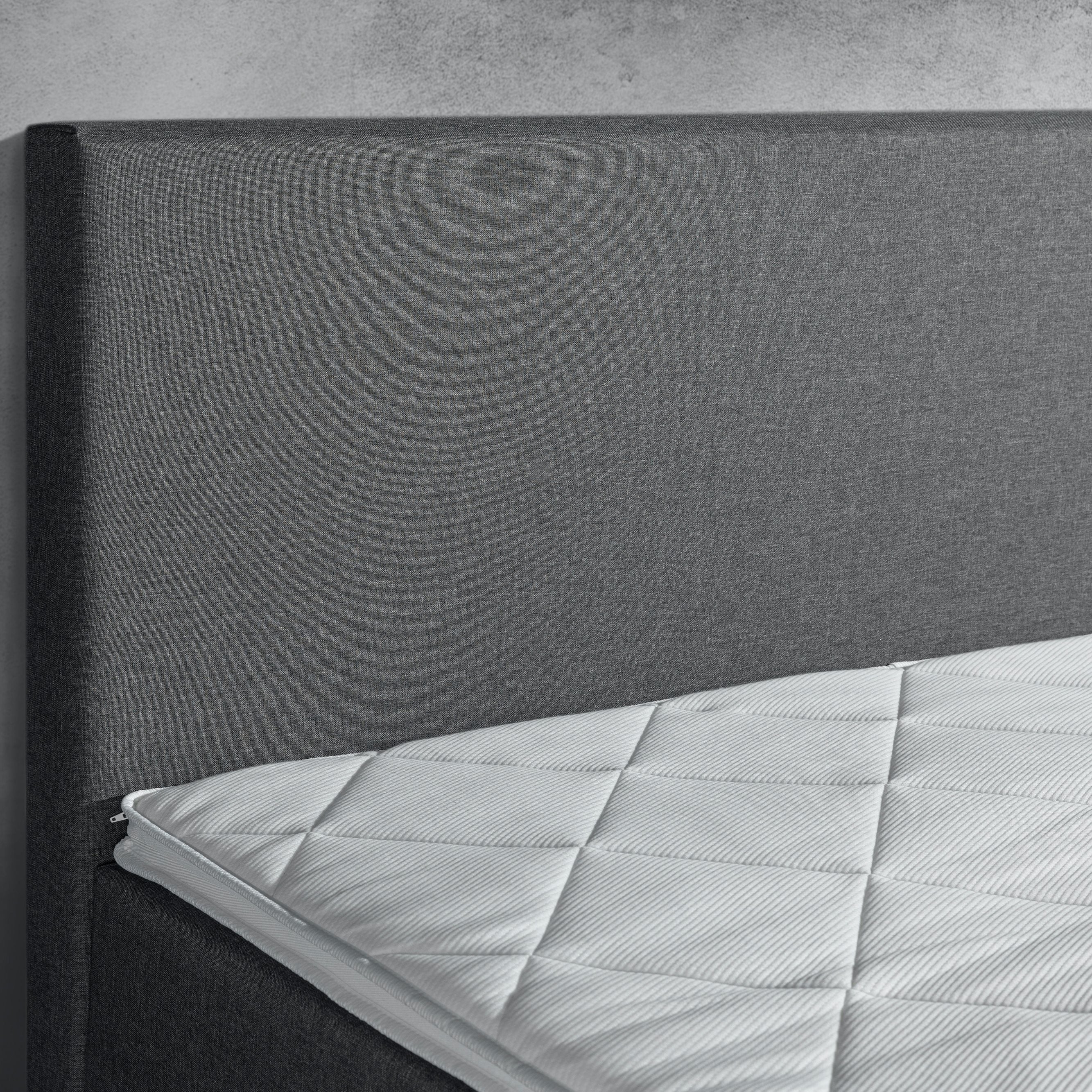 Topper De topper bij deze boxpspring met opbergruimte is gemaakt van HR45 koudschuim. Hij bestaat uit 4 cm stevig koudschuim en heeft een totale hoogte van 6 cm. De matrastopper bedekt de gehele boxspring. De topper zorgt voor een fantastisch ligcomfort! Door de open cel structuur ademt deze geweldig en is hij uiterst warmte- en vochtregulerend.