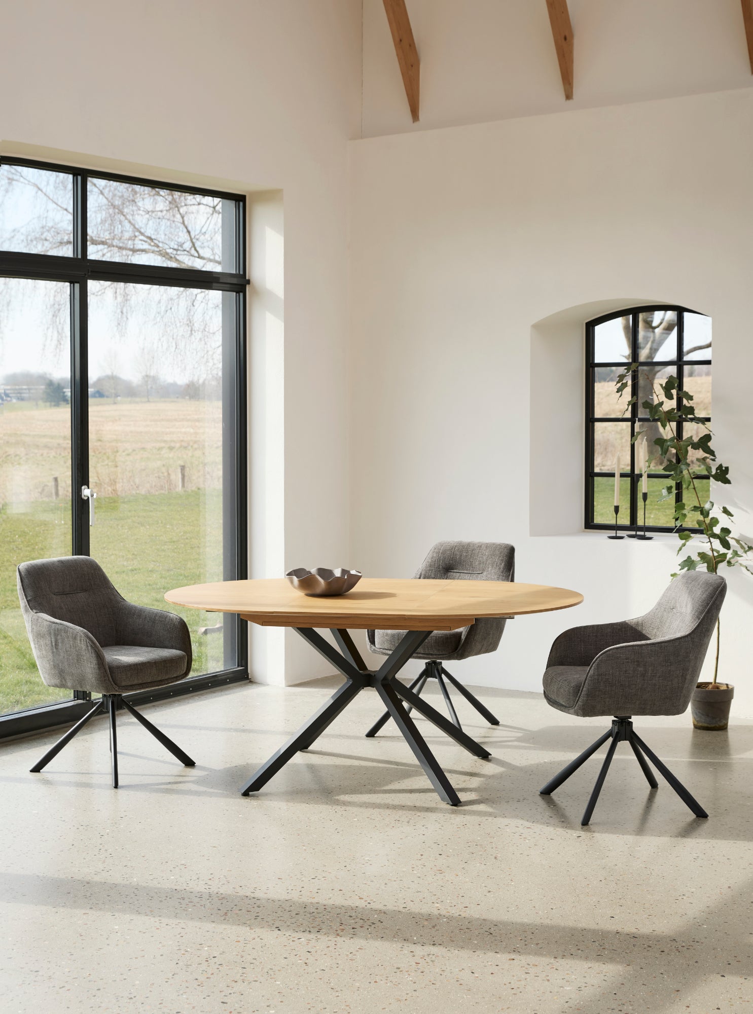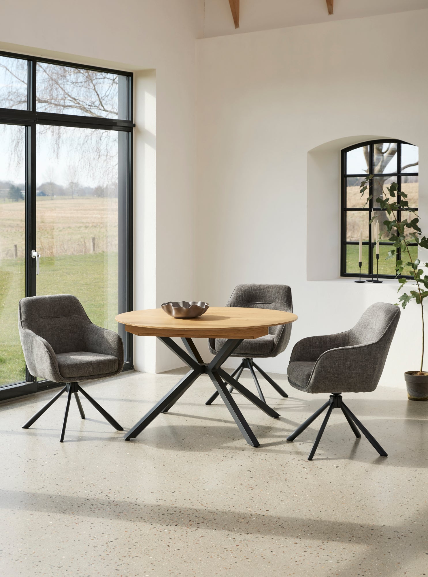 Strak en comfortabel in één. Morwen in grijs combineert een royale zitting met zachte kussens en armleuningen voor optimaal zitcomfort. De neutrale grijstint geeft een kalme, moderne basis, terwijl het metalen onderstel in kruispootvorm zorgt voor een eigentijdse en stevige uitstraling.