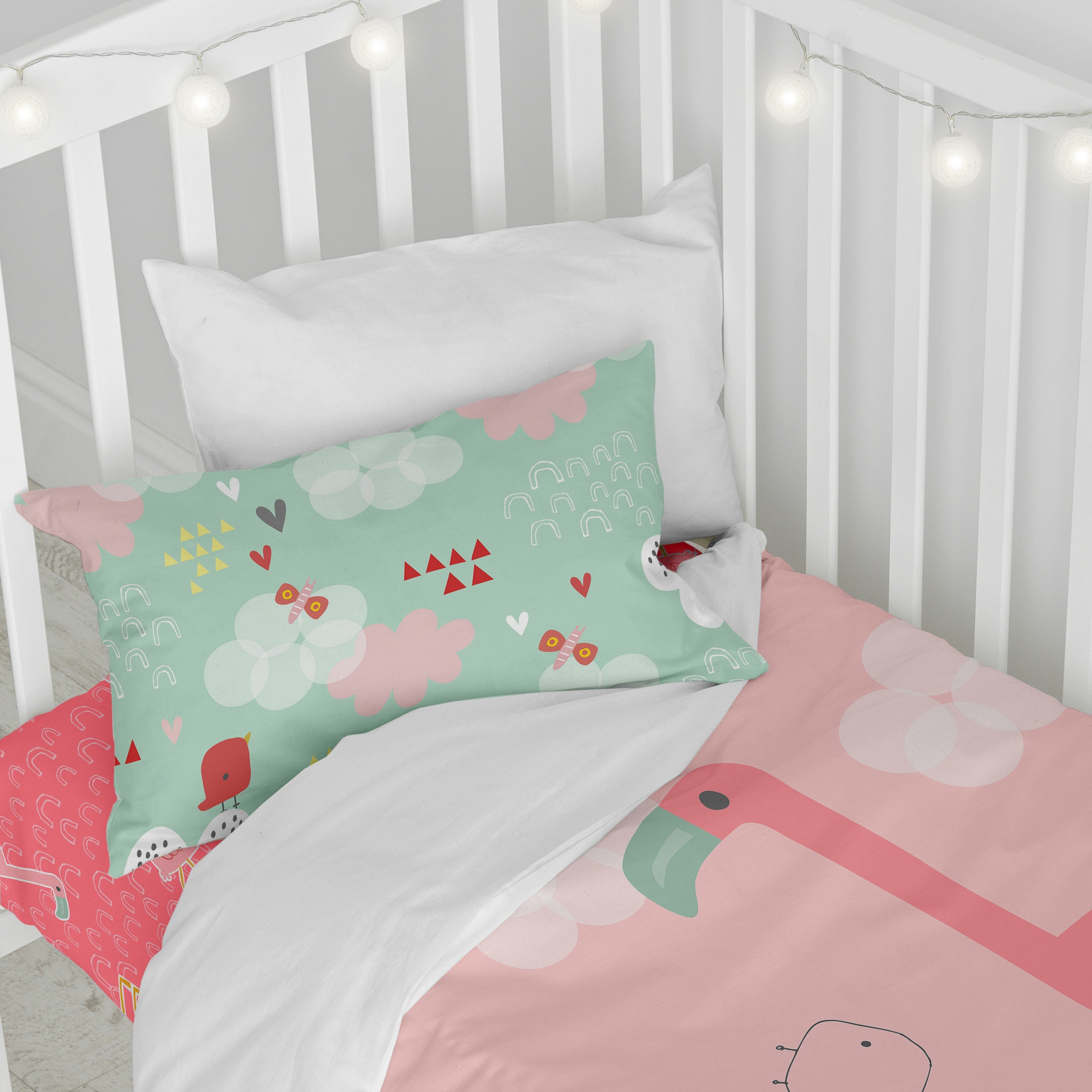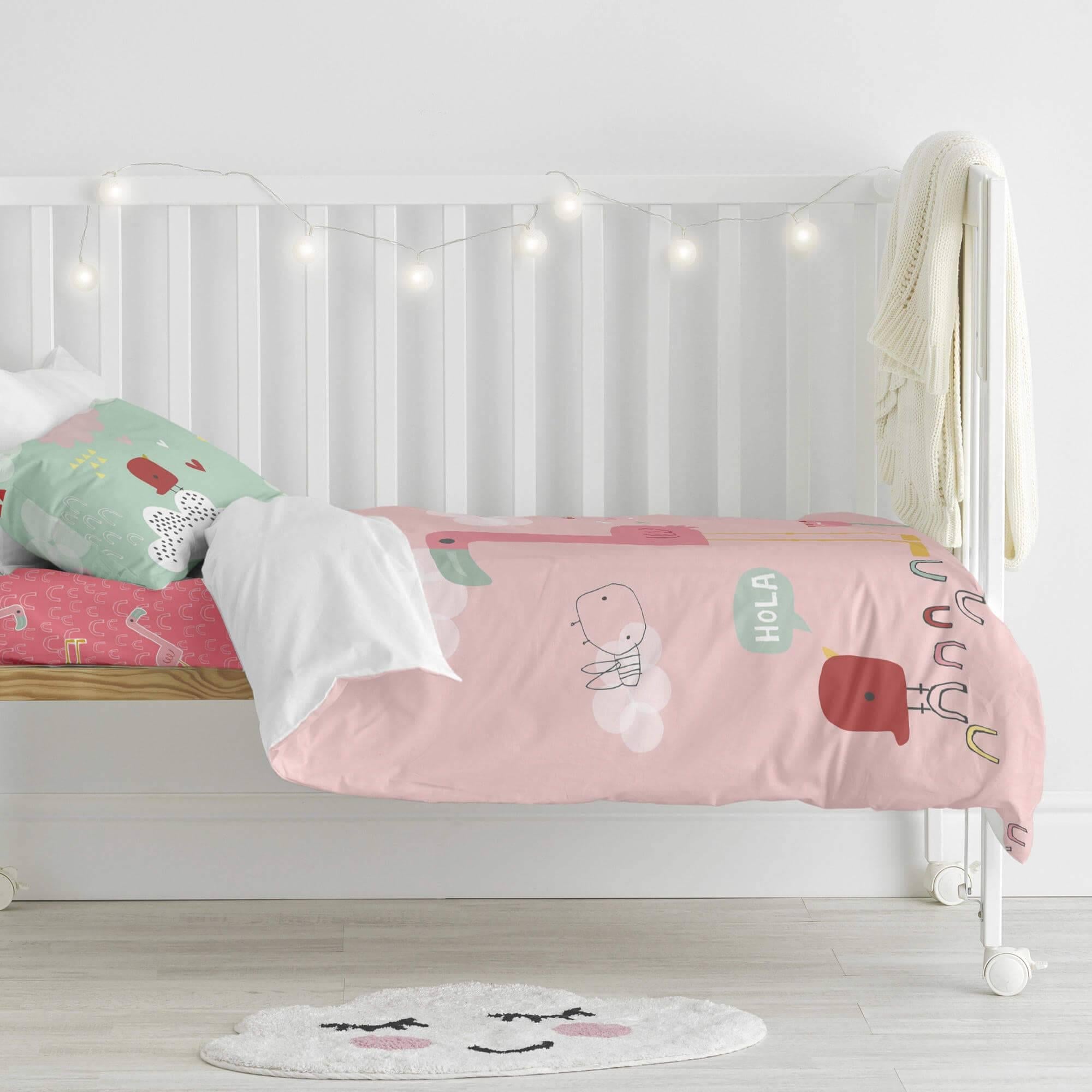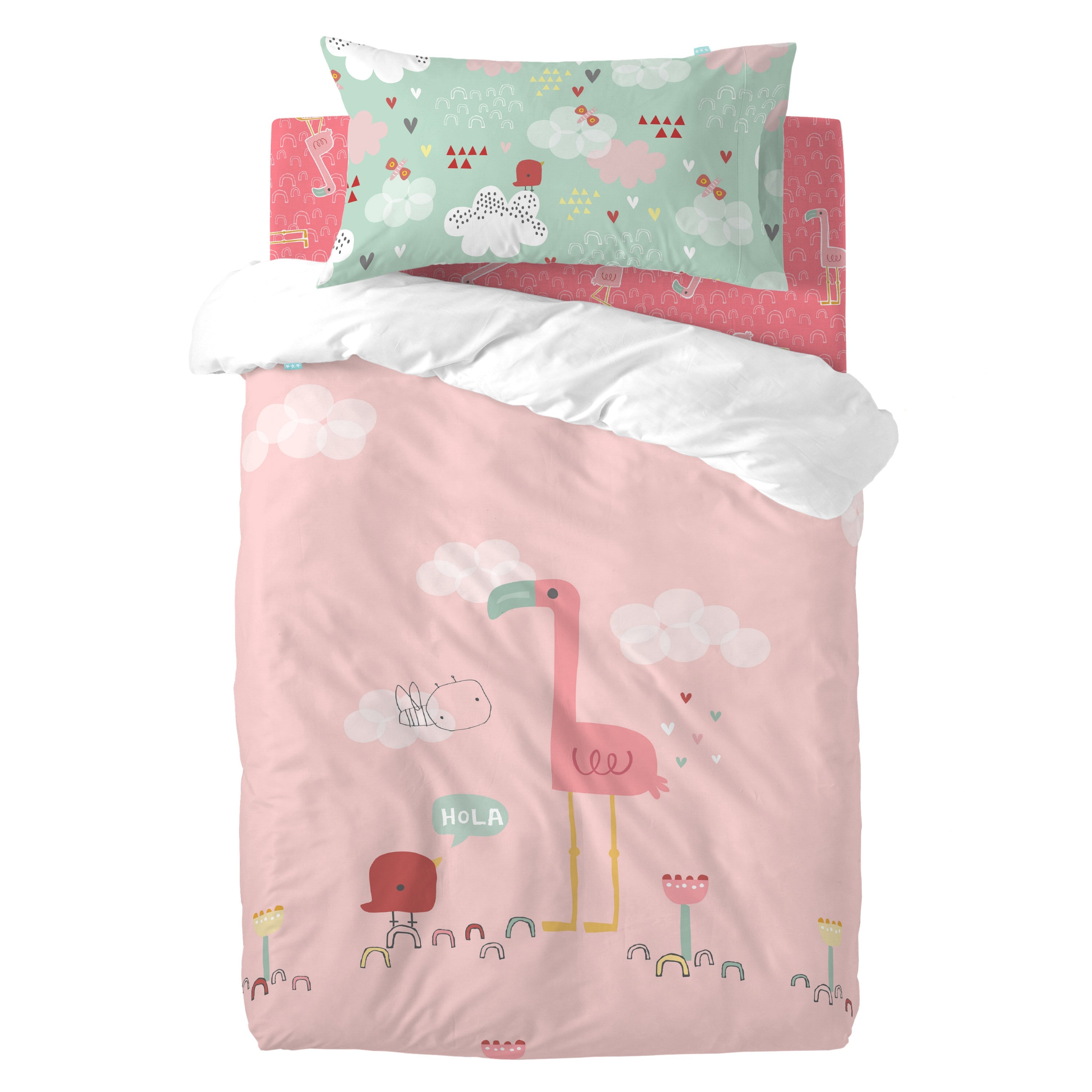 Het Hola dekbedovertrek uit de Moshi Moshi collectie brengt een speelse roze waterwereld naar de slaapkamer van je kind. Laat je kleintje samen met Flamingo, Vogel en Bij op avontuur gaan terwijl hij uitrust op het bijpassende kussensloop. Dankzij de high definition digitale print behouden dit 100% katoenen dekbedovertrek en kussensloop dezelfde heldere lijnen en felle kleuren als op de eerste dag. Linnen niet inbegrepen