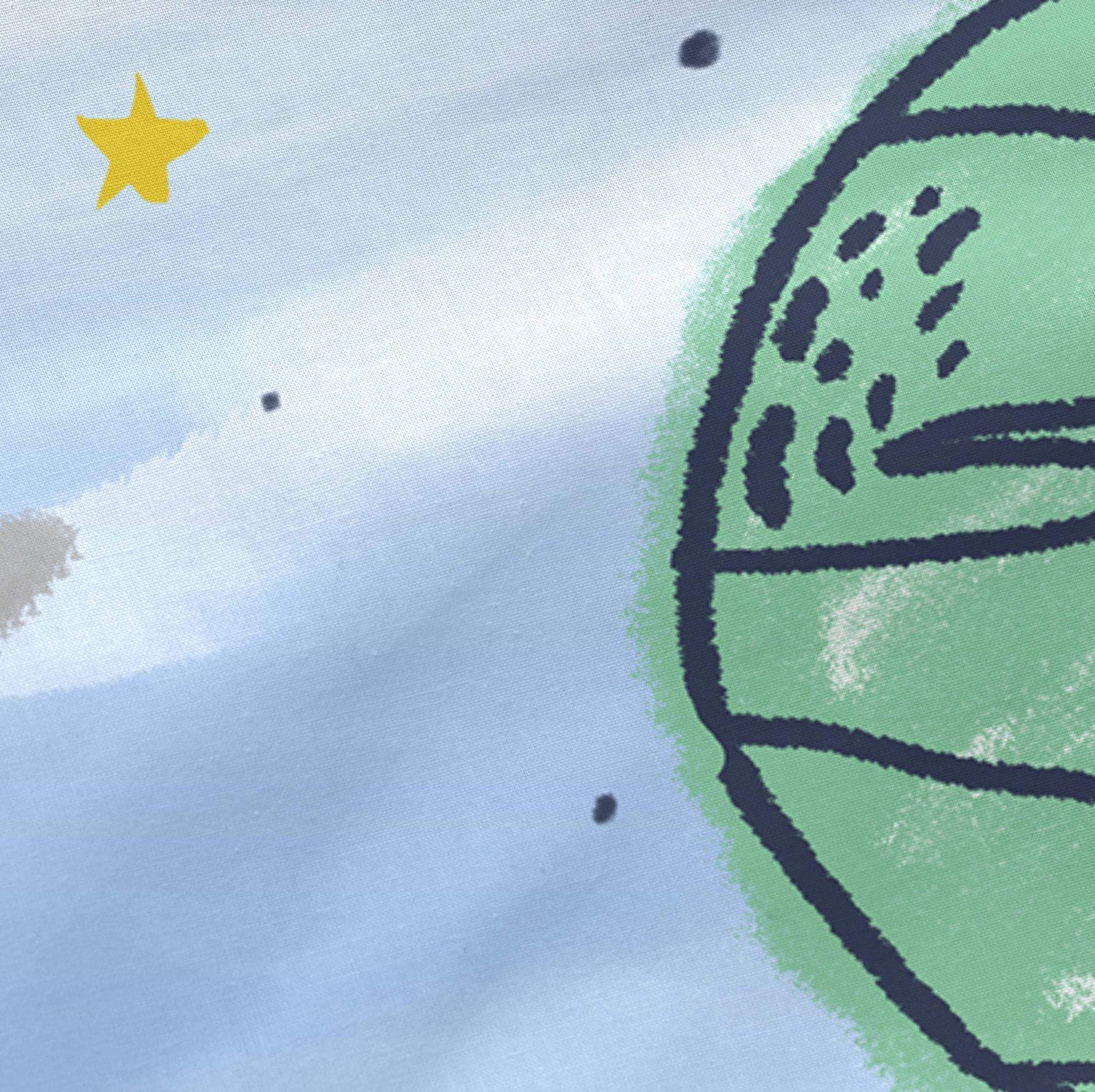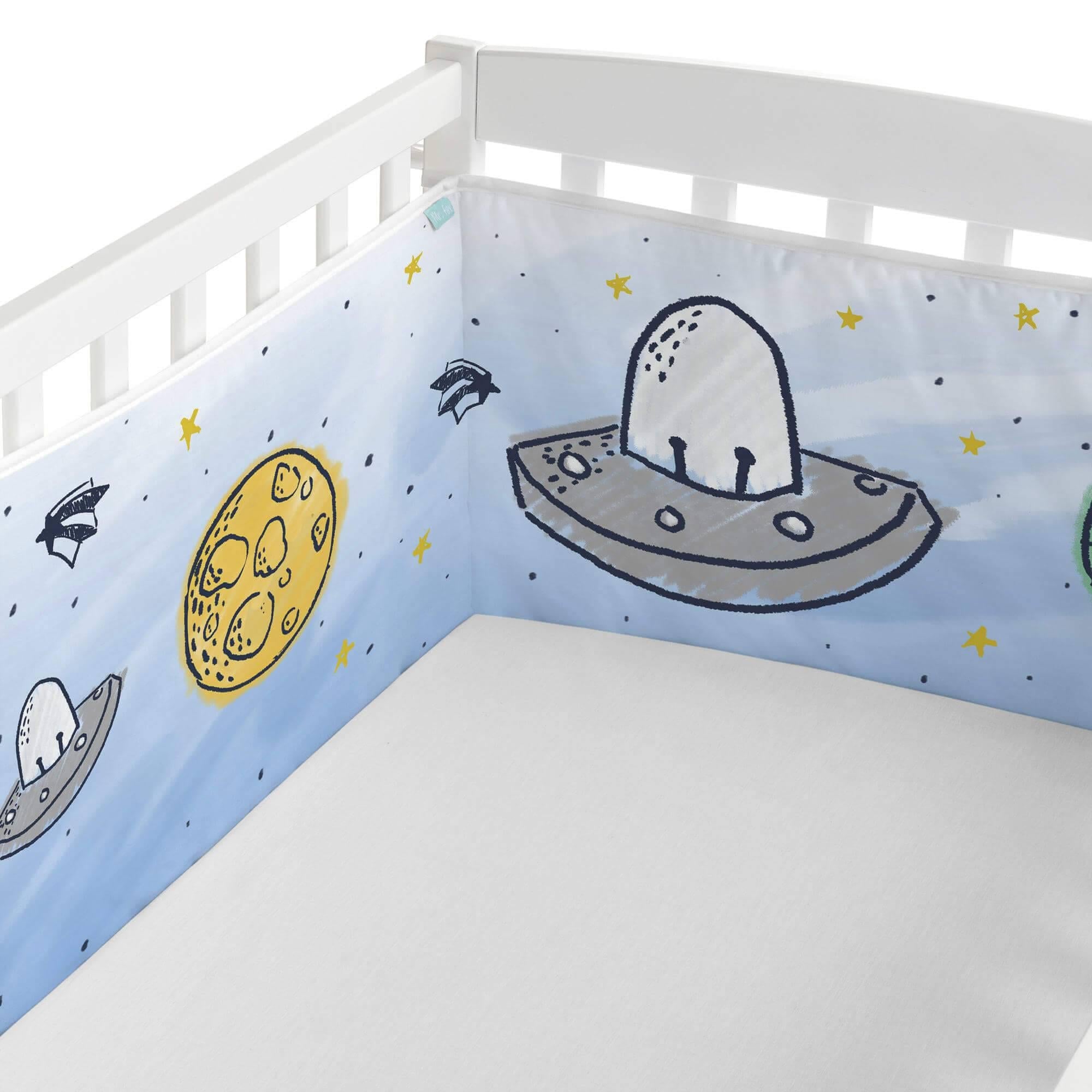 STAR SPACE uit de Mr. Fox collectie, een bedbeschermer (Maxicot) van 70 cm, voor liefhebbers van galactische avonturen. Met een lief en leuk ontwerp met planeten, raketten en ruimteschepen beschermt deze beschermer de baby tegen stoten tegen de zijkanten van het bedje. Hij is gemaakt in Spanje met 150 counts natuurlijk katoen en garandeert optimale zachtheid en comfort voor de baby tijdens het slapen. De digitale print met hoge definitie zorgt ervoor dat de kleur levendig blijft na vele wasbeurten. De HCS-vezelvulling van deze 100% katoenen wiegbeschermer zorgt voor volume, maar ook voor lichtheid, zachtheid en elasticiteit. De wiegbeschermer is 3 cm dik en weegt 200 gram.