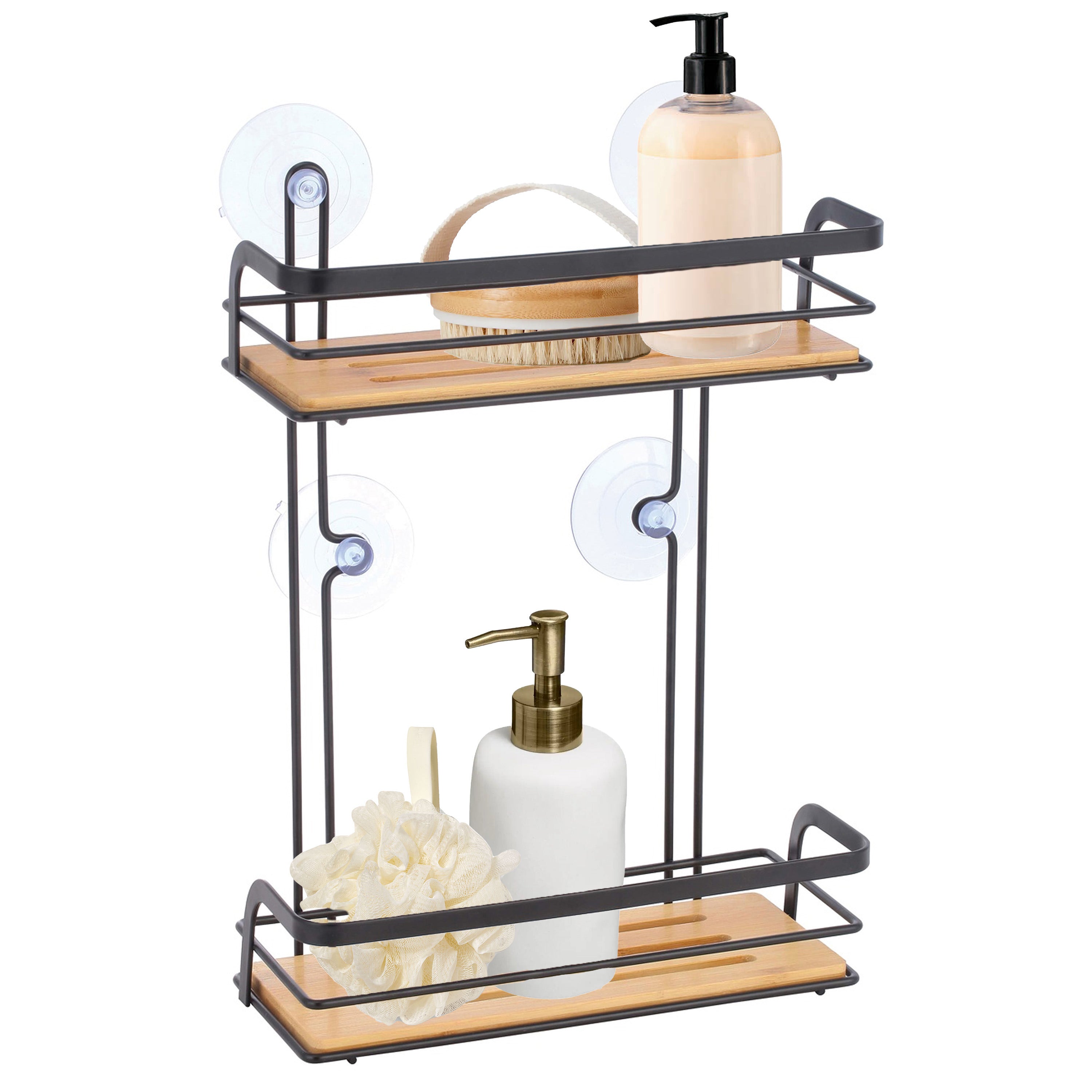 MSV 2-laags doucherekje/badkamerrekje gemaakt van metaal en bamboe in de kleur zwart. Handig rekje voor in de badkamer om o.a. zeep en shampoo flessen in te plaatsen. Bevestig het mandje eenvoudig aan de wand door middel van de meegeleverde zuignappen. Materiaal: metaal/bamboe. Formaat: ca. 25,5 x 12 x 37 cm.