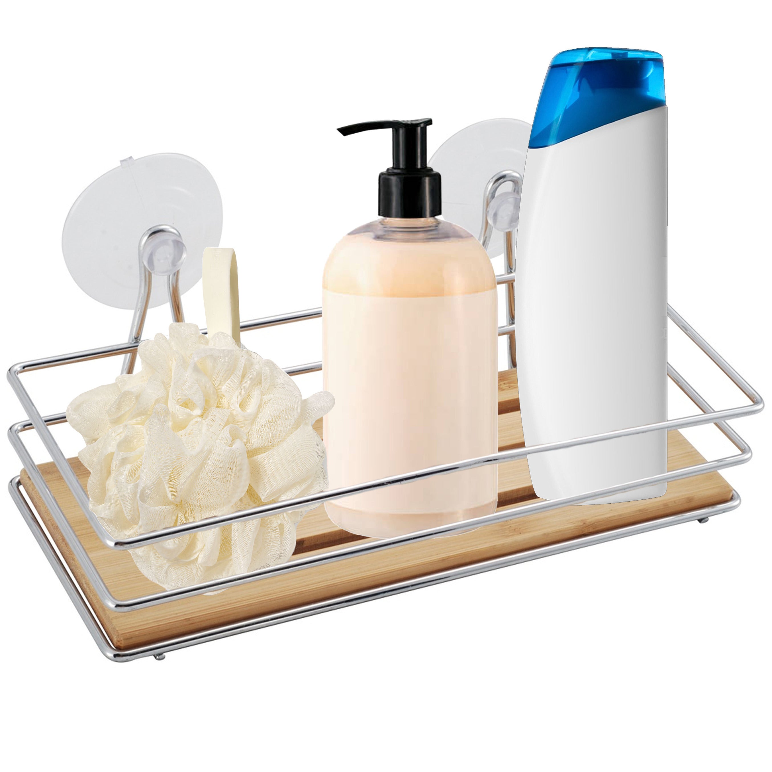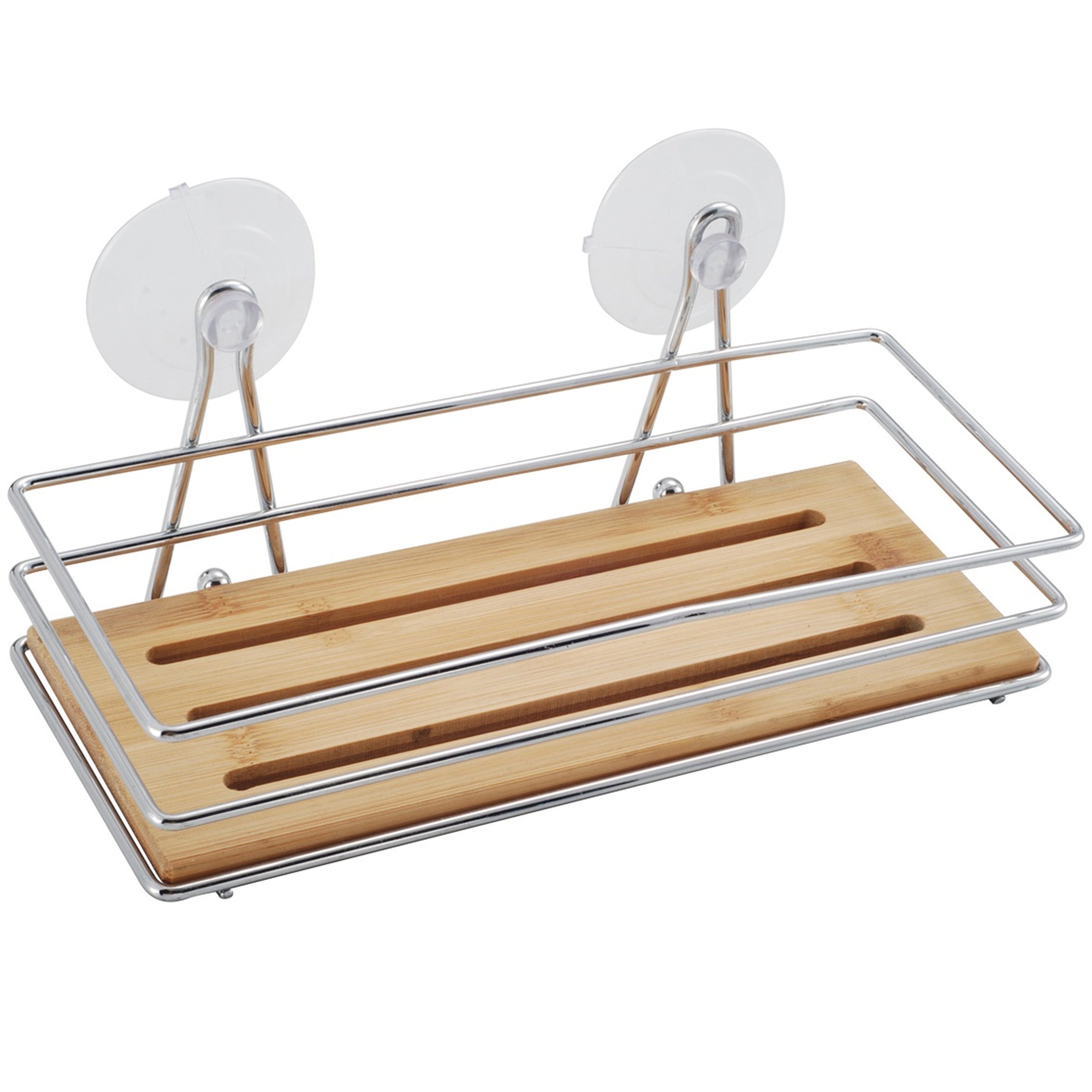 MSV doucherekje/badkamerrekje gemaakt van bamboe hout en metaal. Handig rekje voor in de badkamer om o.a. zeep en shampoo flessen in te plaatsen. Bevestig het mandje eenvoudig aan de wand door middel van de zuignappen. Materiaal: bamboe hout en metaal. Formaat: ca. 26,5 x 11,5 x 10 cm.