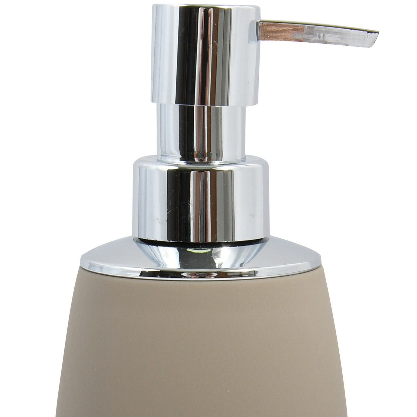 Zeeppompje/zeepdispenser, gemaakt van ABS kunststof in de kleur taupe met zilver kleur pompje. De vloeibaar zeep dispenser heeft een stijlvol en compact ontwerp. Ideaal voor in de badkamer of het toilet. Afmetingen: ca. 8 x 17 cm. Inhoud: ca. 260 ml. Serienaam: Bilbao.