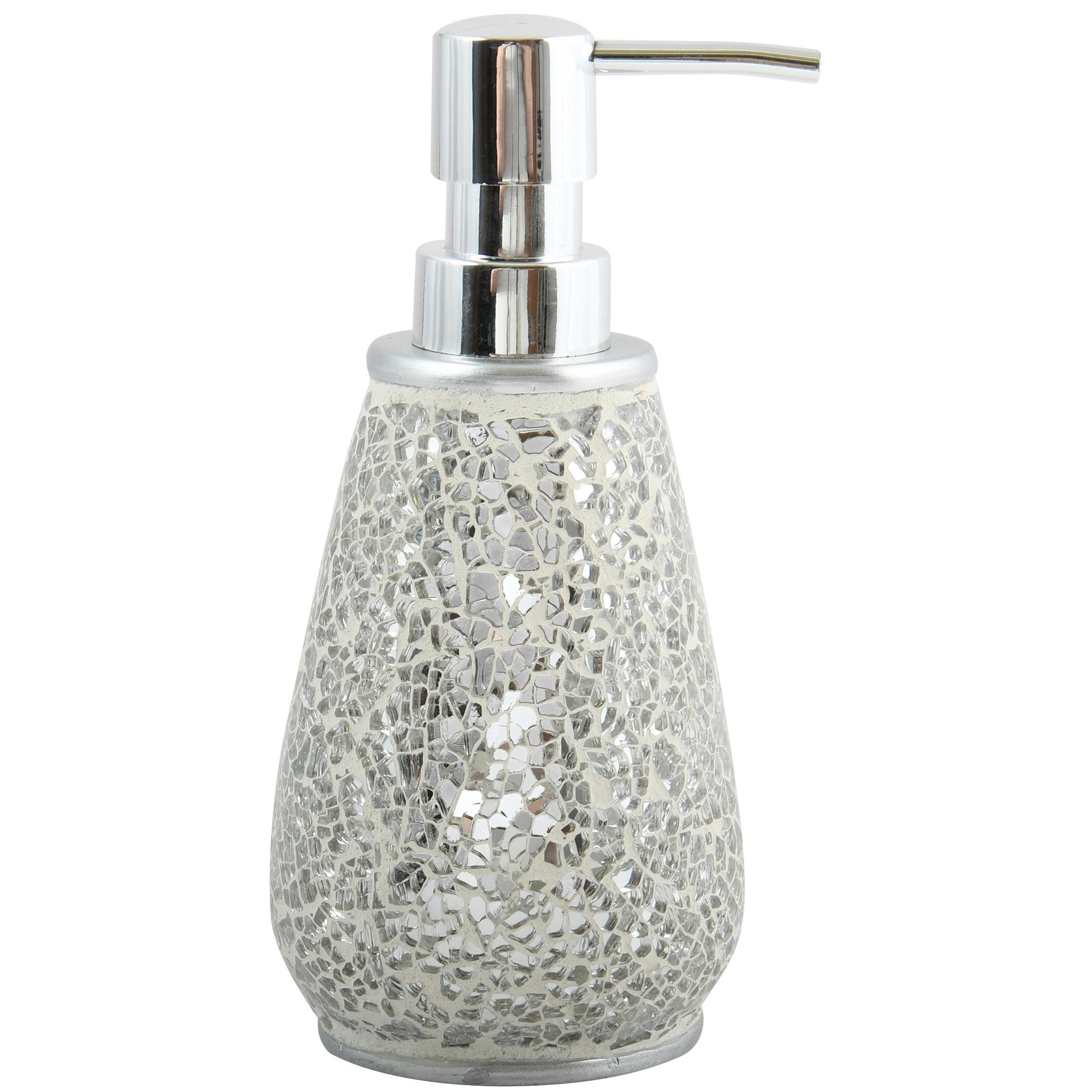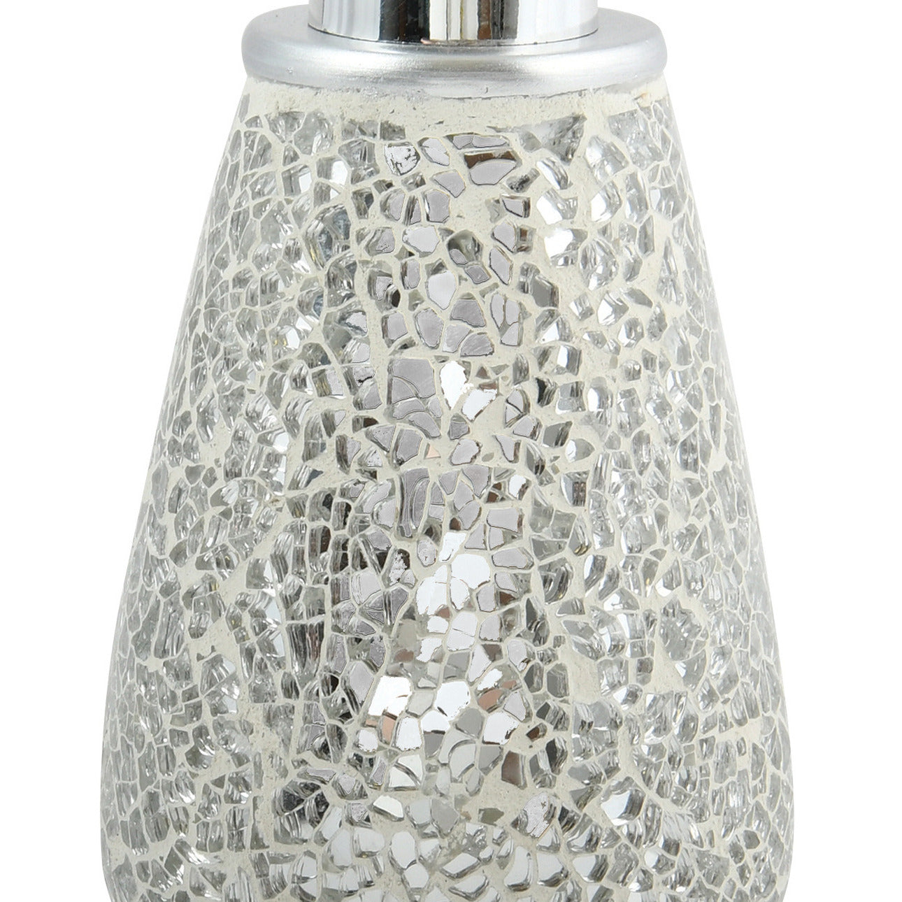 Zeeppompje/zeepdispenser, gemaakt van polyresin/kunststeen in de kleur zilver met mozaieken stijl finish en rvs pompje. De vloeibaar zeep dispenser heeft een zeer stijlvol en compact ontwerp. Ideaal voor in de badkamer of het toilet. Afmetingen: ca. 8 x 17 cm. Inhoud: ca. 275 ml. Serienaam: Scarlett.