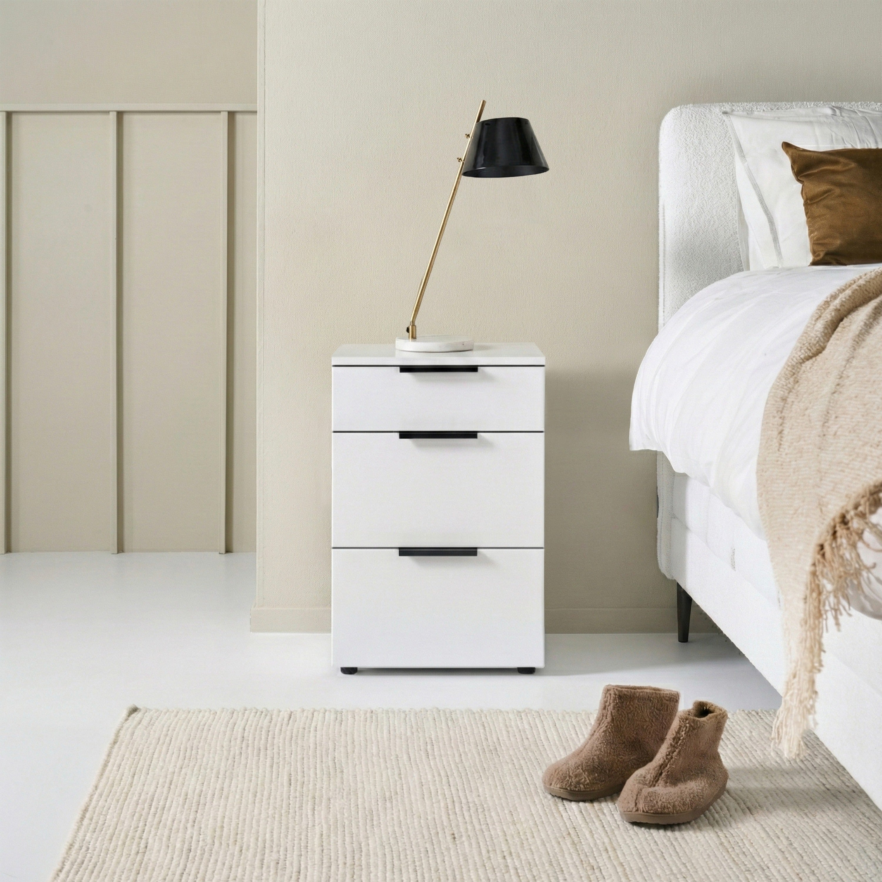 Nachtkastje Elda is perfect geschikt voor naast je bed. Het biedt niet alleen handige opberglades, maar ziet er ook nog eens stijlvol uit. Het strakke design in crispy wit met robuuste handgrepen van zwart metaal maken dit nachtkastje een echte eyecatcher in elke slaapkamer. Indeling: Het nachtkastje heeft 3 handige lades, waarin je al je spullen netjes kunt opbergen. De bovenste lade is iets minder diep dan de onderste, waardoor het perfect is voor het bewaren van items zoals je telefoon, opladers en bril - alles wat je 's nachts binnen handbereik wilt hebben. Met nachtkastje Elda blijft je slaapkamer georganiseerd en opgeruimd. Belangrijk om te weten: Nachtkastje Elda is 41 cm breed, 41 cm diep en 61 cm hoog. Het is gemaakt van plaatmateriaal met een folie afwerking in wit decor. De 3 lades hebben zwart metalen handgrepen. Het ladekastje moet nog gemonteerd worden.| Afmetingen | |