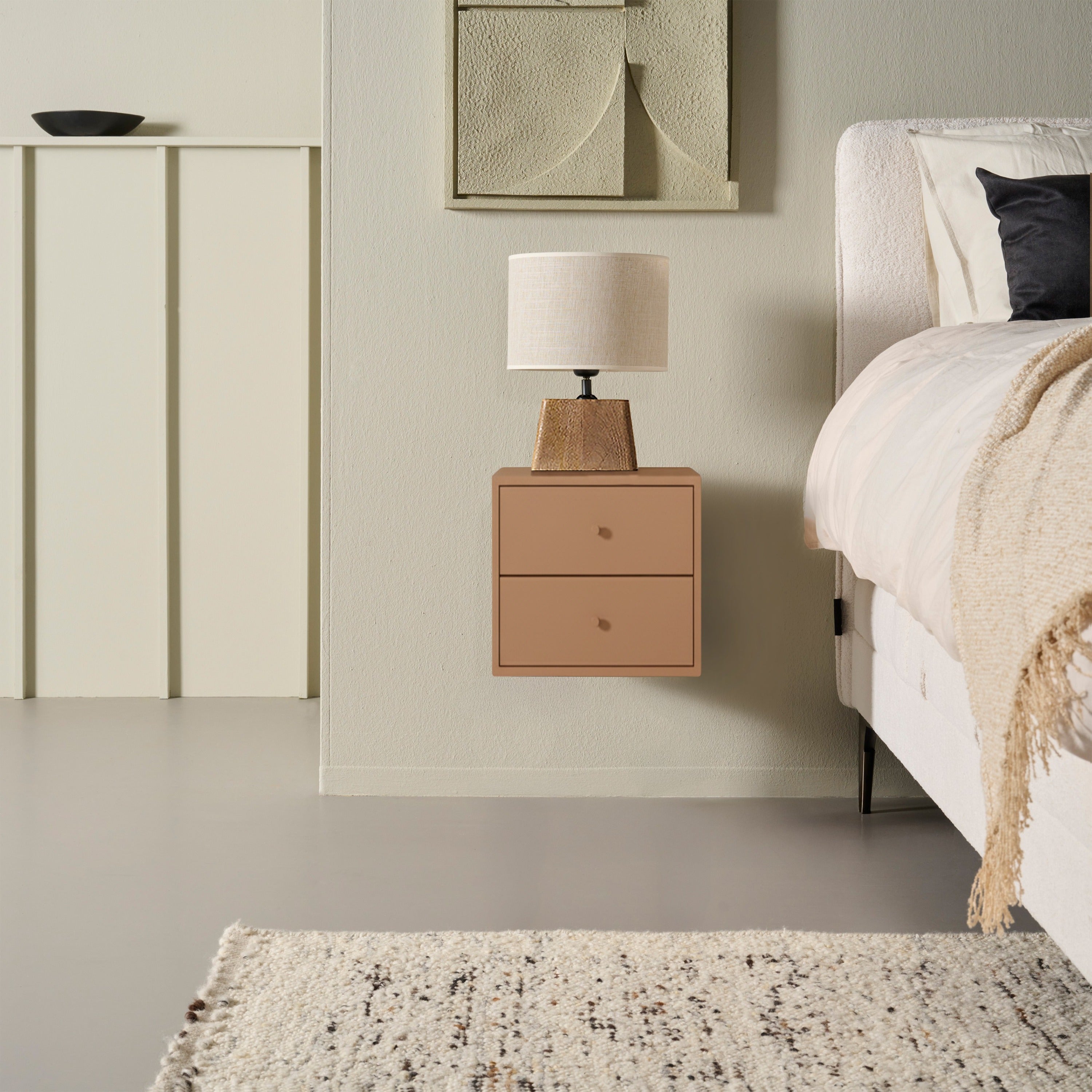 Ontdek het zwevende nachtkastje Borba, een stijlvolle en praktische aanvulling naast je bed. Dit elegante ladekastje voegt een verfijnde touch toe aan elke slaapkamer. De twee lades bieden voldoende opbergruimte voor al je essentials, zoals je telefoon, een goed boek of je bril. Het is vervaardigd van mangohout met afgeronde vorm, wat zorgt voor een moderne en tijdloze uitstraling. Deze veelzijdige look past perfect in zowel minimalistische als eclectische interieurs. Met het zwevende Borba nachtkastje creëer je een sfeervol accent in je slaapkamer. Belangrijke informatie:- afmeting 30x30x30 cm (bxhxd)