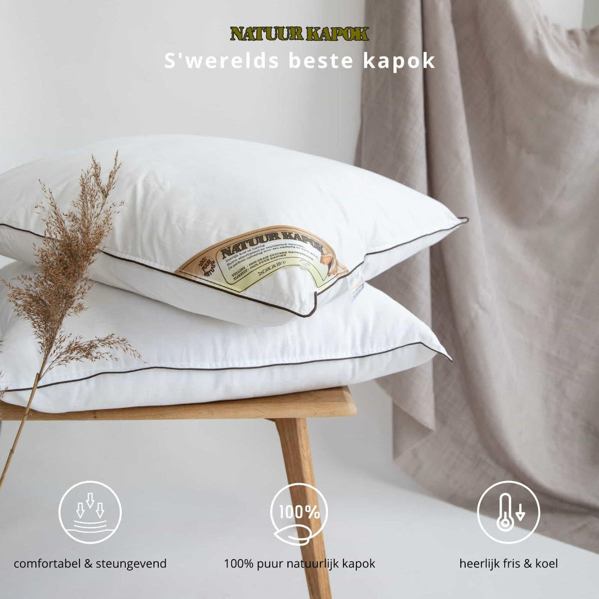 Deze luxe Kapok kussens worden geleverd in ’n ademende draagtas, waarin u het kussen stofvrij, fris en ademend opbergt.