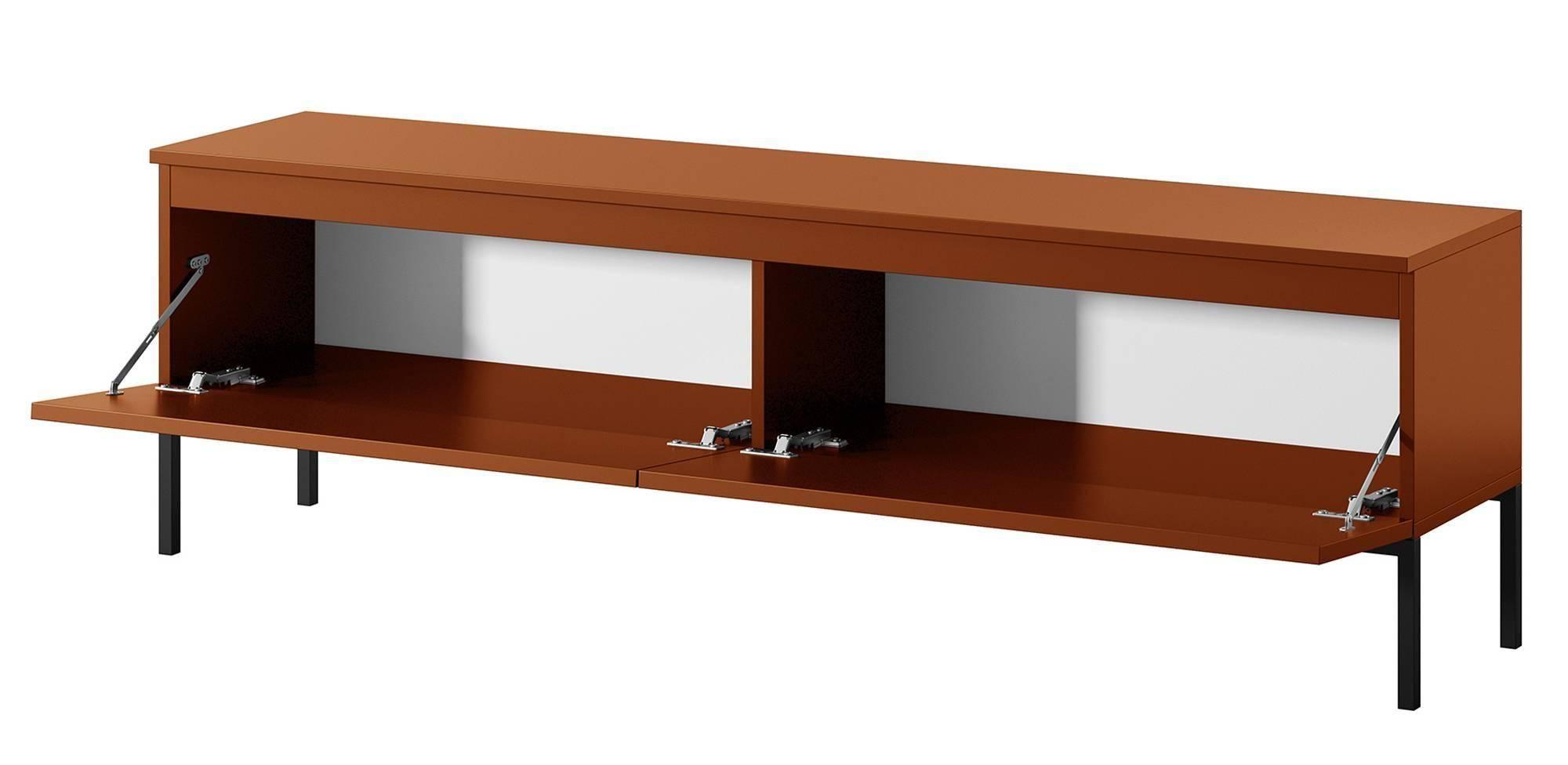 Het veelzijdige Tv-meubel Kate kenmerkt zich door haar eenvoudige vormgeving, die op een fraaie manier wordt geaccentueerd door het slanke stalen onderstel. Dit voegt een mooi visueel contrast toe aan het geheel. Tv-meubel Kate is voorzien van twee ruime opbergvakken, die perfect zijn voor het bewaren van al je extra apparatuur en accessoires. De hoge poten geven dit meubel een elegante uitstraling en zorgt dat je gemakkelijk onder het meubel schoon kan maken.