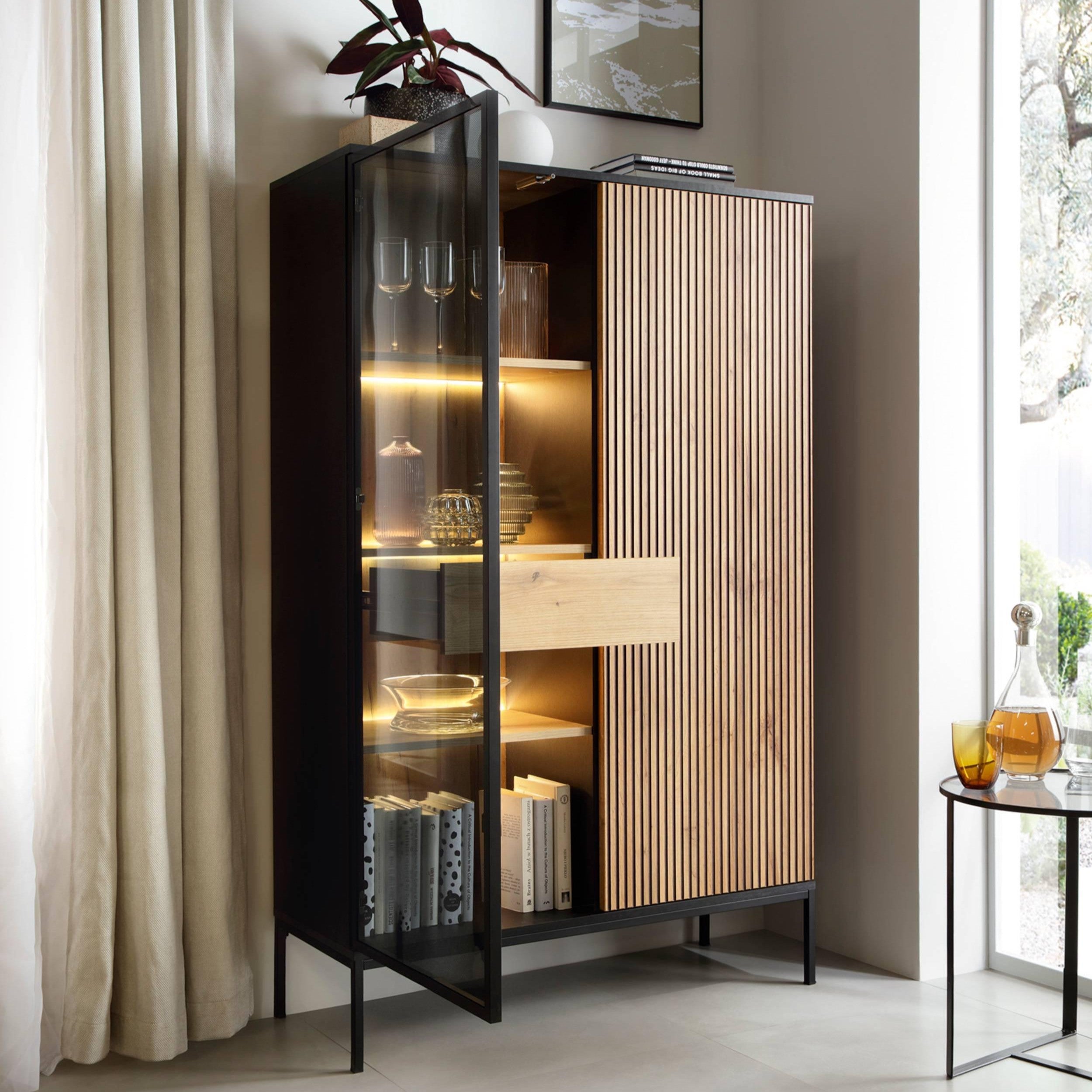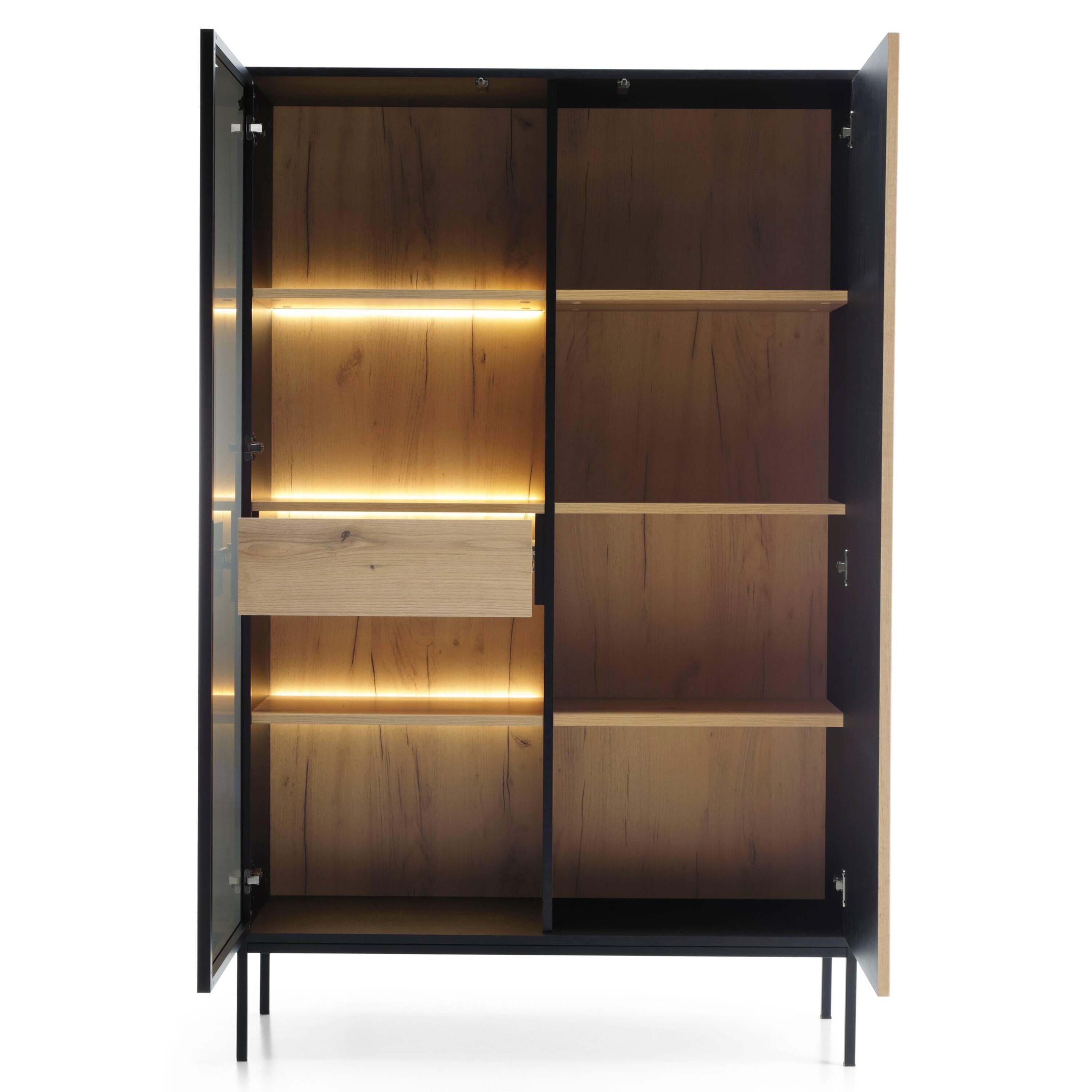 - De glazen deur geeft een mooi doorkijkje naar de planken die aan de achterkant op subtiele wijze verlicht zijn met warm wit licht