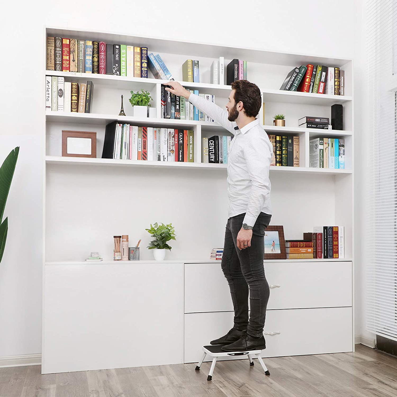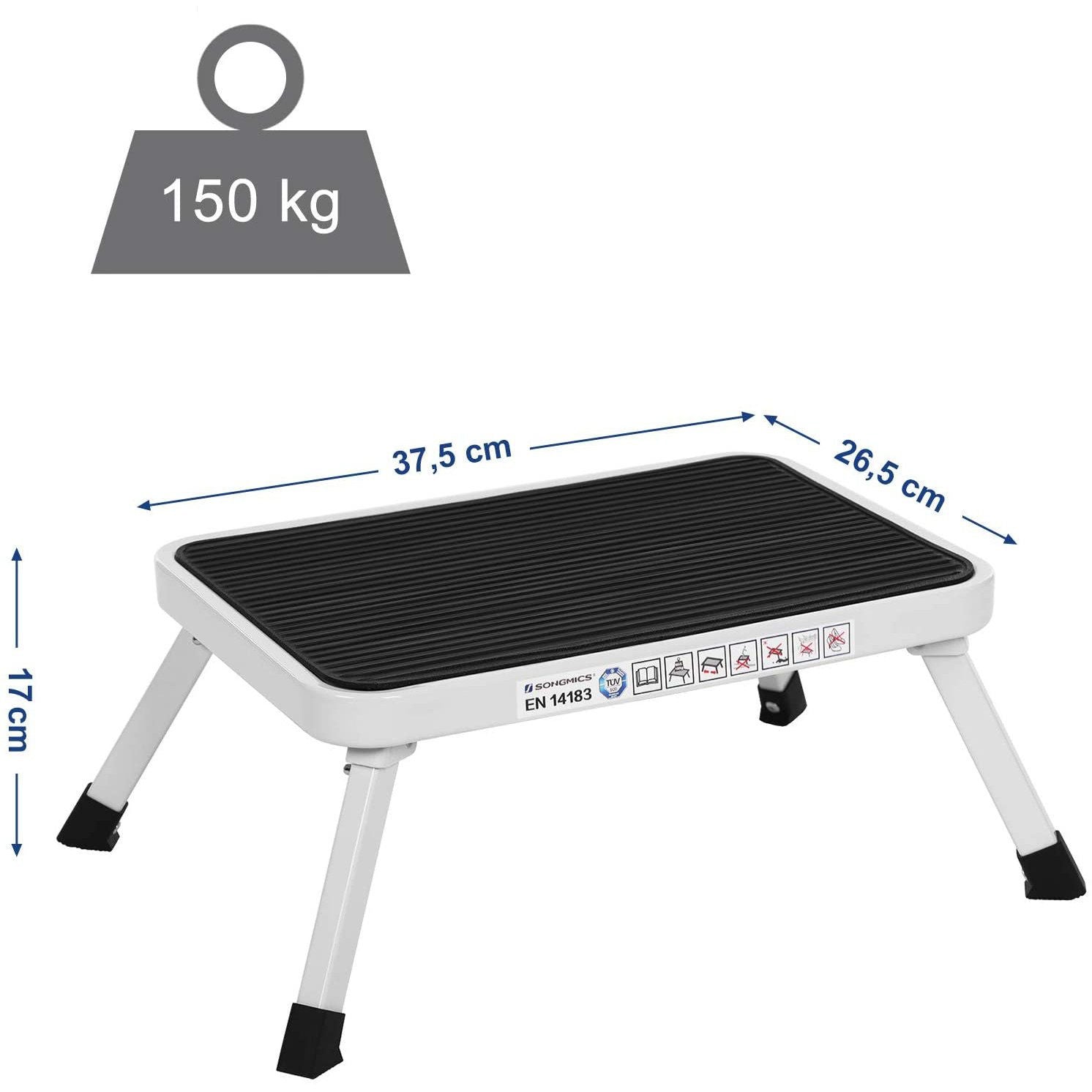 Stabiele veiligheid gaat voor: Met een groot standvlak (38 x 26 cm), een stabiel stalen buisframe en vier naar buiten gerichte poten garandeert de ladder uitstekende stabiliteit en voorkomt kantelgevaar onder belasting; klapbeveiliging met veiligheidsknopen/veerknoppen. Antislip voeten en trede: het voetstuk beschikt over zwarte, geribbelde antislipmatten die voor een veilige en stevige stand zorgen; de voeten zijn uitgerust met rubberen doppen en beschermen daardoor je vloer tegen krassen. Ruimtebesparend op te bergen en gemakkelijk te dragen – opgevouwen slechts 4 cm smal, kan zelfs in de hoeken, laden of spleten tussen wanden en kasten worden geplaatst; met één handgreep is de opklapbare trap (1,5 kg) zeer praktisch te vervoeren. Informatie over het product: - Kleur: wit - Materiaal: staal - Draagvermogen: 150 kg - Productafmetingen in gevouwen toestand: 37,5 x 4 x 26,5 cm (B x H x D) - Hoogte in uitgeklapte toestand: 17 cm - Gewicht: 1,5 kg Leveringsomvang: 1x Nancy's Barre Opstapkruk 1x Instructie