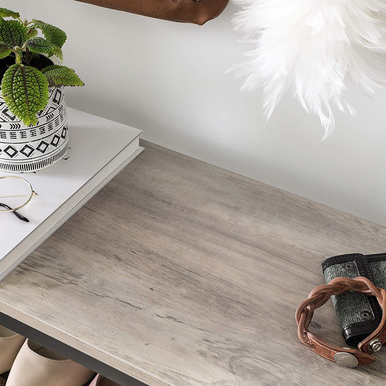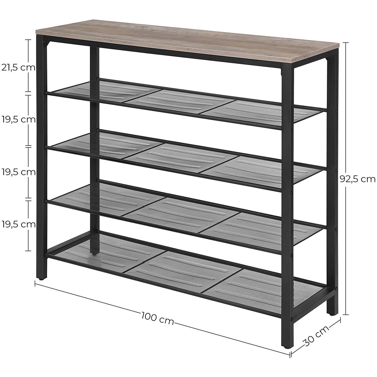 Schoenenrek met 3 bonus items: U ontvangt een rek met een stijlvol rustiek grijs oppervlak, een schoenenrek met 4 zwarte gaasplanken en een decoratief stuk voor uw ingang dat wordt gekenmerkt door de trendy industriële stijl.