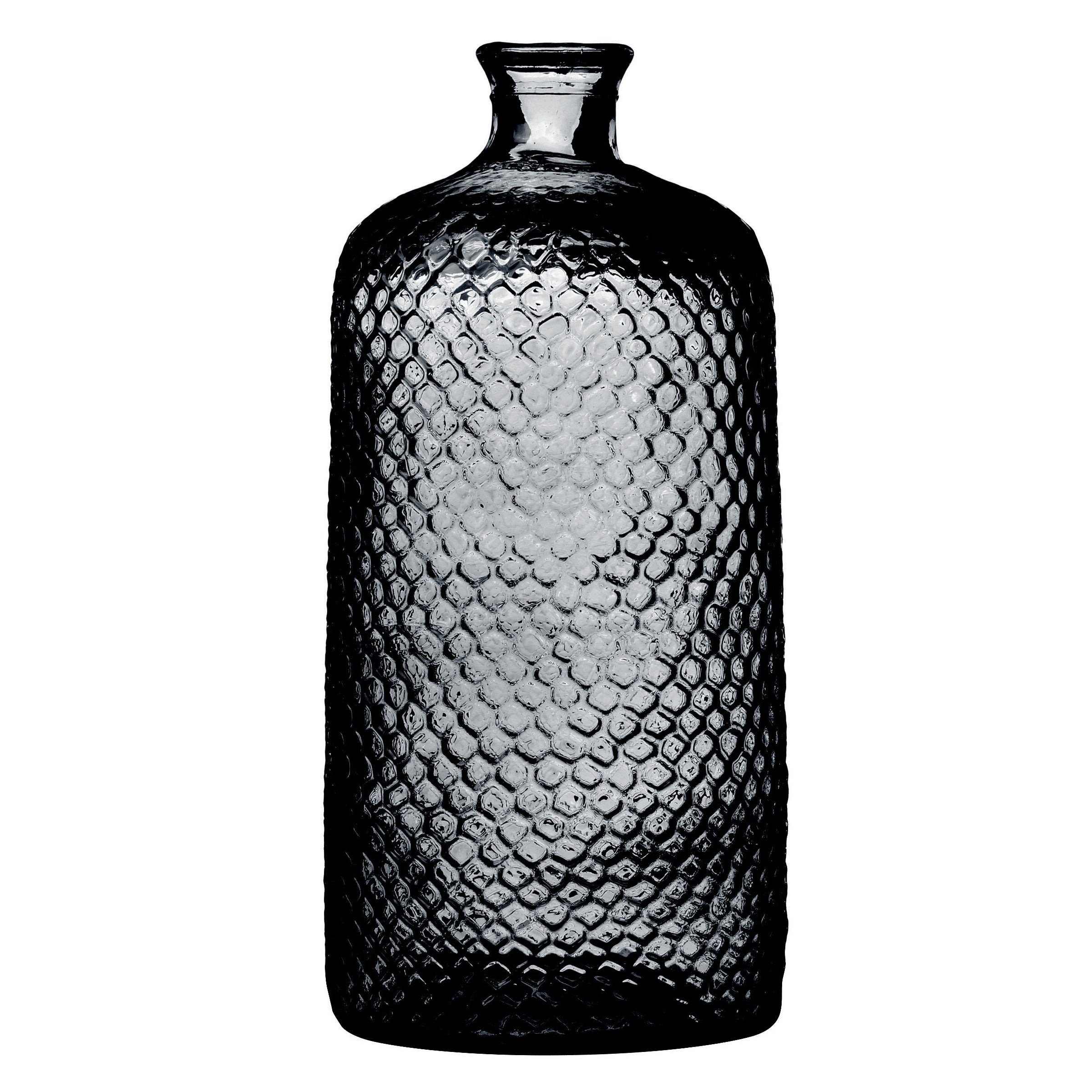 Bloemenvaas Scubs Bottle gemaakt van donkergrijs geschubt transparant gerecycled glas met smalle opening aan de bovenzijde. Formaat: 18 x 42 cm. Deze mooie stijlvolle fles vorm vaas is te gebruiken voor losse (kunst)bloemen, boeketten en/of decoratie takken. Voor gebruik binnen. De vaas heeft een mooi elegant eigen karakter. Merk: Natural Living. Inhoud: 7 liter.