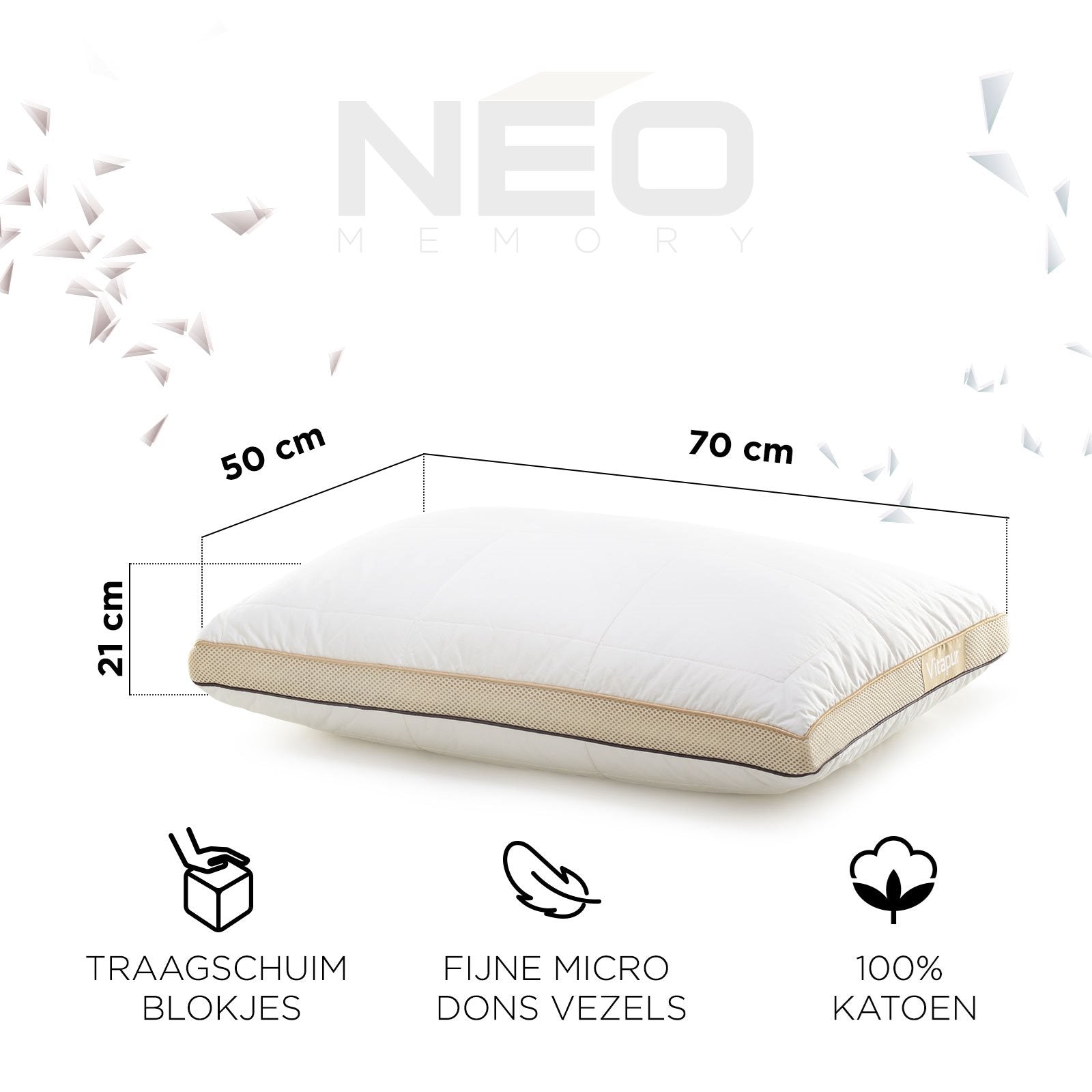 Het NEO Memory Foam Hybride kussen is een innovatie op de markt en één van de bestverkochte kussens. Het is het enige kussen dat zich perfect aanpast aan uw houdin. Door de unieke combinatie van blokjes traagschuim (Memory Foam Cubes) en ClimaSoft microvezels past het kussen zich perfect aan. Het gesneden traagschuim zorgt voor een juiste drukverdeling en een goede ondersteuning van uw nek en hoofd tijdens de slaap. Daarnaast bieden de fijne microvezels zachtheid en comfort.