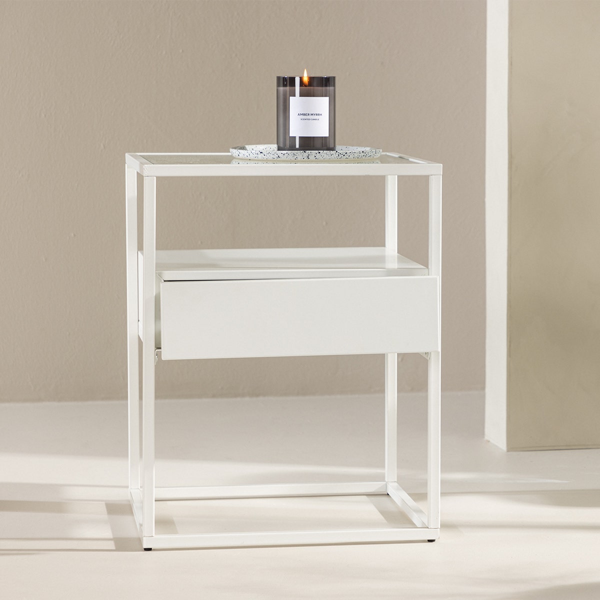Met het strakke ontwerp en de hoogwaardige materialen biedt dit bijzettafeltje niet alleen functionaliteit, maar ook stijl aan elke ruimte. De bijzettafel is gemaakt van metaal en is ontworpen met een vierkante vorm. Dankzij de slanke frameconstructie oogt de tafel erg ruimtelijk. De bijzettafel is afgewerkt met een glazen tafelblad. Deze combinatie van materialen geeft het tafeltje een moderne uitstraling. Onder het blad zit een handige lade, zodat je kleine spullen netjes uit het zicht kan houden. Ook het open vak kan je gebruiken om spullen neer te leggen. Hierdoor is de Dinand bijzettafel natuurlijk ook erg geschikt om als nachtkastje te gebruiken.