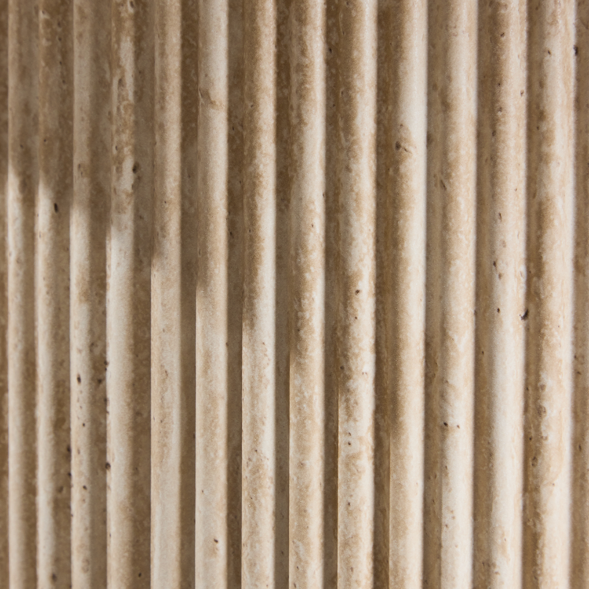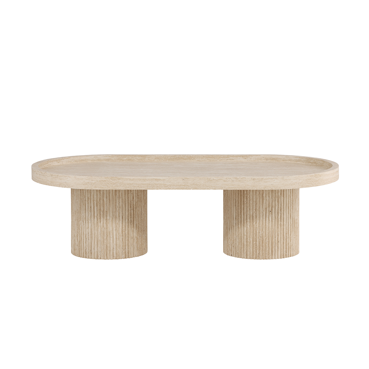 Het ovale blad in warme beige houttinten straalt rust en elegantie uit, terwijl de twee stevige cilindervormige poten met fijne ribbelstructuur de tafel een modern en verfijnd karakter geven. Dankzij de royale afmetingen heb je genoeg ruimte om te stylen met een mooi dienblad, vazen of koffietafelboeken.