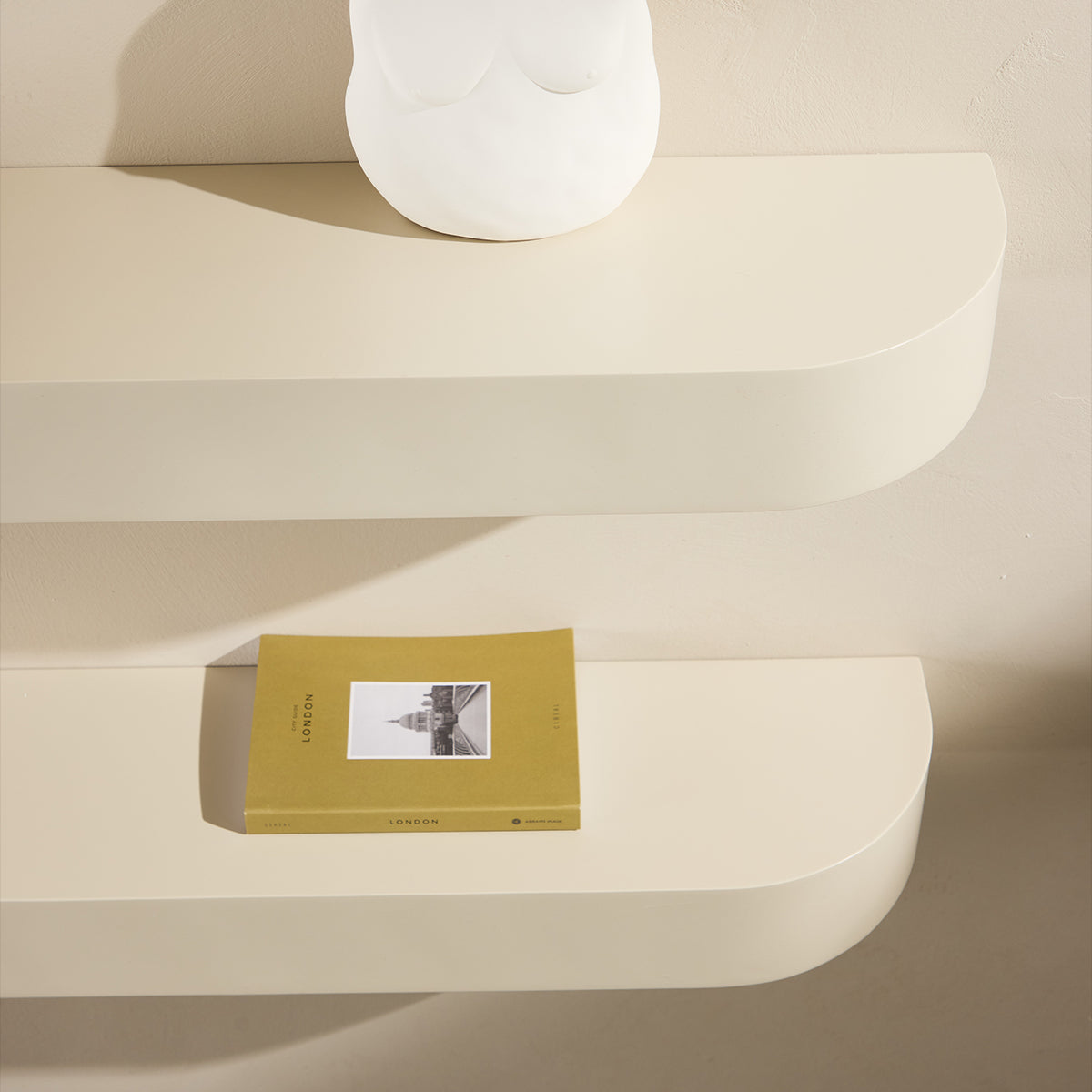 De afgeronde hoeken en zachte beige kleur geven de planken een vriendelijke en moderne uitstraling, perfect passend in een Japandi, Scandinavisch of minimalistisch interieur. De planken zijn uitgevoerd in een zwevend model, wat zorgt voor een strak en luchtig effect aan de muur. Gebruik ze om je mooiste accessoires te laten schitteren: van een vaas met verse bloemen tot fotolijstjes, boeken of kleine kunstobjecten. De neutrale kleur maakt het makkelijk om ze te combineren met verschillende materialen en kleuren, terwijl het afgeronde ontwerp zorgt voor een verfijnde afwerking. De afmetingen zijn als volgt: