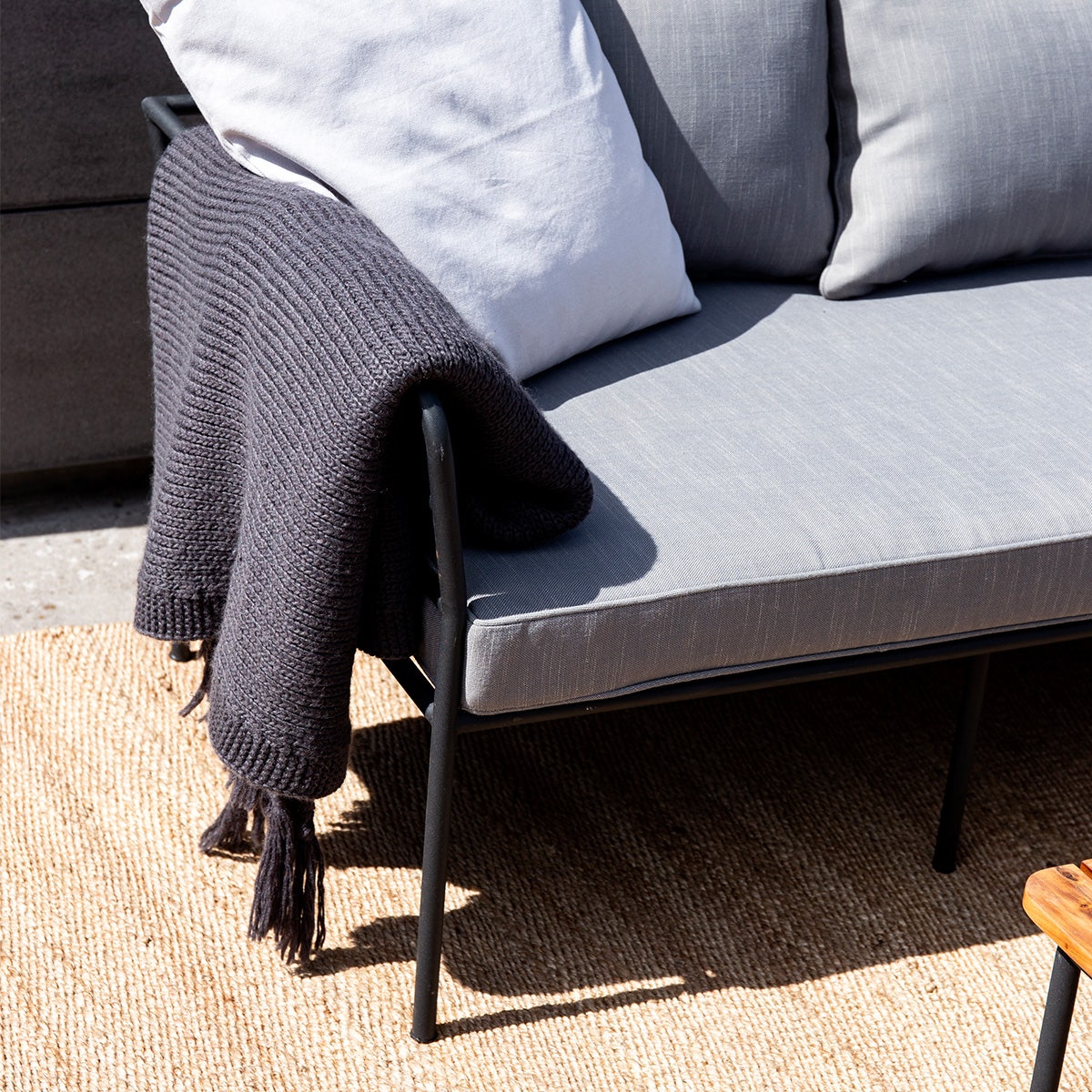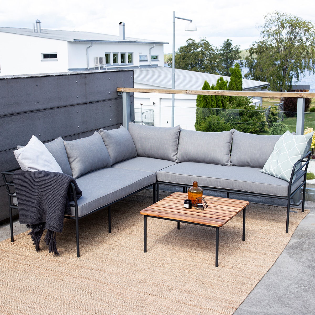 Deze tuin loungeset bestaat uit een hoekbank en een bijpassende salontafel die geschikt zijn om buiten te gebruiken. De loungebank heeft een zwart frame gemaakt van gepoedercoat staal. De tuinbank is voorzien van zitkussens met een foam vulling en grijze polyester bekleding. De tuin salontafel heeft hetzelfde zwarte stalen frame en is afgewerkt met een tafelblad van acaciahout met afgeronde hoeken. De combinatie van deze materialen en kleuren zorgt ervoor dat de Connor loungeset een stoere en industriële uitstraling heeft. Geef deze 2 delige tuin loungeset een mooi plekje op het terras en geniet van de zomerdagen in je eigen achtertuin. De afmetingen van de set zijn als volgt:
