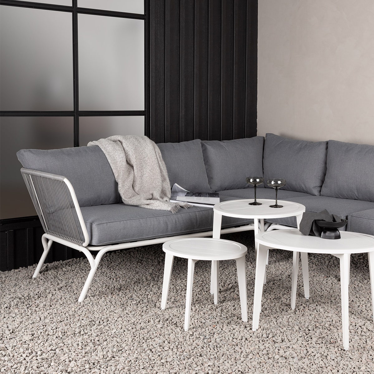 De loungeset bestaat uit een hoekbank en een set van drie tafeltjes die je zowel als salontafel en als bijzettafels in de tuin kan gebruiken. De tafeltjes en het frame van de loungebank zijn gemaakt van wit gepoedercoat aluminium, wat niet alleen de moderne uitstraling geeft, maar ook zorgt voor een langdurige bescherming tegen weersinvloeden. De afwerking van de hoekbank met polyester touw voegt een stijlvolle en verfijnde touch toe aan het design. De zachte zitkussens hebben een foam vulling en een polyester bekleding in grijze kleur. Met een royale zitruimte biedt de hoekbank plaats aan maar liefst vijf personen. De set van drie kleine ronde tafeltjes maakt de Hanne loungeset compleet. Deze tafeltjes zijn perfect voor het plaatsen van drankjes, snacks, boeken of decoratieve items.