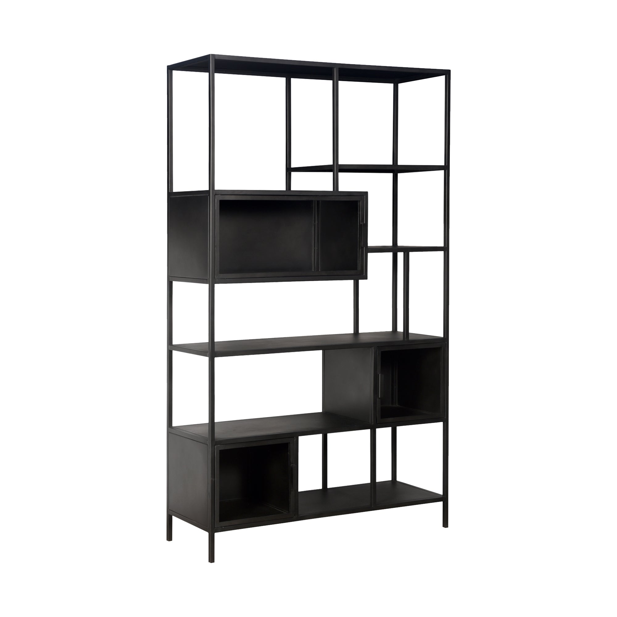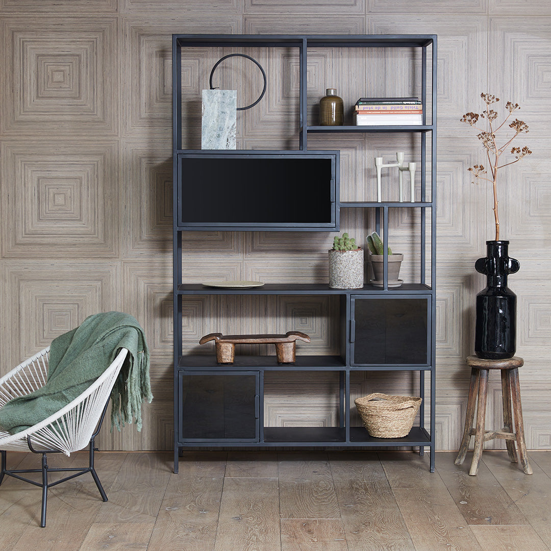 Ambachtelijk gemaakte metalen vakkenkast afgewerkt in vintage zwart. De deuren zijn voorzien van zwart rookglas.