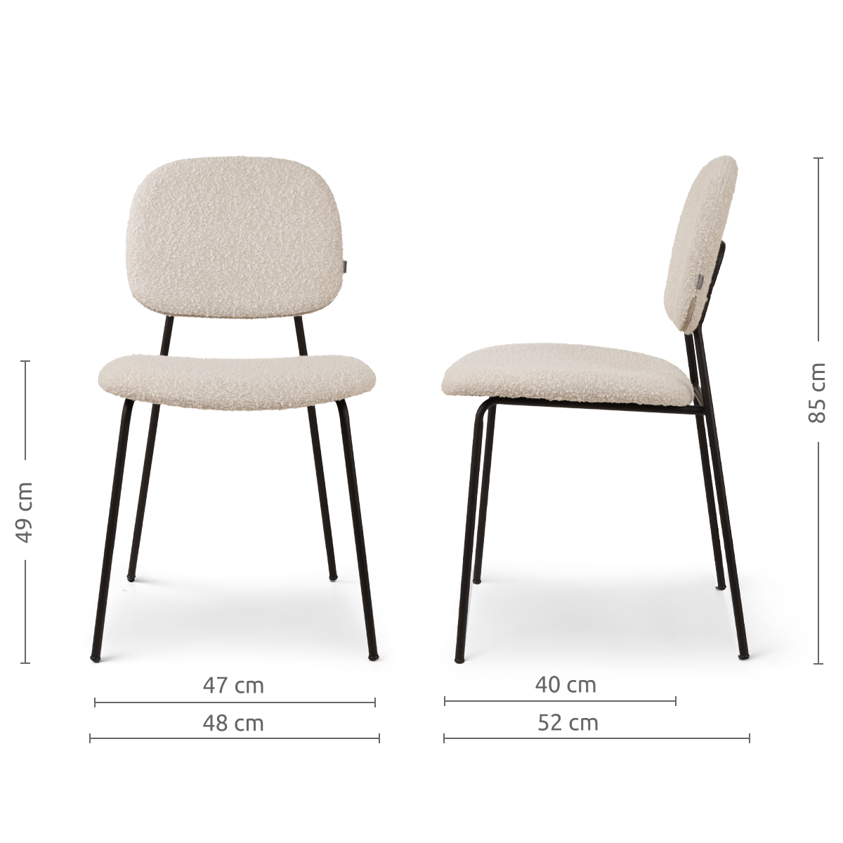 De Jasmijn eetkamerstoel is verkrijgbaar in verschillende kleuren stof. De bouclé zitting kan gecombineerd worden met zwart of grijsbeige onderstel, waardoor je de perfecte mix & match samenstelling creëert.