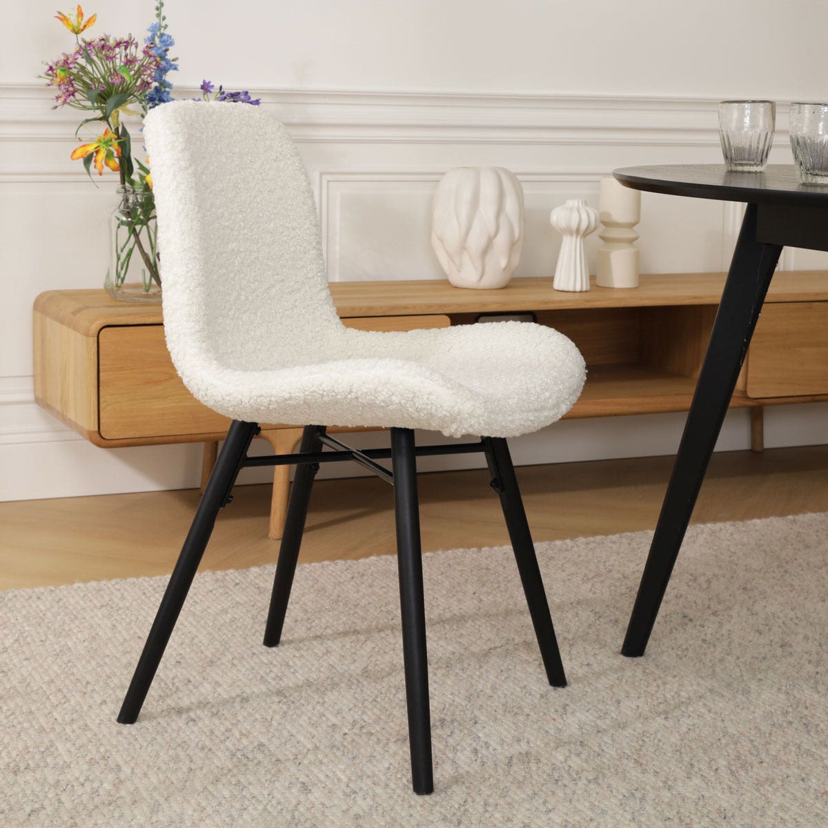 Deze eetkamerstoel combineert een prachtig houten onderstel met een elegante gestoffeerde zitting voor een gezellige uitstraling rond de eettafel. De zwarte poten van deze stoel zijn gemaakt van beukenhout en hebben een metalen kruisverbinding voor extra stabiliteit. Deze eetkamerstoel heeft een zitting van stof met een gevleugeld zitvlak, wat een zacht en comfortabel oppervlak biedt om op te zitten. Net als andere eetkamerstoelen zonder armleuningen geeft de Nena-Fé je de vrijheid je stoel gemakkelijk onder de eettafel te schuiven. Met de acht beschikbare kleuropties voor de stoffen bekleding past deze stoel in alle woonstijlen, van modern tot Scandinavisch en klassiek. Kies jouw favoriet en zet die gezellige diners maar vast in de agenda!