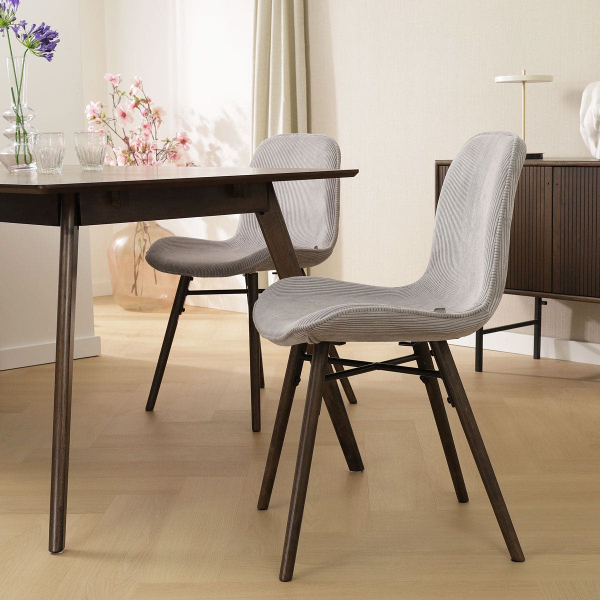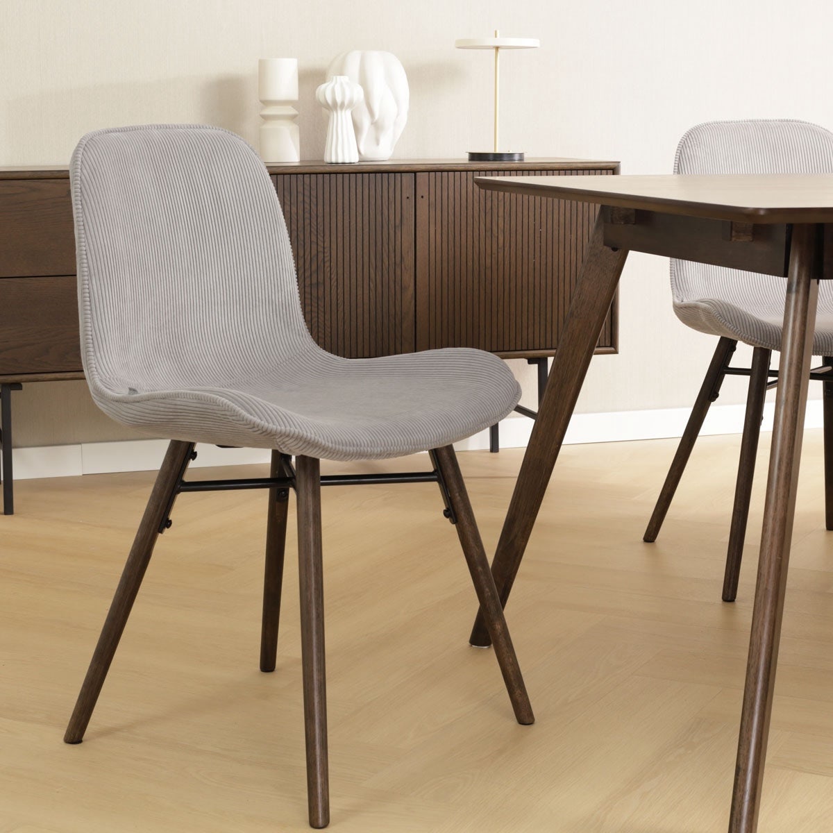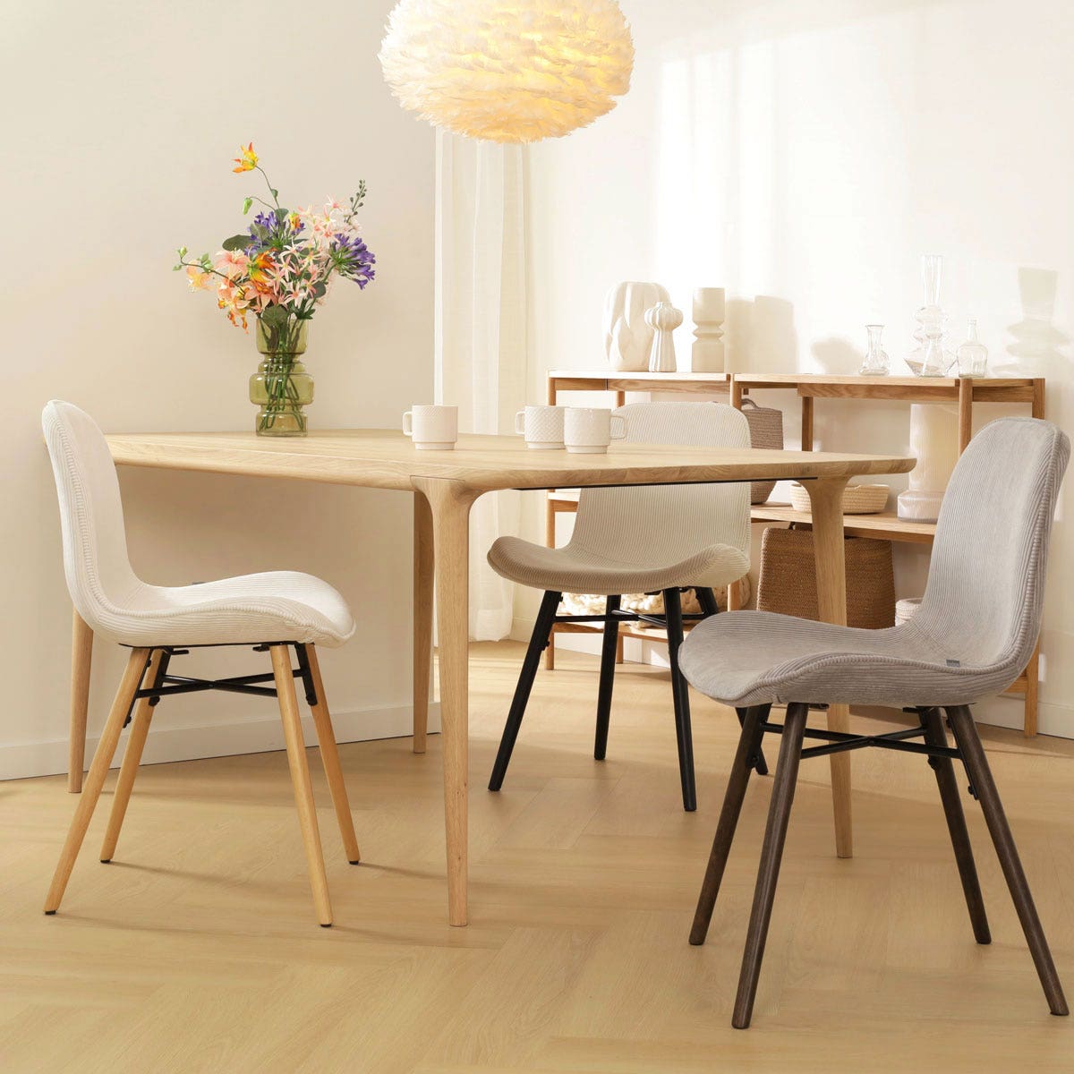 Het tijdloze design van deze eetkamerstoel combineert hout en stof op een uiterst stijlvolle manier, waardoor deze stoel moeiteloos past in zowel moderne als klassieke interieurs. Het stevige onderstel is gemaakt van hoogwaardig eikenhout, waardoor stabiliteit en duurzaamheid gegarandeerd zijn. De walnoot kleur van het hout voegt een warme en authentieke uitstraling toe aan je eetkamer. Deze eetkamerstoel heeft een zitting van stof met een gevleugeld zitvlak, wat een zacht en comfortabel oppervlak biedt om op te zitten. Net als andere eetkamerstoelen zonder armleuningen geeft de Nena-Fé je de vrijheid je stoel gemakkelijk onder de eettafel te schuiven. Kies uit een assortiment van prachtige kleuren en verschillende materialen voor de stoffen bekleding, waaronder teddystof, ribstof en bouclé.