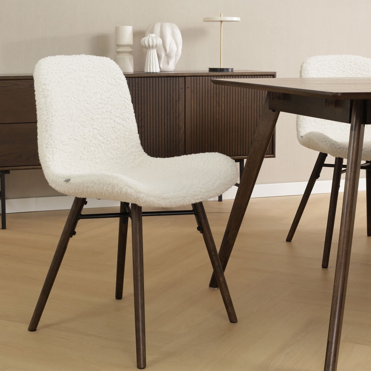 Het tijdloze design van deze set van twee eetkamerstoelen combineert hout en stof op een uiterst stijlvolle manier, waardoor deze stoelen moeiteloos passen in zowel moderne als klassieke interieurs. Het stevige onderstel is gemaakt van hoogwaardig eikenhout, waardoor stabiliteit en duurzaamheid gegarandeerd zijn. De walnoot kleur van het hout voegt een warme en authentieke uitstraling toe aan je eetkamer. Deze eetkamerstoel heeft een zitting van stof met een gevleugeld zitvlak, wat een zacht en comfortabel oppervlak biedt om op te zitten. Net als andere eetkamerstoelen zonder armleuningen geeft de Nena-Fé je de vrijheid je stoel gemakkelijk onder de eettafel te schuiven. Kies uit een assortiment van prachtige kleuren en verschillende materialen voor de stoffen bekleding, waaronder teddystof, ribstof en bouclé.