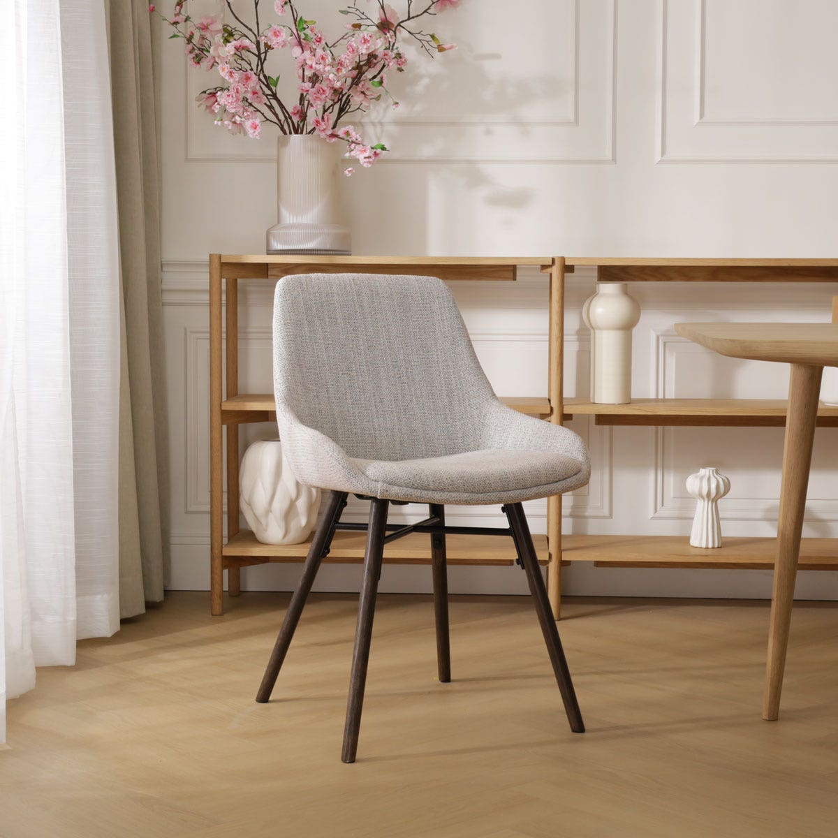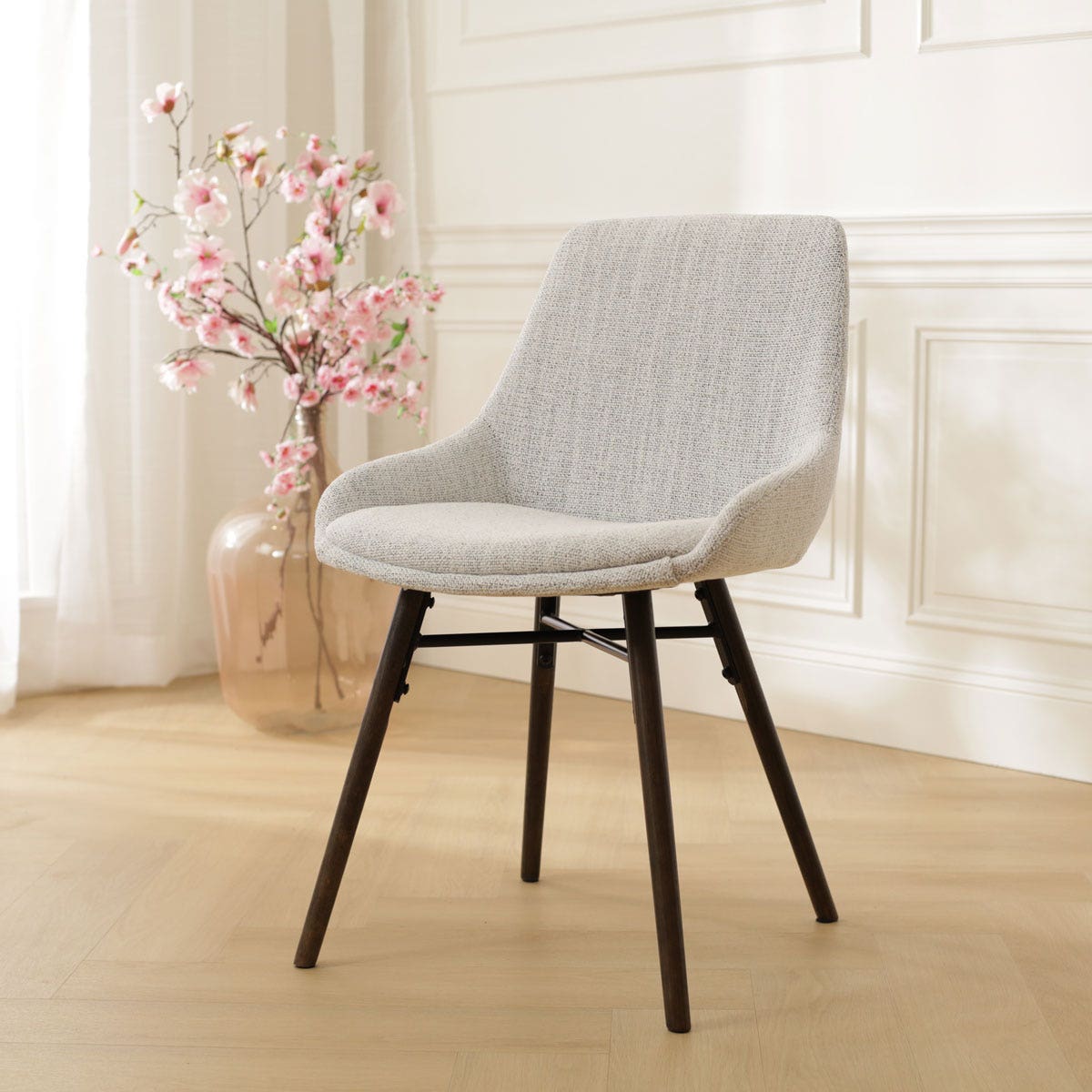 Voor wie op zoek is naar de perfecte mix van functioneel design en natuurlijke warmte in de eetkamer, is de Nena-Isa beige gemêleerde eetkamerstoel met walnoot houten poten van Nolon een uitstekende keuze.