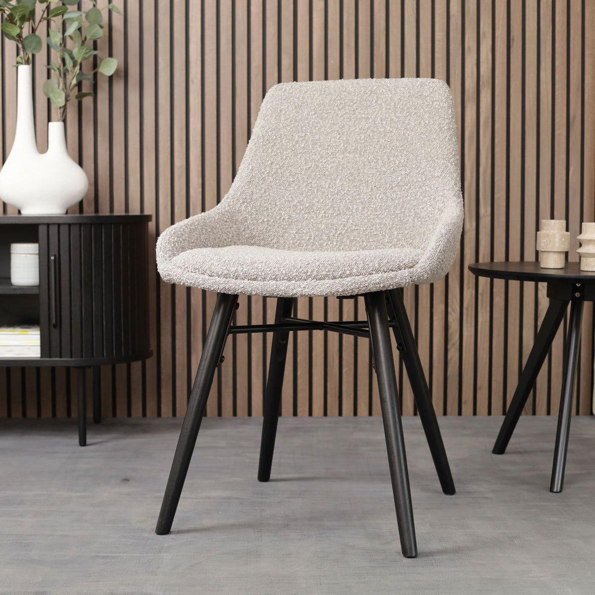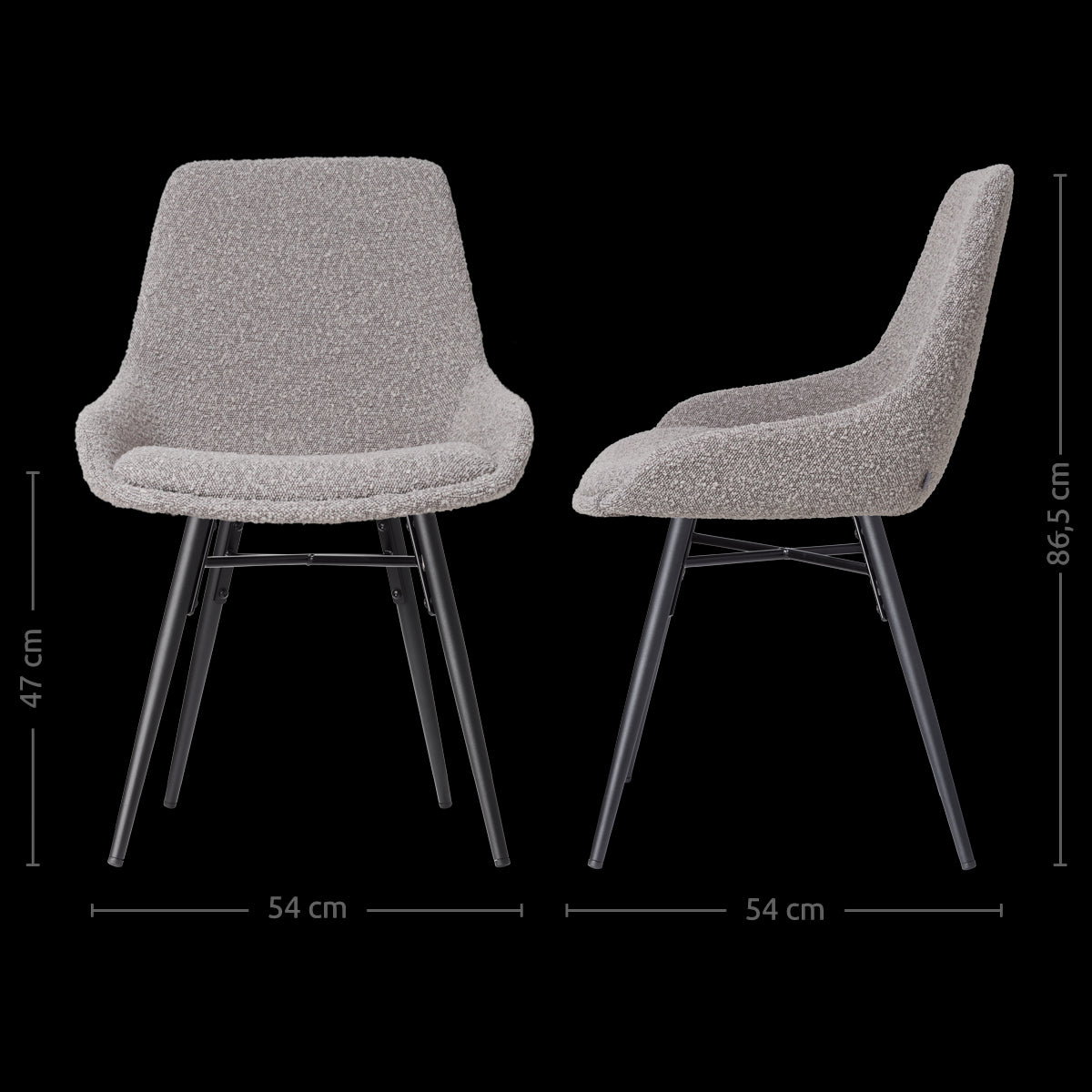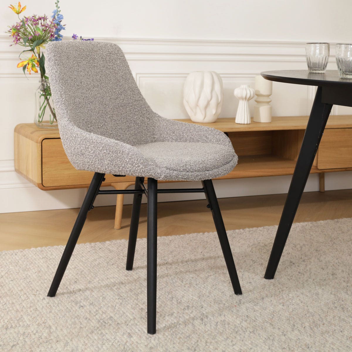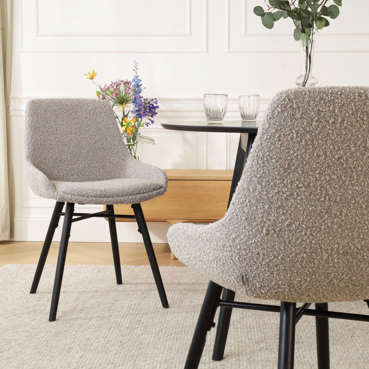 Deze eetkamerstoel combineert de landelijke charme van een zwart houten onderstel met de luxe uitstraling van een taupe bouclé bekleding. Dankzij het sterke houten binnenwerk en de ergonomische vorm biedt de stoel hoog zitcomfort en bevordert hij een actieve zithouding. De stoel is volledig gestoffeerd en heeft een zithoogte van 47 cm, waardoor hij comfortabel aan elke tafel past. Zonder armleuningen biedt deze stoel optimale bewegingsvrijheid en dankzij de zwarte beukenhouten poten met metalen kruisverbinding is hij extra stevig. De zitting heeft een zitdiepte van 40 cm, en de stoel zelf is 86,5 cm hoog. De Nena-Isa eetkamerstoel is niet alleen stijlvol maar ook praktisch, want hij is zeer eenvoudig in elkaar te zetten. De combinatie van hout en bouclé stof zorgt voor een uitnodigende uitstraling die bijdraagt aan een gezellige eetkameromgeving.