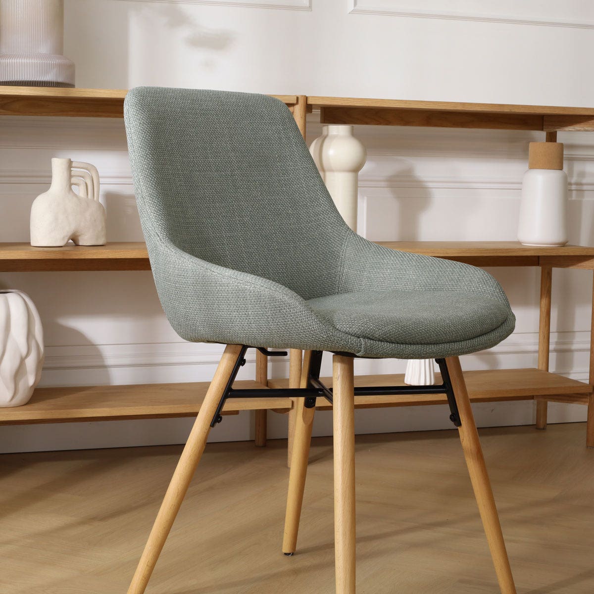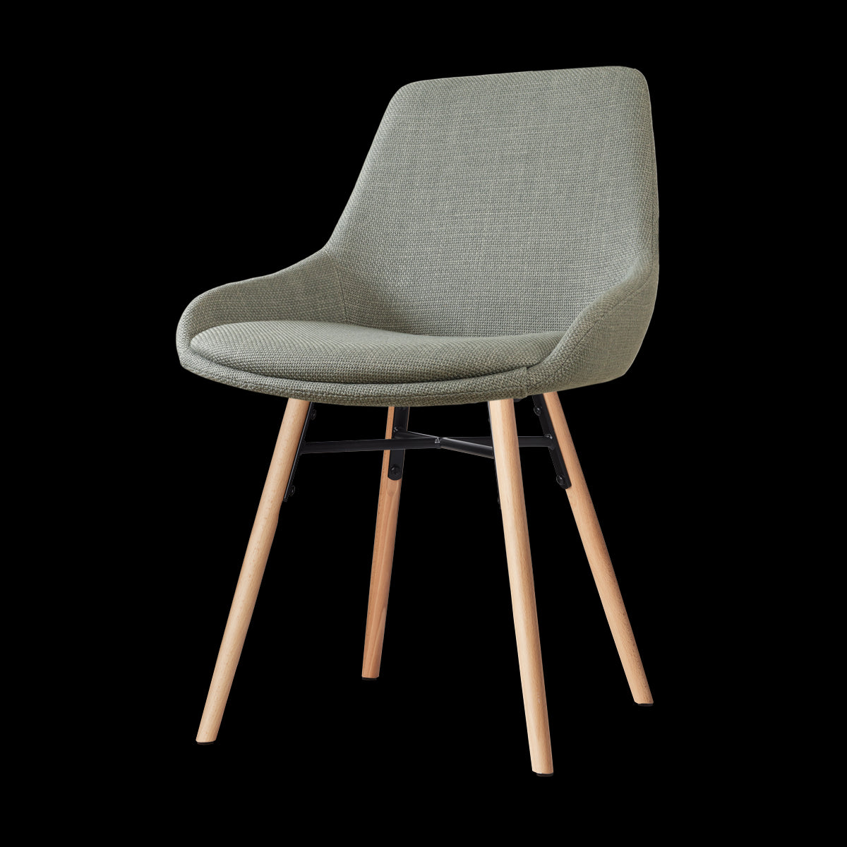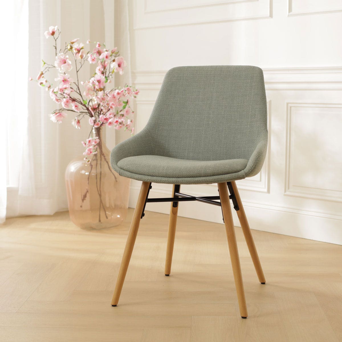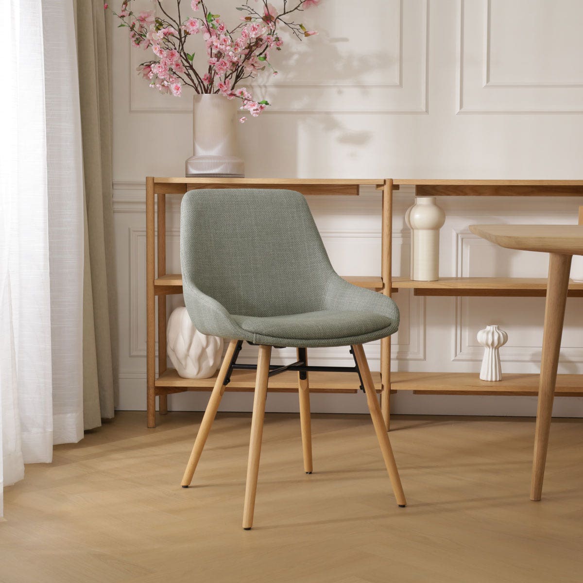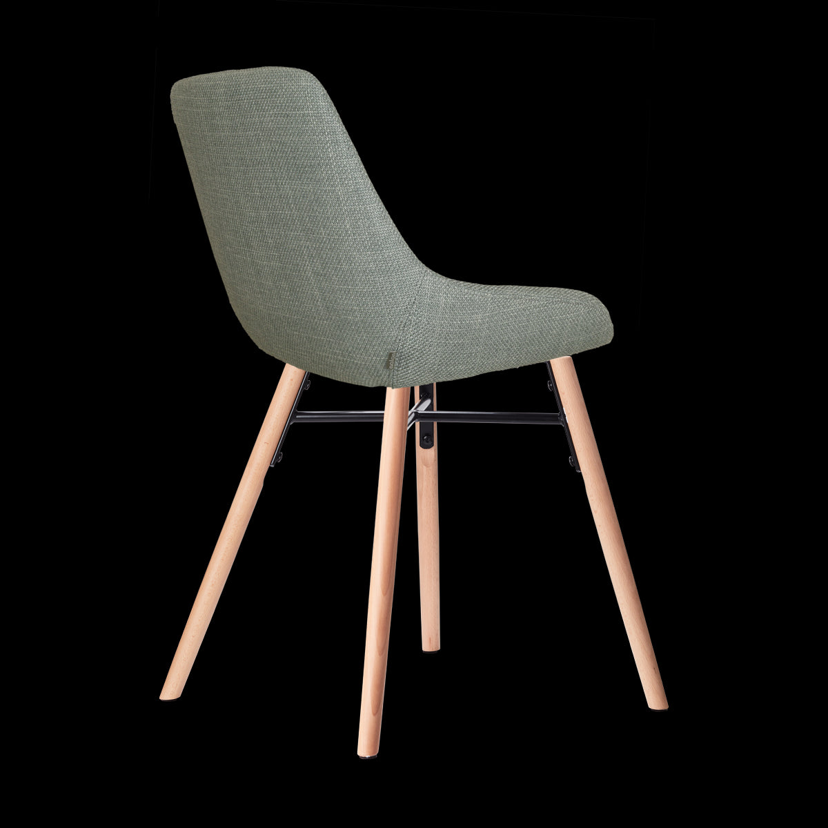 Ontdek de Nena-Isa eetkamerstoel in een stijlvolle saliegroene bekleding, met een stevig houten onderstel van het merk Nolon.